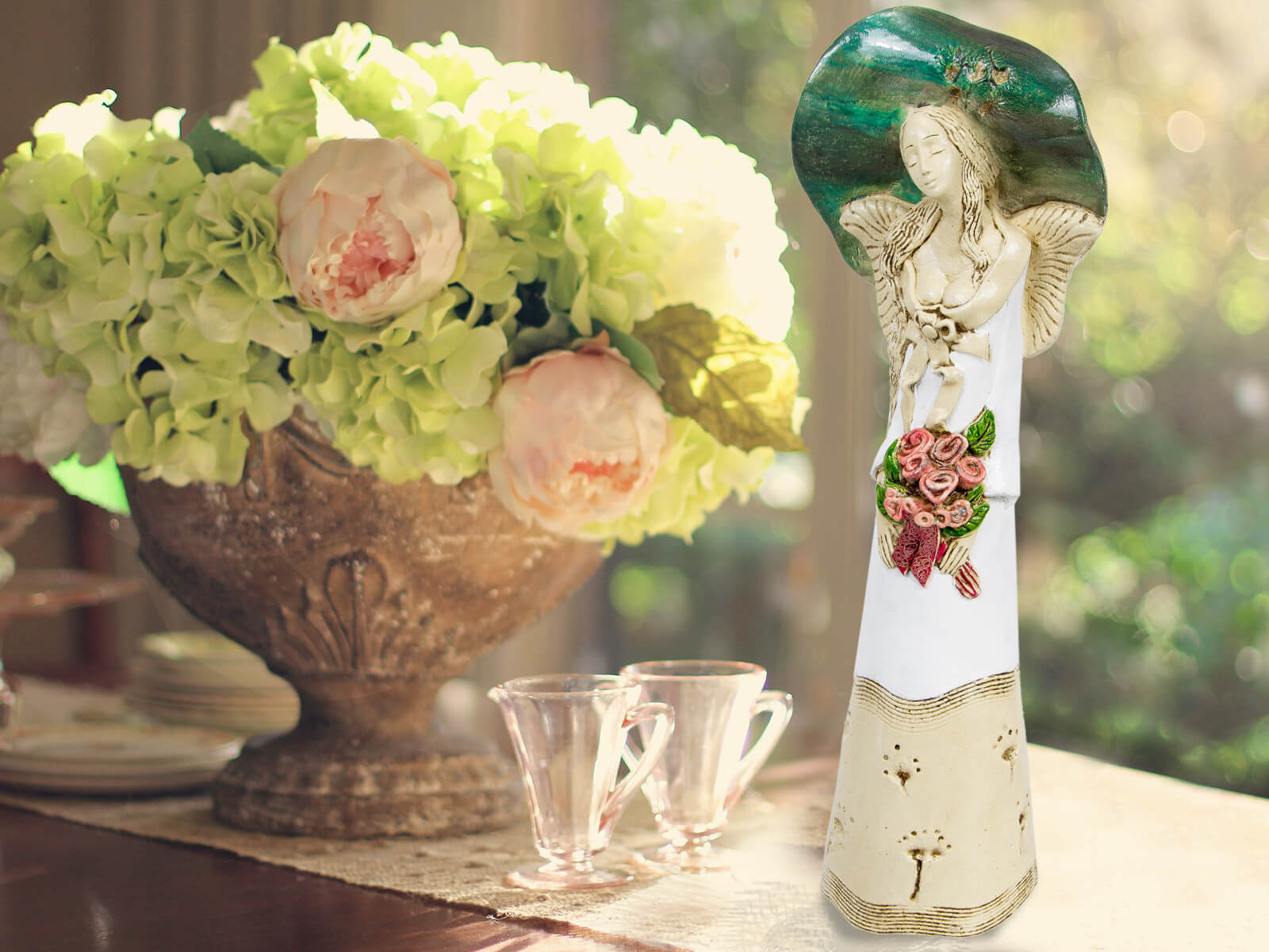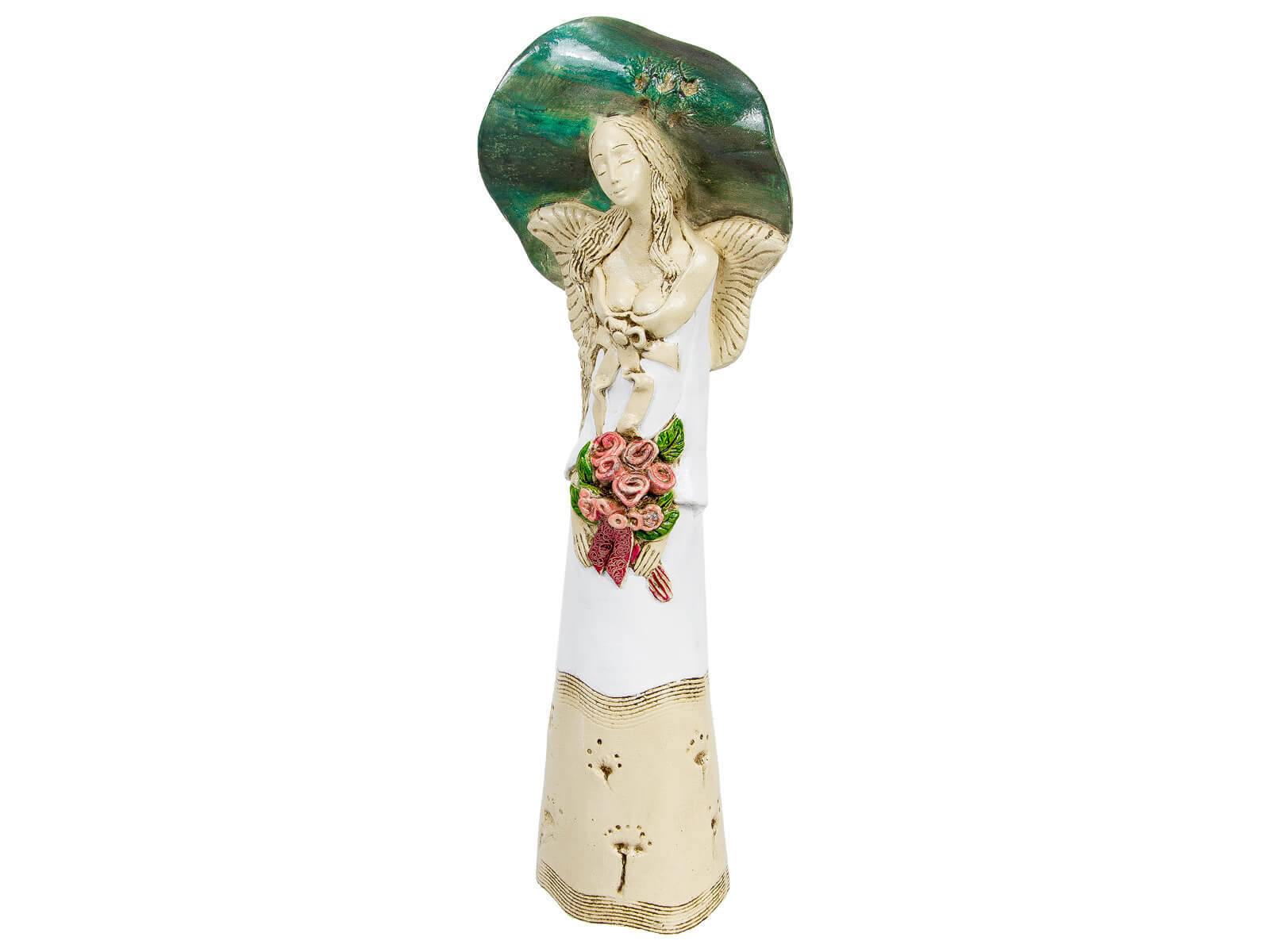 Anioł Mabel to postać o wyeksponowanych kobiecych kształtach odziana w wysmuklającą suknię w kolorach bieli i beżu. Cechą szczególną tej niezwykłej figurki jest rozłożysty kapelusz, podkreślający piękno Anioła. Trzymany w rękach bukiet kwiatów dodaje jeszcze więcej uroku. Figurka idealnie sprawdzi się jako uniwersalny prezent na różne okazje - urodziny, imieniny, Dzień Matki czy prezent pod choinkę.