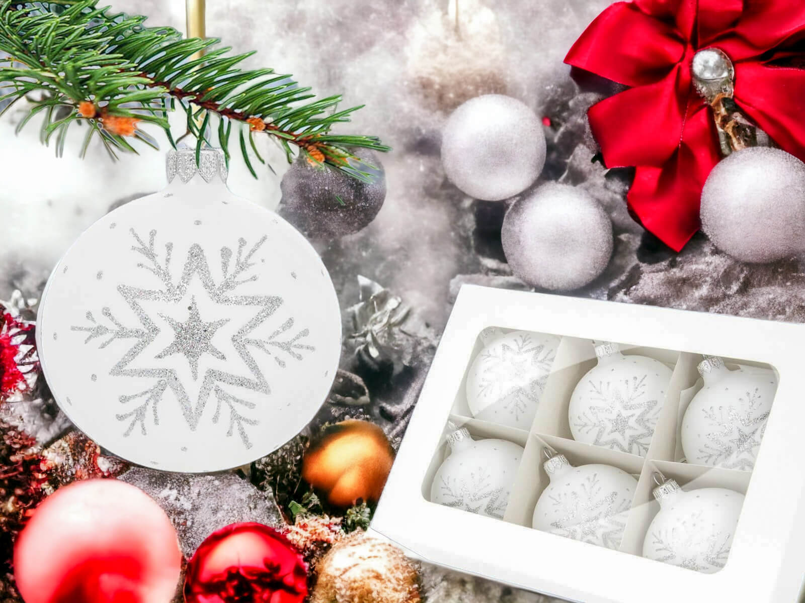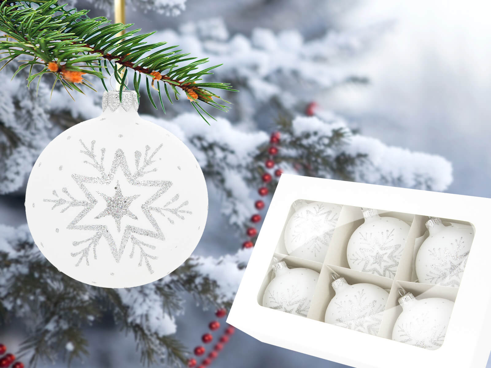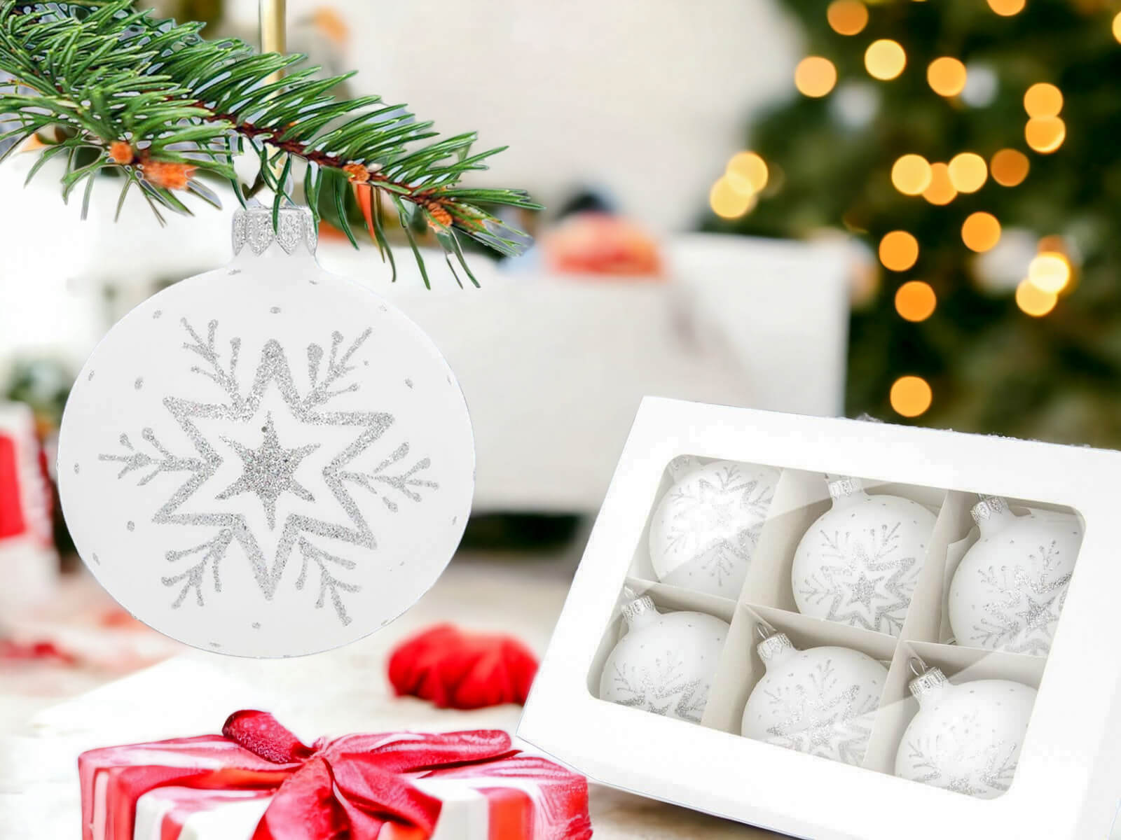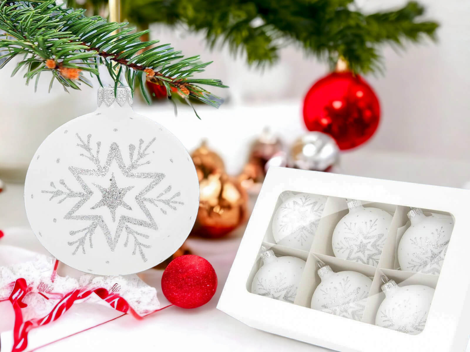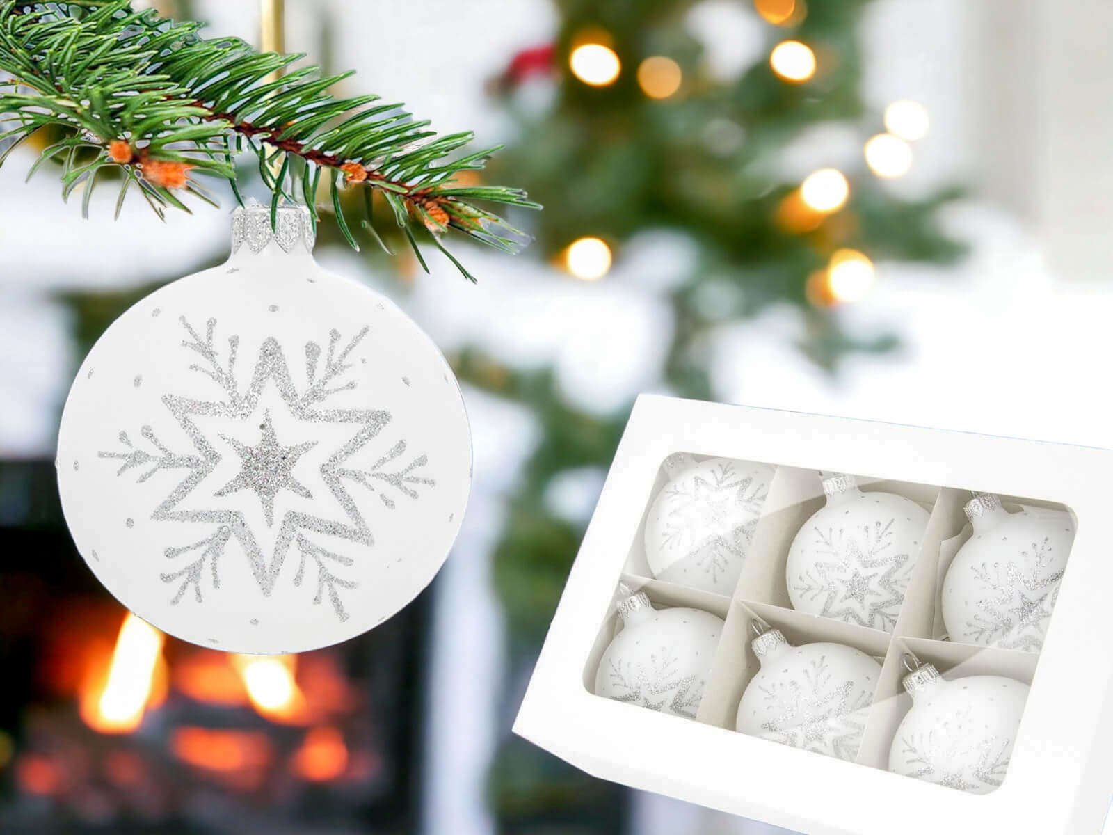 W komplecie znajduje się sześć identycznych bombek w formie gwiazdek, z których każda została ręcznie zdobiona srebrnym akcentem na białej kredzie. Srebrne zdobienia tworzą finezyjne wzory, które nadają bombkom subtelny i szlachetny wygląd. Biała kreda sprawia, że srebrne zdobienia błyszczą wyjątkowo intensywnie, tworząc piękną harmonię kontrastu.