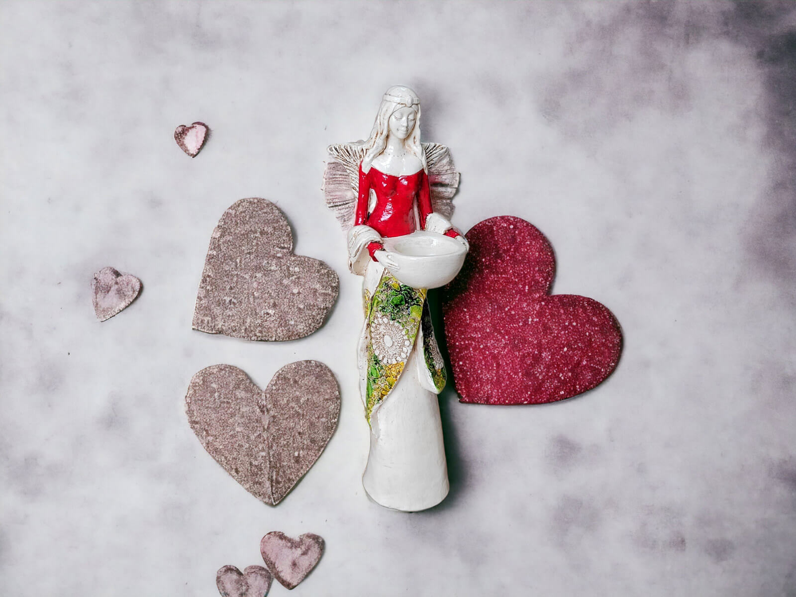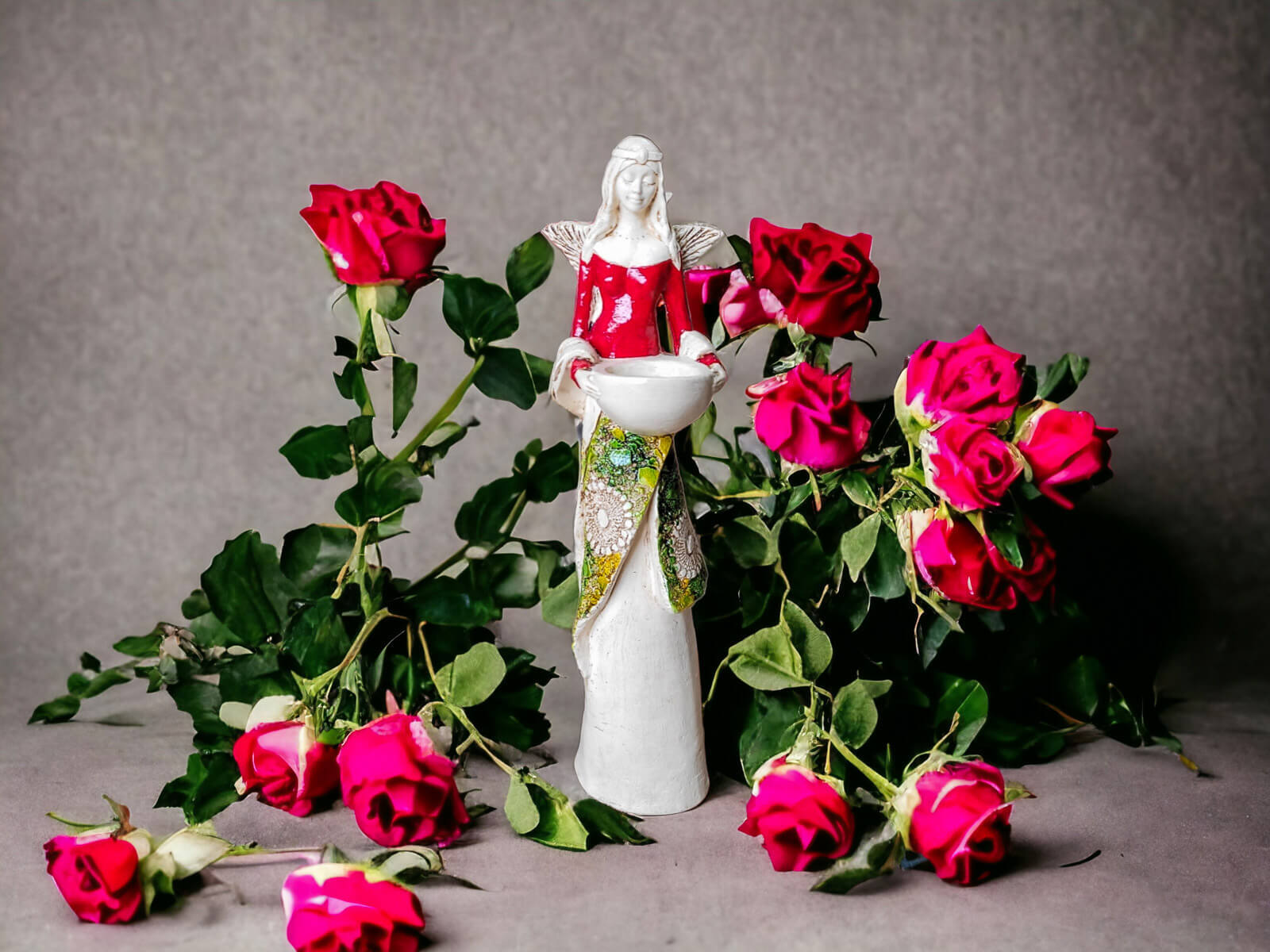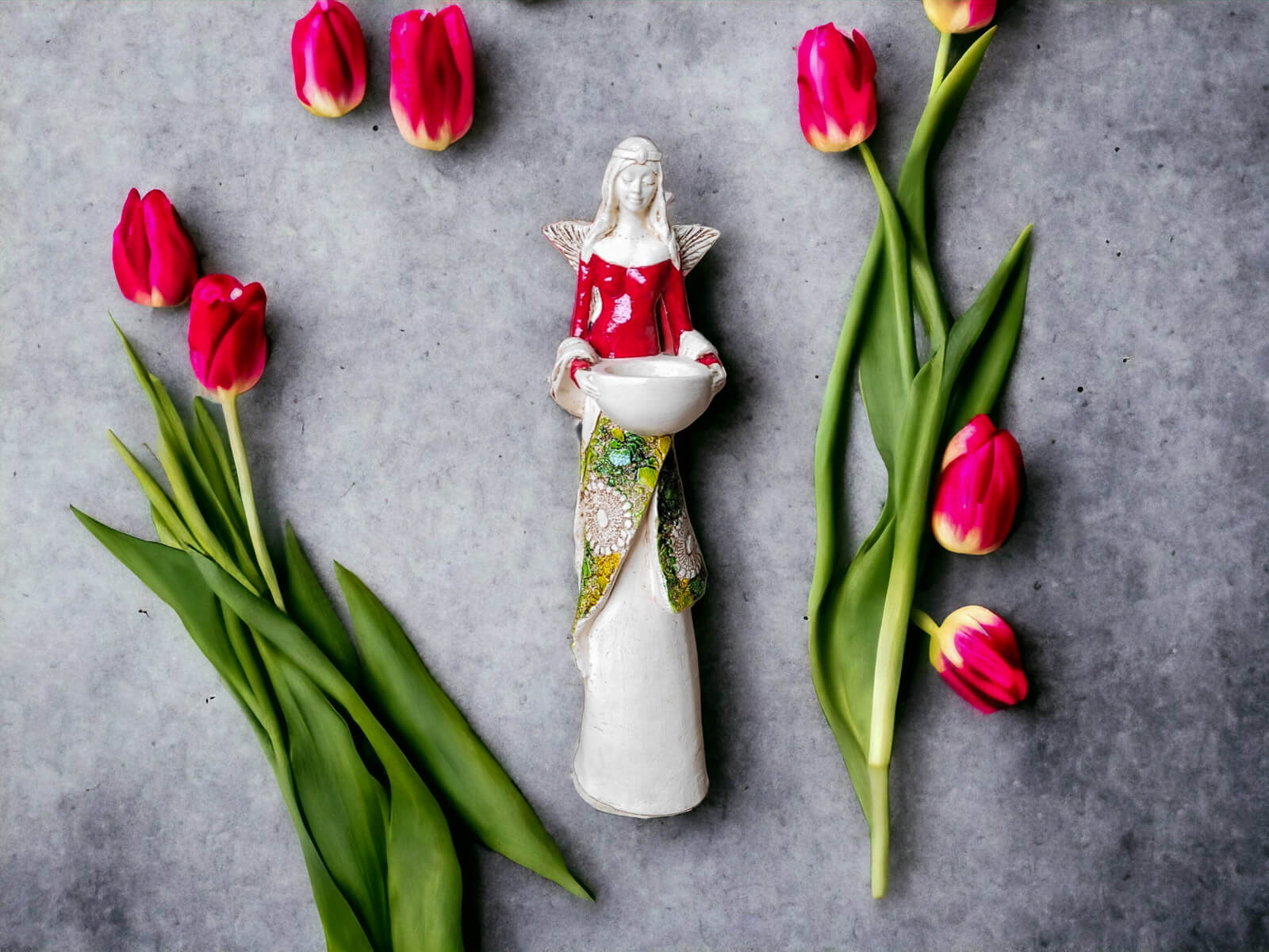 Anioł Florence w czerwonej sukni. Florence jest piękną kobietą, która ma na sobie długą suknię oraz jasne włosy sięgające za ramiona. Suknia posiada na górze dłuższą narzutkę w kolorze turkusowym z beżowymi ozdobami znajdującymi się przy jej końcu. Spod narzutki widnieje beżowa halka. Florence lubi biżuterię, ponieważ ma koralikowy naszyjnik oraz opaskę na głowie z okrągłą ozdobą. Jej skrzydła są małej wielkości uniesione do góry. W rękach trzyma wazę, do której można włożyć małą świeczkę i sprawić romantyczny klimat. Figurka wykonana jest z gipsu ręcznej produkcji. Należy do figurek stojących, dzięki czemu można ją gdziekolwiek postawić. Niezależnie od miejsca na pewno będzie przyciągać każdego uwagę. Anioł Florence idealnie nadaje się na prezent dla kobiety lub babci.