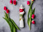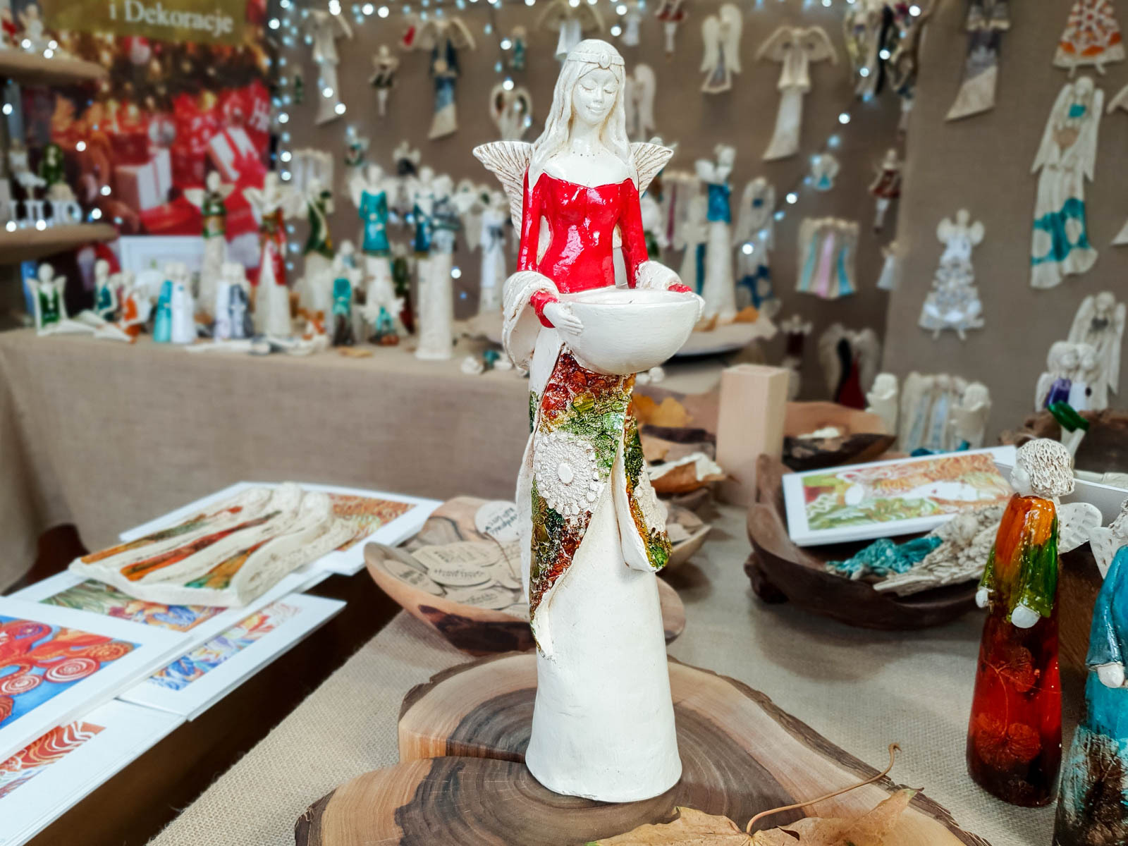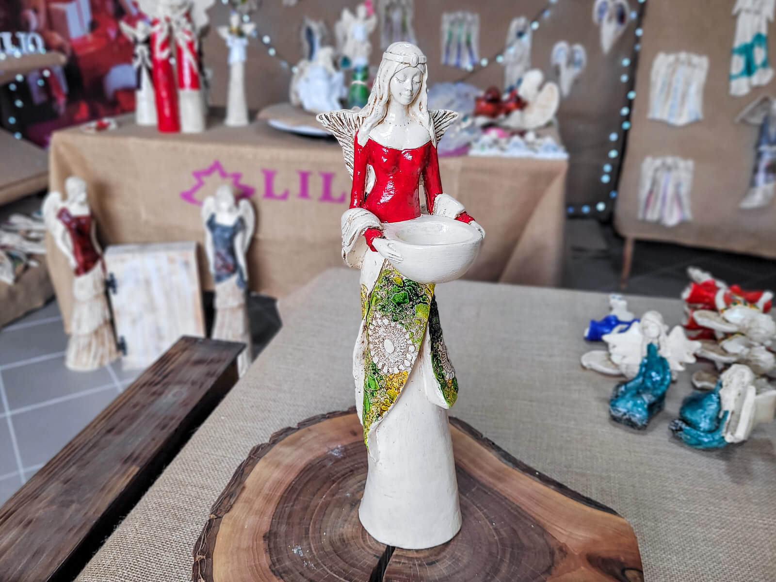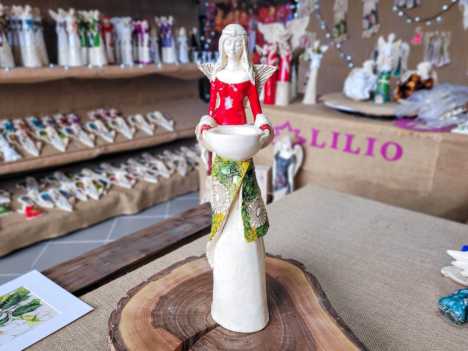 Anioł Florence w czerwonej sukni. Florence jest piękną kobietą, która ma na sobie długą suknię oraz jasne włosy sięgające za ramiona. Suknia posiada na górze dłuższą narzutkę w kolorze turkusowym z beżowymi ozdobami znajdującymi się przy jej końcu. Spod narzutki widnieje beżowa halka. Florence lubi biżuterię, ponieważ ma koralikowy naszyjnik oraz opaskę na głowie z okrągłą ozdobą. Jej skrzydła są małej wielkości uniesione do góry. W rękach trzyma wazę, do której można włożyć małą świeczkę i sprawić romantyczny klimat. Figurka wykonana jest z gipsu ręcznej produkcji. Należy do figurek stojących, dzięki czemu można ją gdziekolwiek postawić. Niezależnie od miejsca na pewno będzie przyciągać każdego uwagę. Anioł Florence idealnie nadaje się na prezent dla kobiety lub babci.