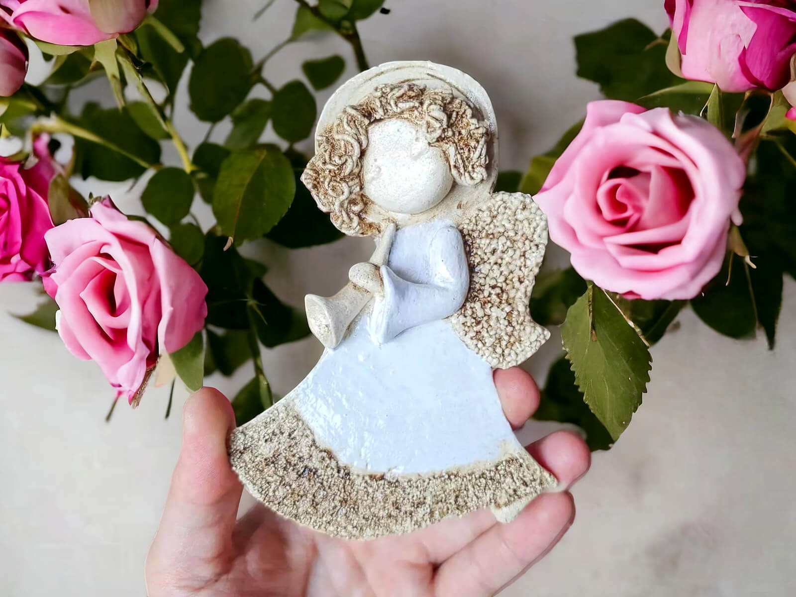 Liolinka z trąbką to mała dziewczynka ubrana w białą sukienkę. W swoich małych rączkach trzyma trąbkę, na której gra cudne melodie. Jej włosy są jasnego koloru, które zdobi aureola. Z tyłu ma małe, złote skrzydła. Figurka jest wykonana ręcznie z jak największą dokładnością. Może służyć jako dekoracja lub prezent dla dziecka.