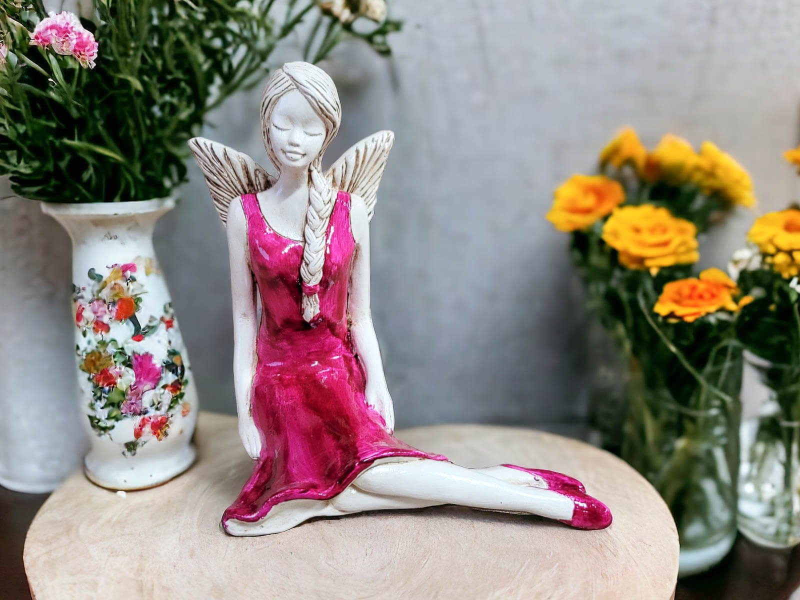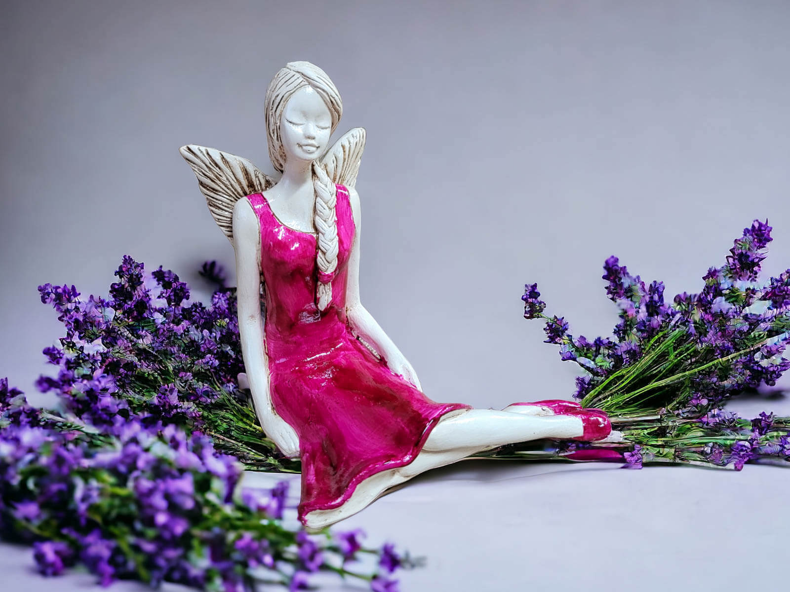 Anioł Matilda w kolorze jasno fioletowym to ręcznie wykonana figurka gipsowa. Matilda jest skromną, delikatna dziewczyną. Lubi naturę, dlatego codziennie wybiera się w ustronne miejsca na odpoczynek. Każdy ją może spotkać siedzącą na łące wśród polnych kwiatów. Jest ubrana w zwiewną, fioletową sukienkę. Włosy ma splecione w warkocz. Jest doskonałym prezentem dla dziewczynek i kobiet. Świetnie wkomponuje się w każde wnętrze jako zwracający uwagę akcent.