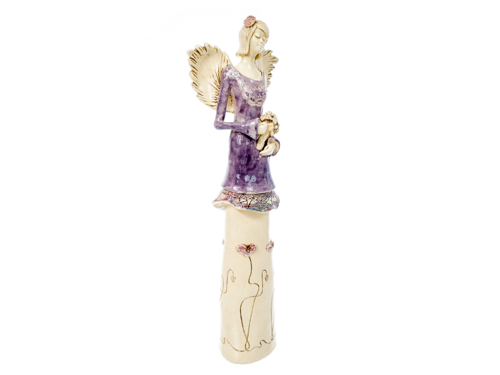 Anioł Mia to postać o nieprzeciętnej subtelności, lecz w tej wersji kolorystycznej jest o wiele ciekawsza. Bowiem, jej suknia jest w subtelnym jasnym fiolecie, co nadaje figurze spokoju i delikatności. Anioł jest dość sporych rozmiarów, a wysokość sięgająca czterdziestu centymetrów pozwala na umieszczenie figury w dowolnym miejscu w mieszkaniu, na pewno zostanie zauważona. Mia będzie się również pięknie komponować wśród innych dekoracji w salonie.