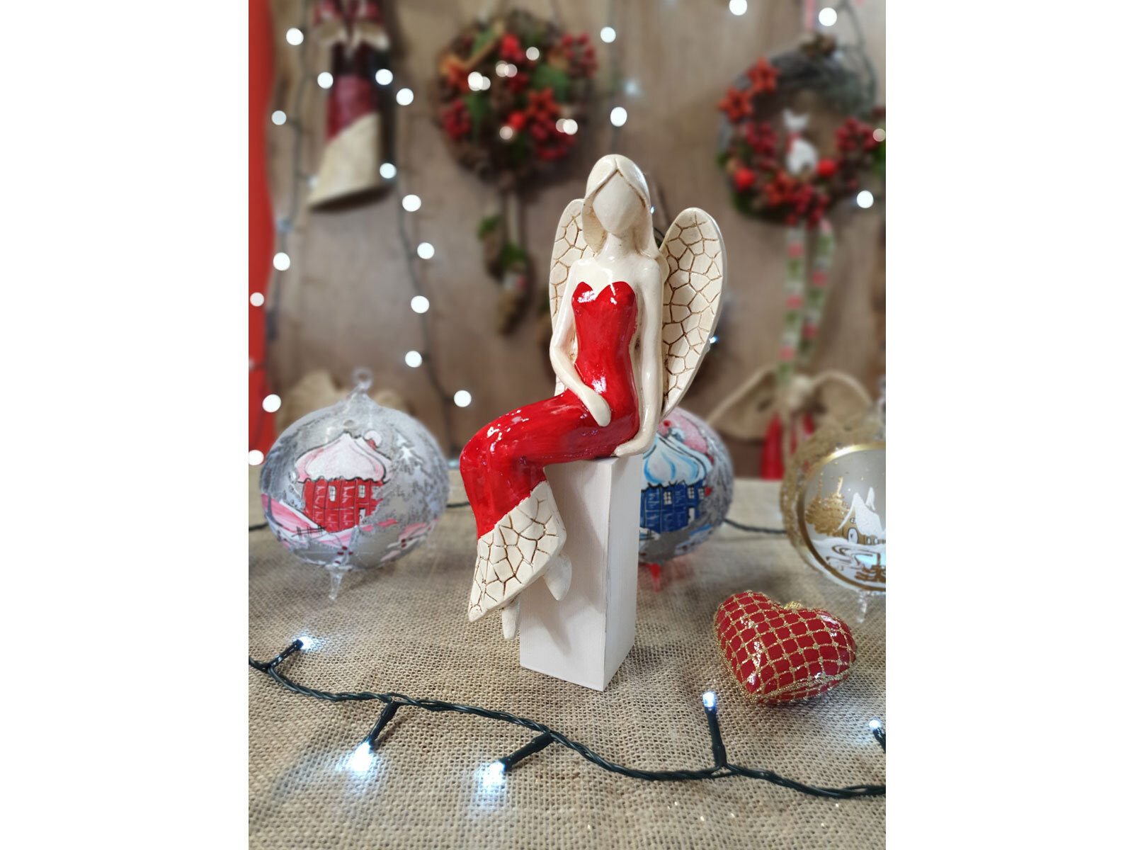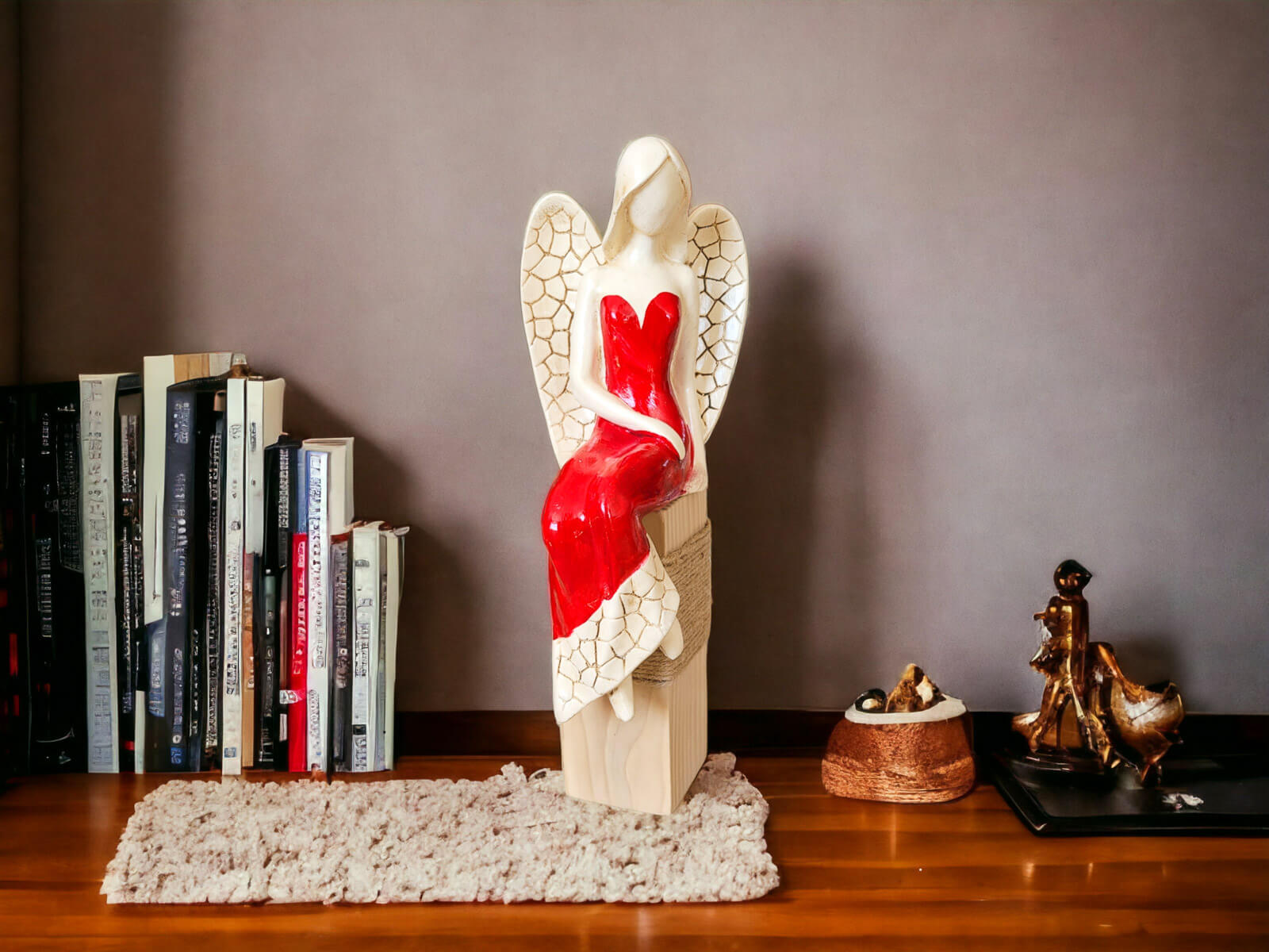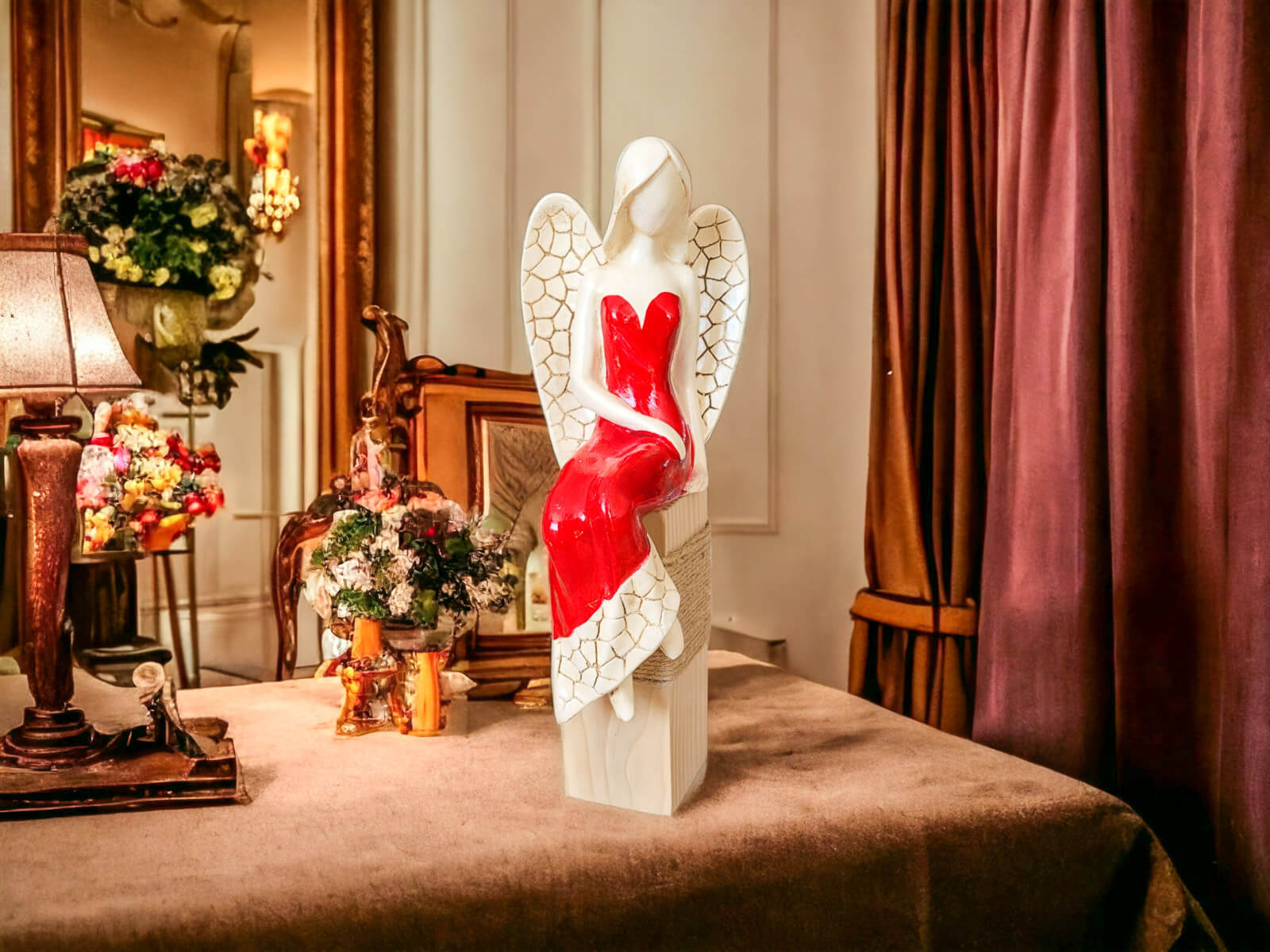 Anioł Emily przedstawia kobietę w czerwonej sukni. Ma jasne, proste włosy sięgające do ramion, a na plecach duże skrzydła z pięknymi wzorami. Jest w pozycji siedzącej ukazując swój wdzięk. Lewa ręka ułożona jest wzdłuż sylwetki, a prawa spoczywa na lewej nodze. Anioł wykonany jest ręcznie.