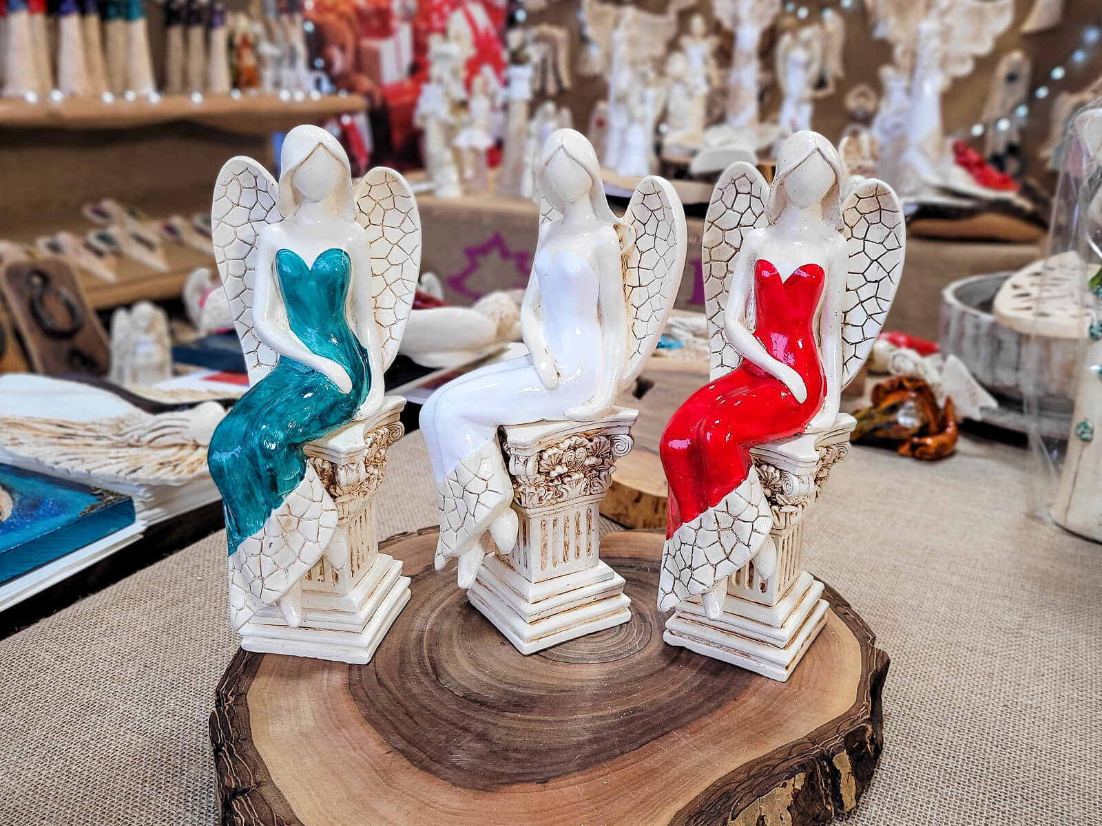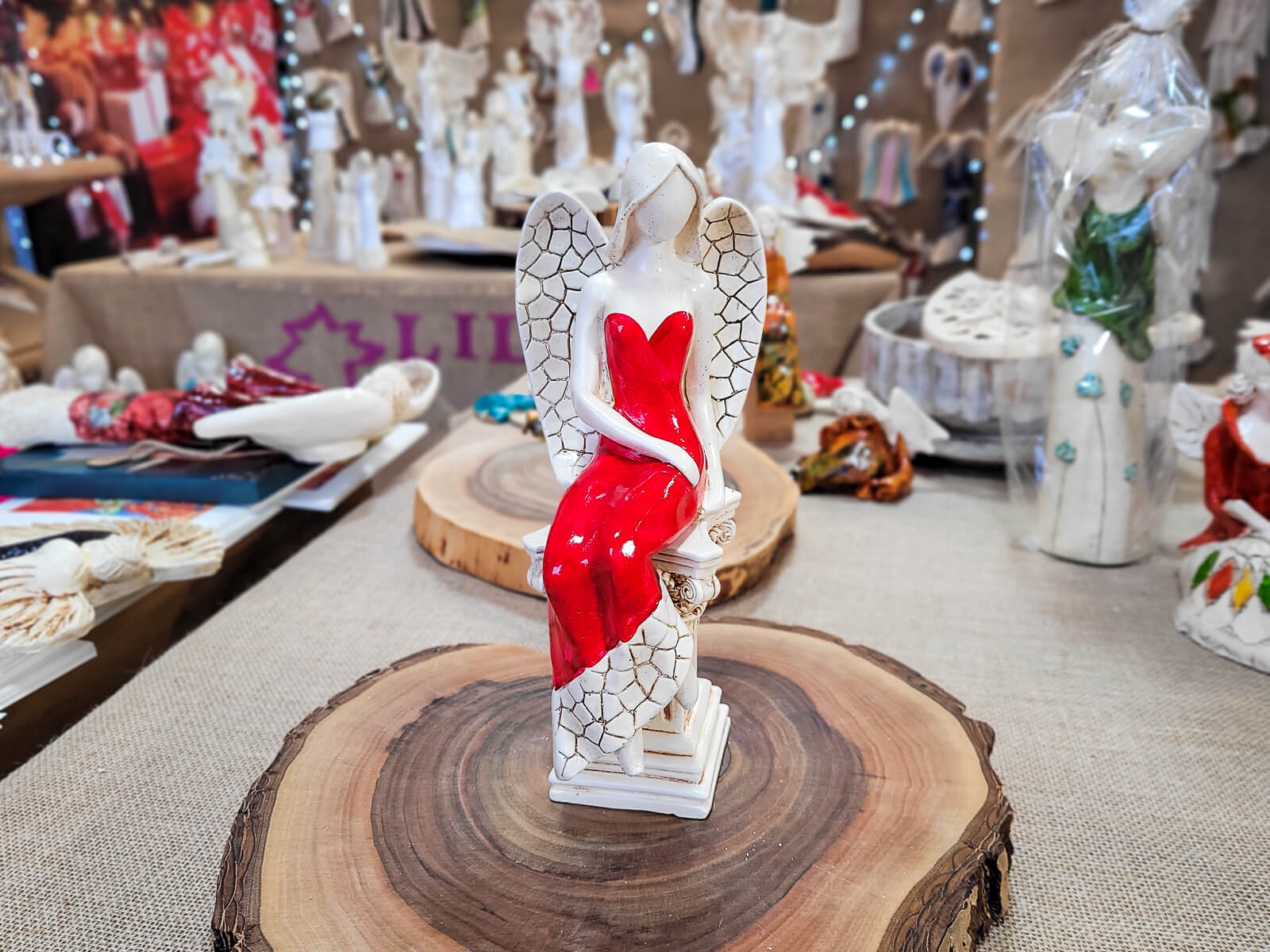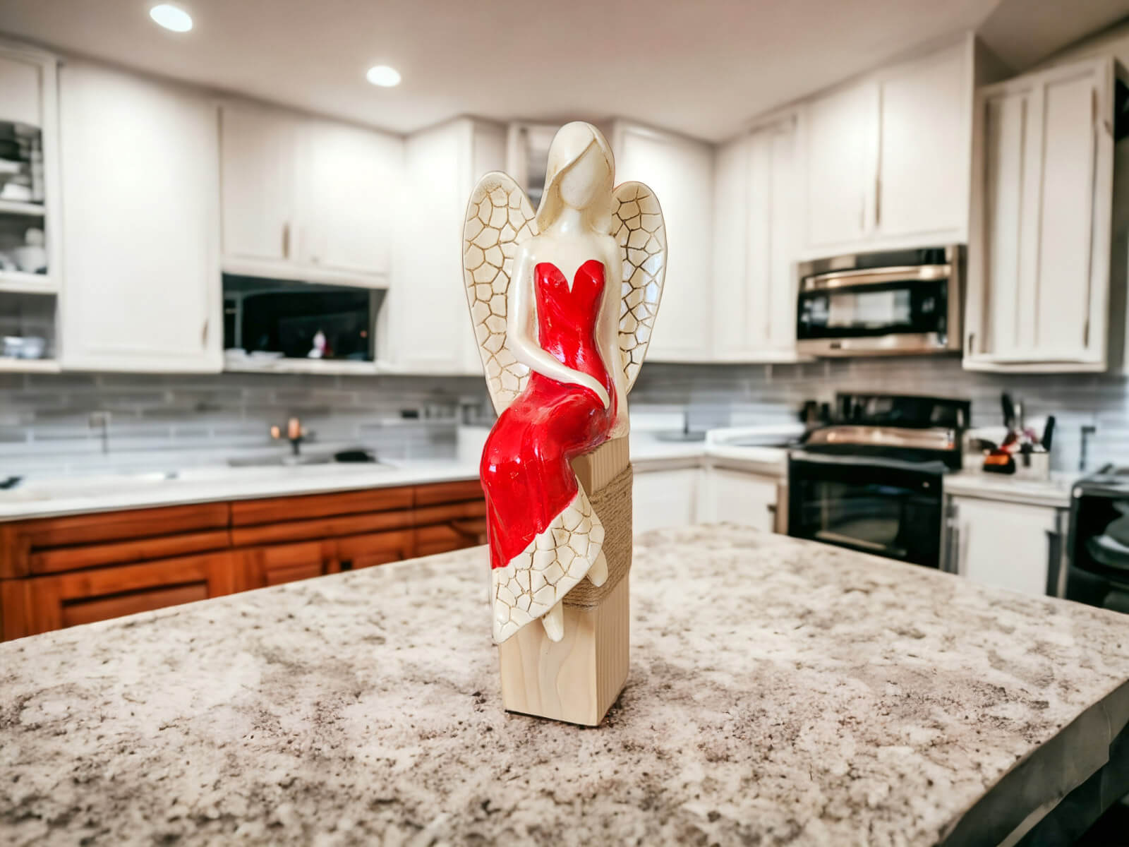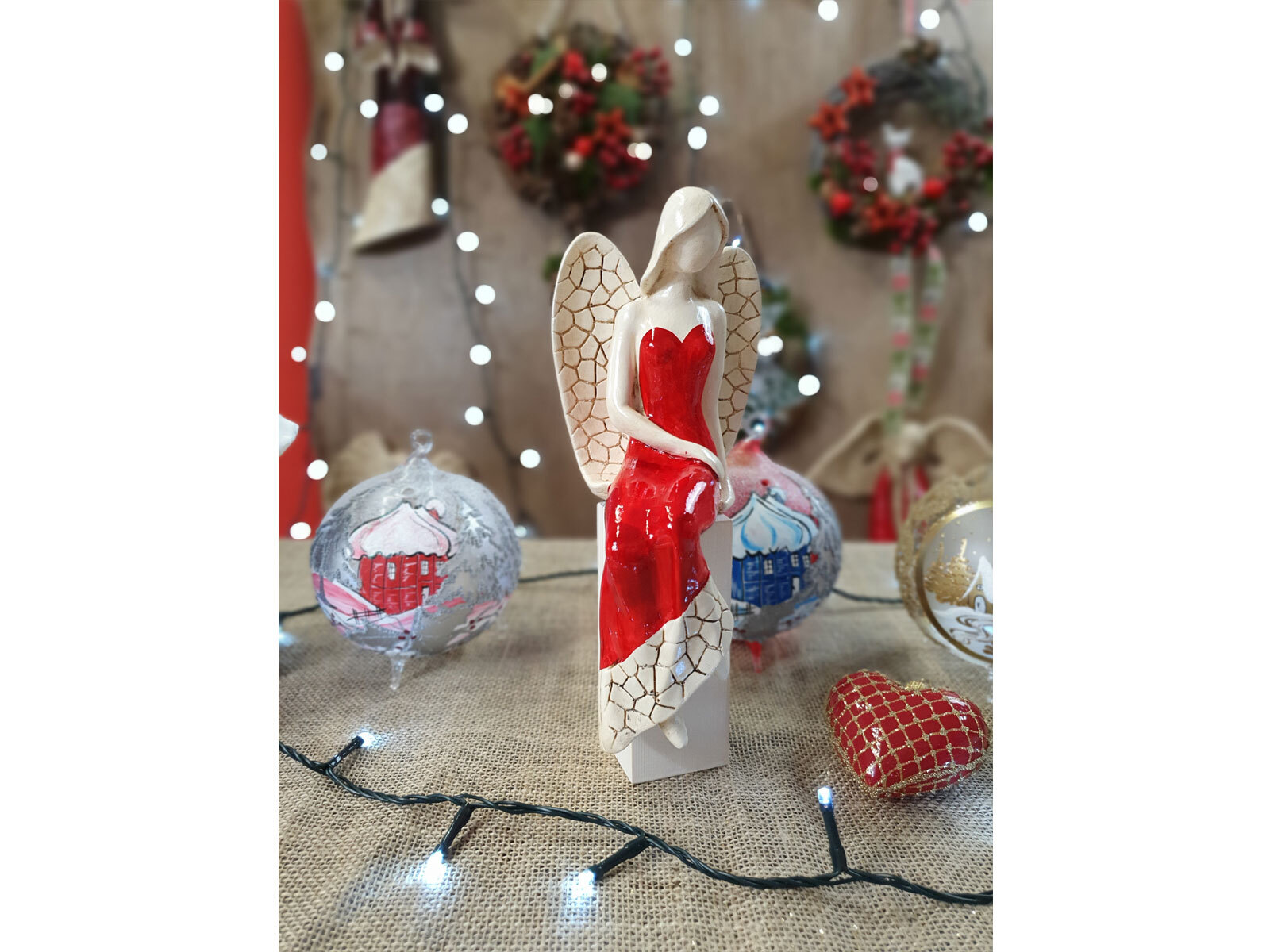 Anioł Emily przedstawia kobietę w czerwonej sukni. Ma jasne, proste włosy sięgające do ramion, a na plecach duże skrzydła z pięknymi wzorami. Jest w pozycji siedzącej ukazując swój wdzięk. Lewa ręka ułożona jest wzdłuż sylwetki, a prawa spoczywa na lewej nodze. Anioł wykonany jest ręcznie.