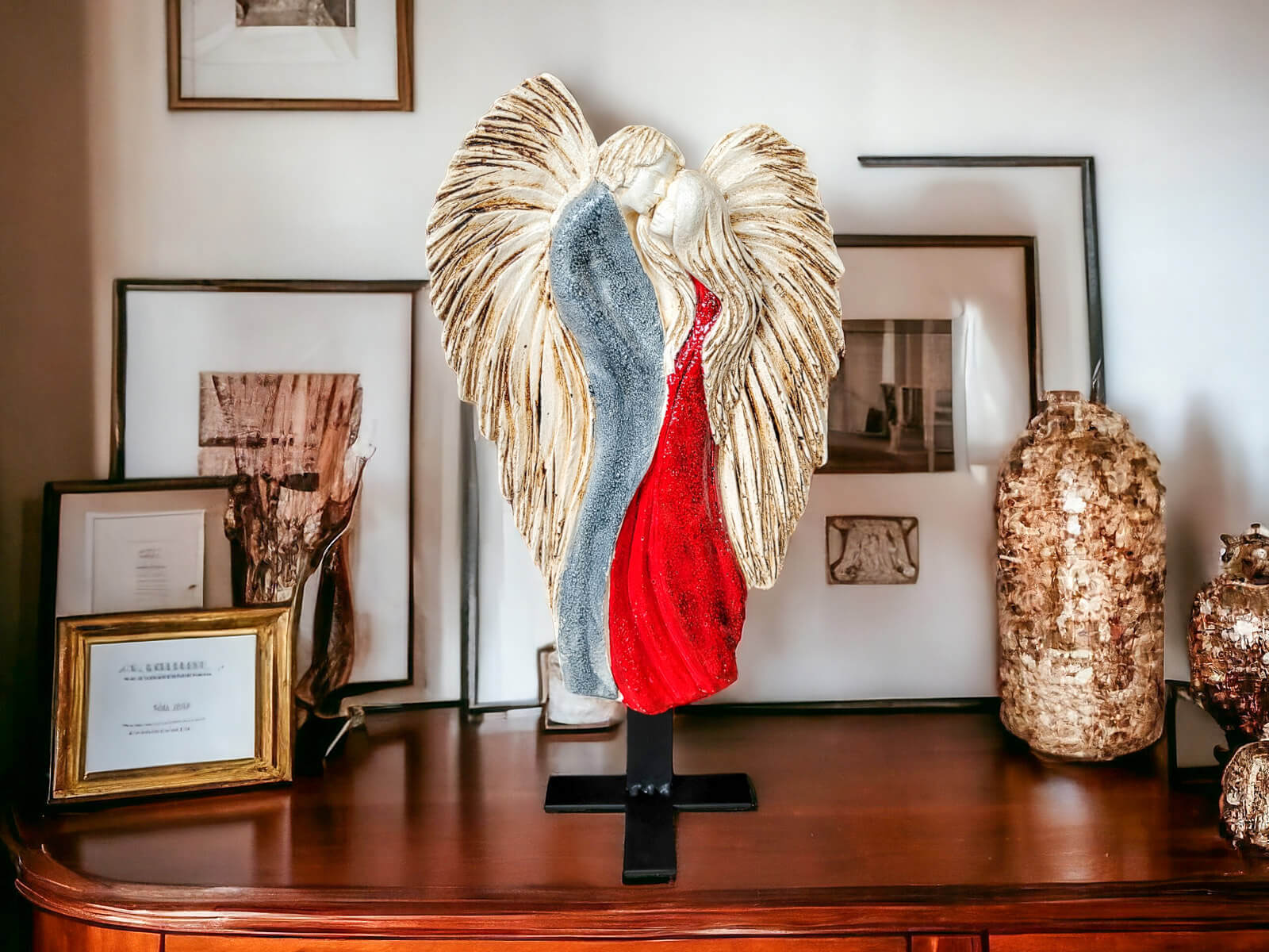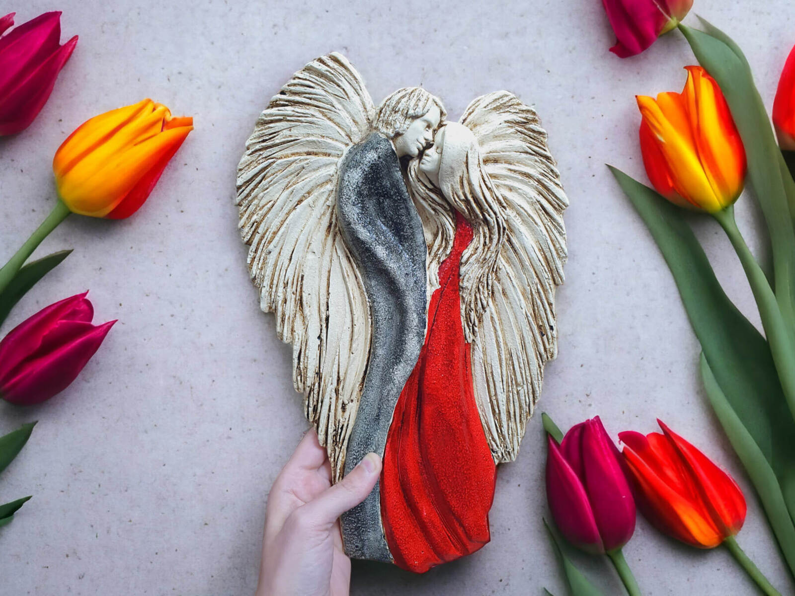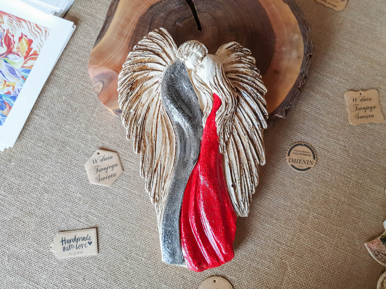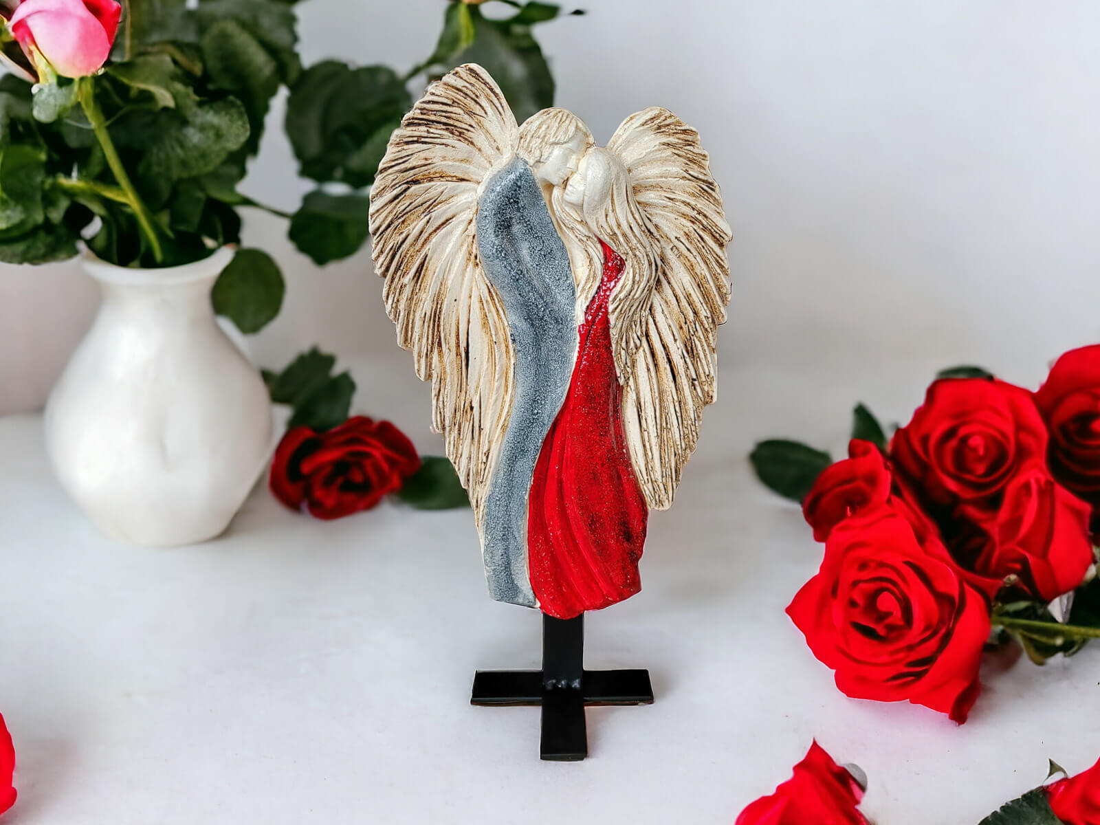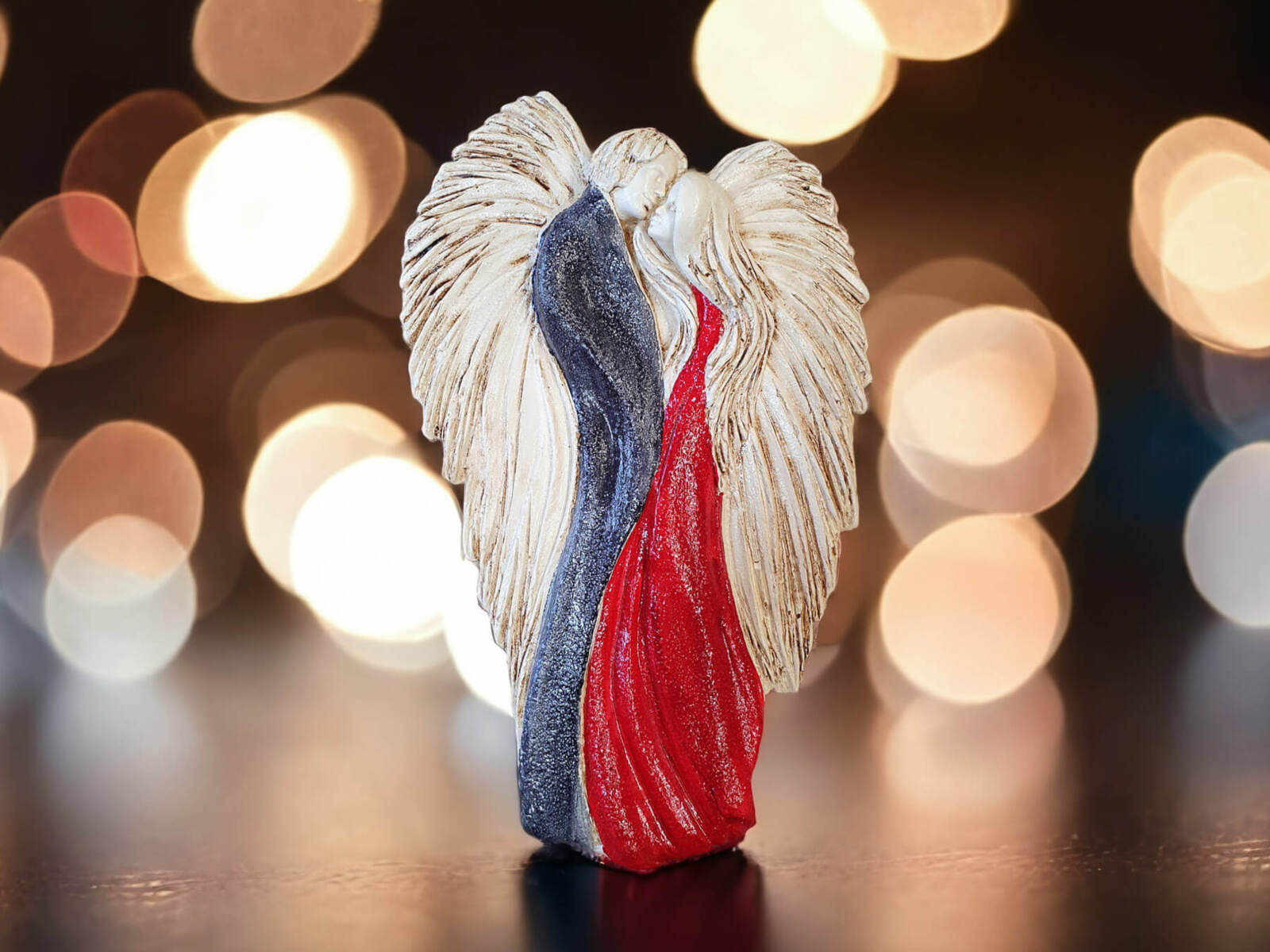 Czarno czerwona, ręcznie malowana figurka Zakochane Anioły. Ta wyjątkowa dekoracja symbolizuje wielką miłość, ukazując splecione w miłosnym uścisku anioły. Inspiracją dla projektu jest starożytny symbol energetycznej harmonii - Yin Yang, który podkreśla równowagę i jedność przeciwstawnych sił.