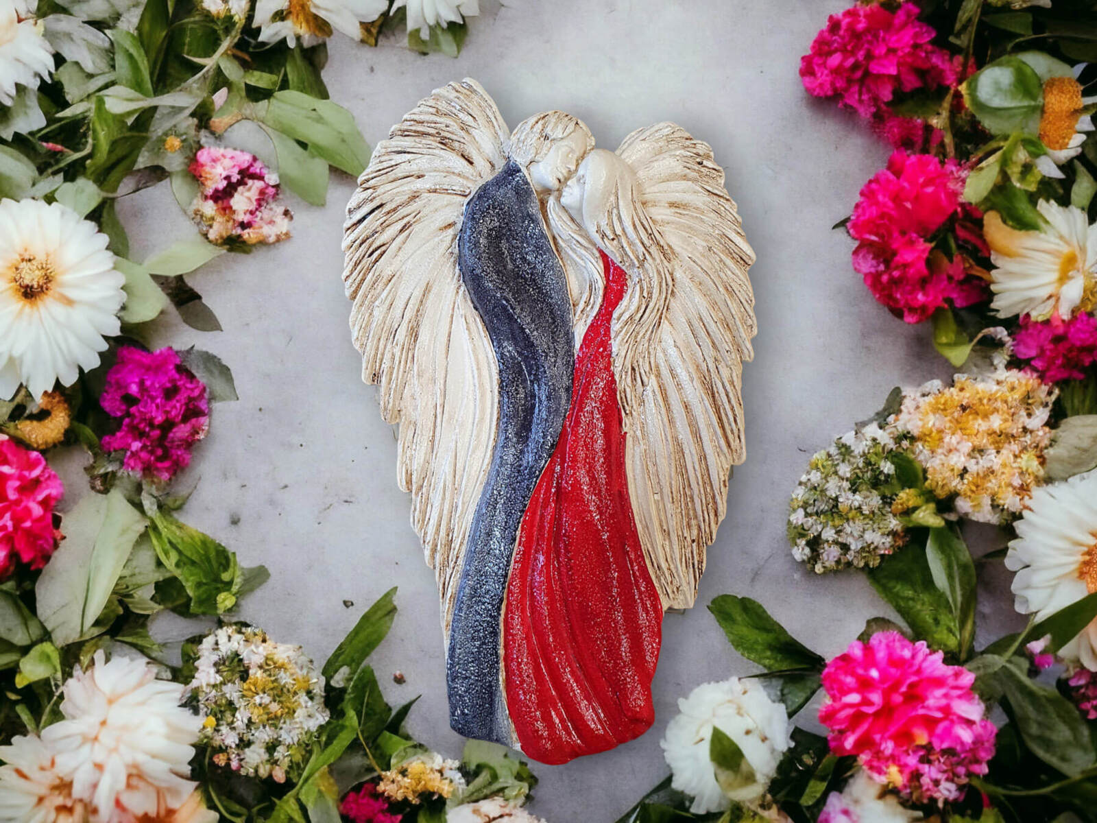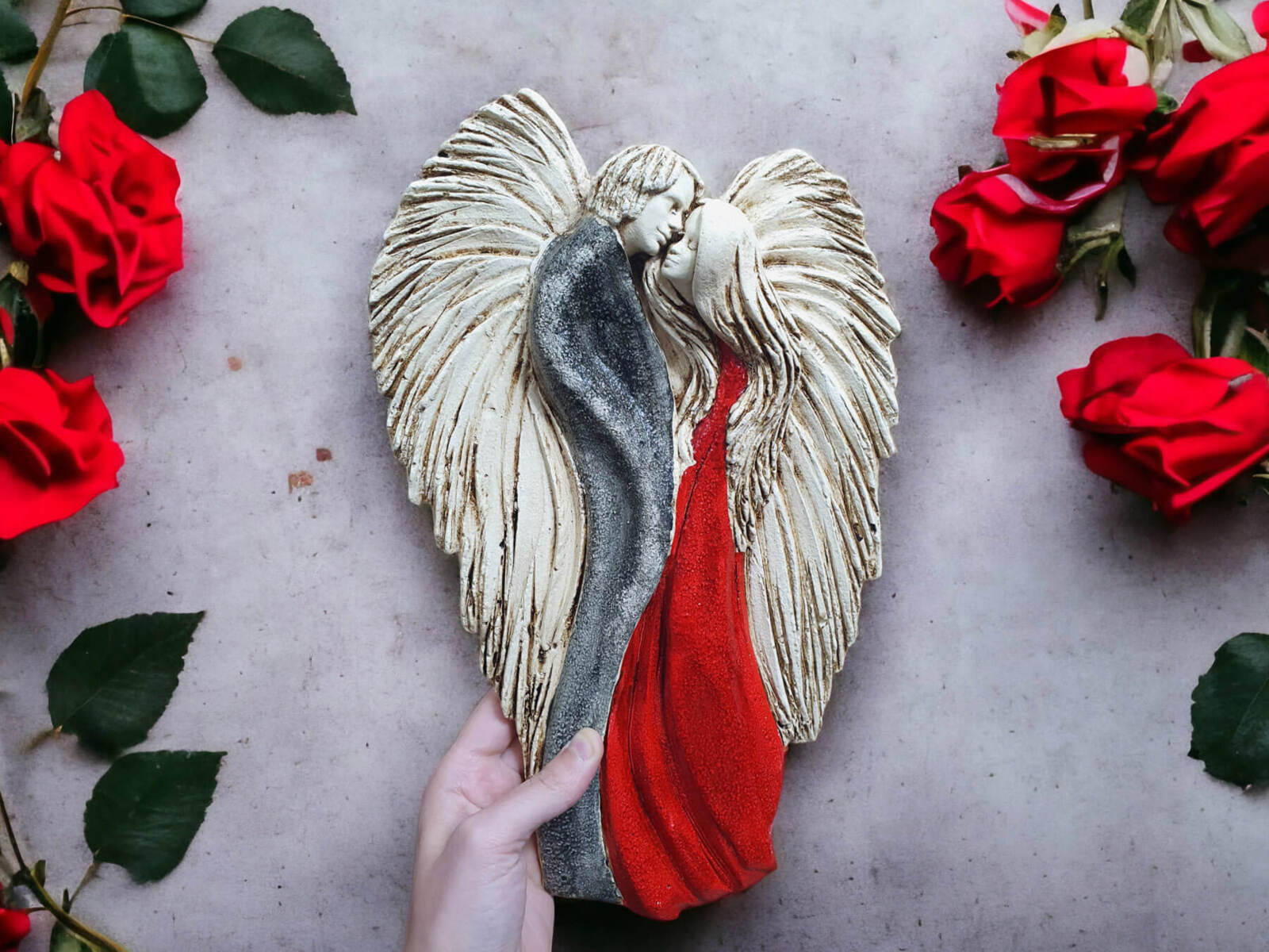 Figurka "Zakochane Anioły" to doskonały wybór na prezent ślubny lub rocznicowy, stanowiąc eleganckie i emocjonalne upamiętnienie szczególnych chwil w życiu. Dzięki starannemu wykonaniu i unikalnemu wzornictwu, figurka ta będzie pięknie prezentować się na ścianie w salonie czy sypialni, dodając wnętrzu niepowtarzalnego uroku i ciepła.