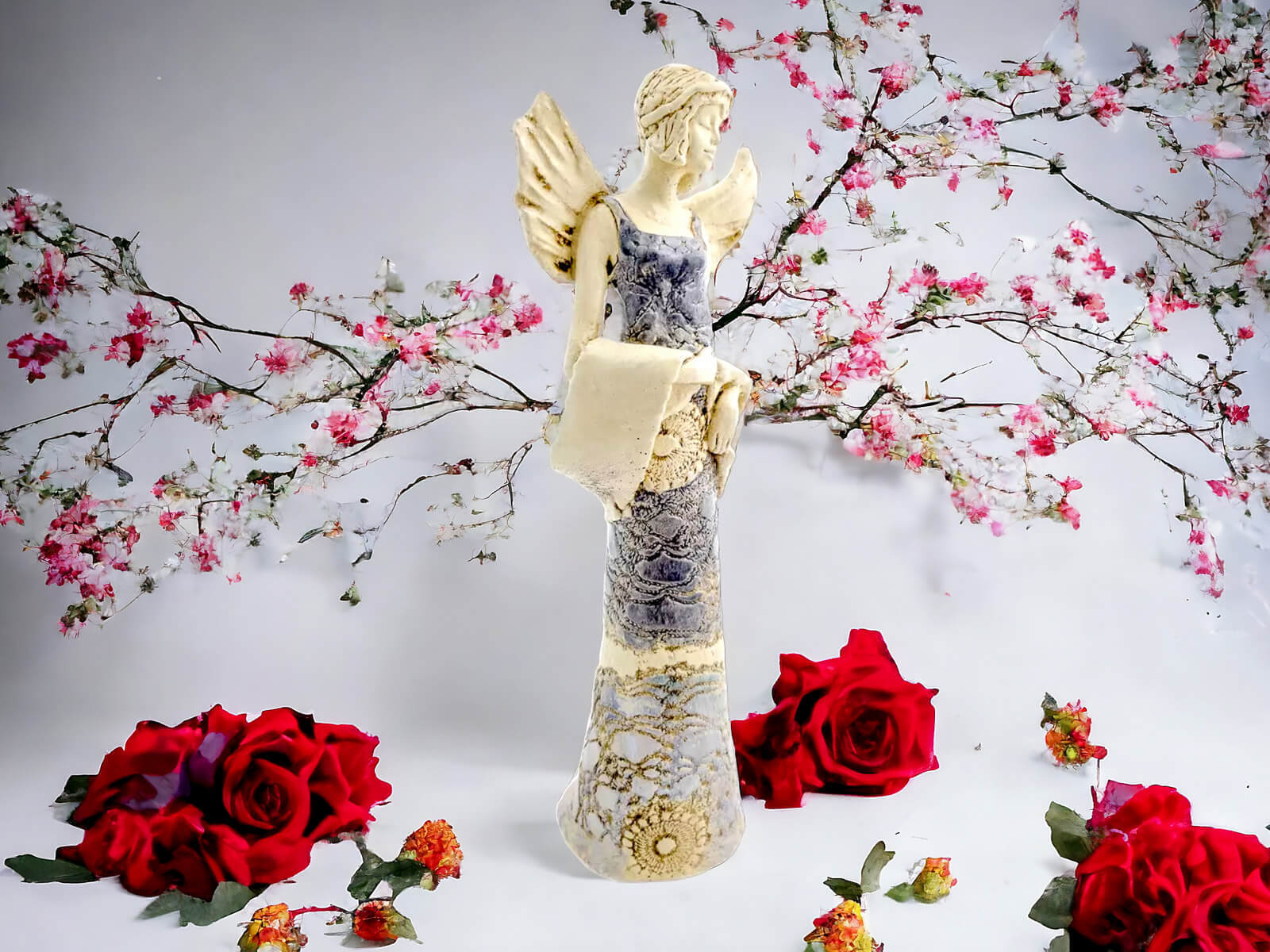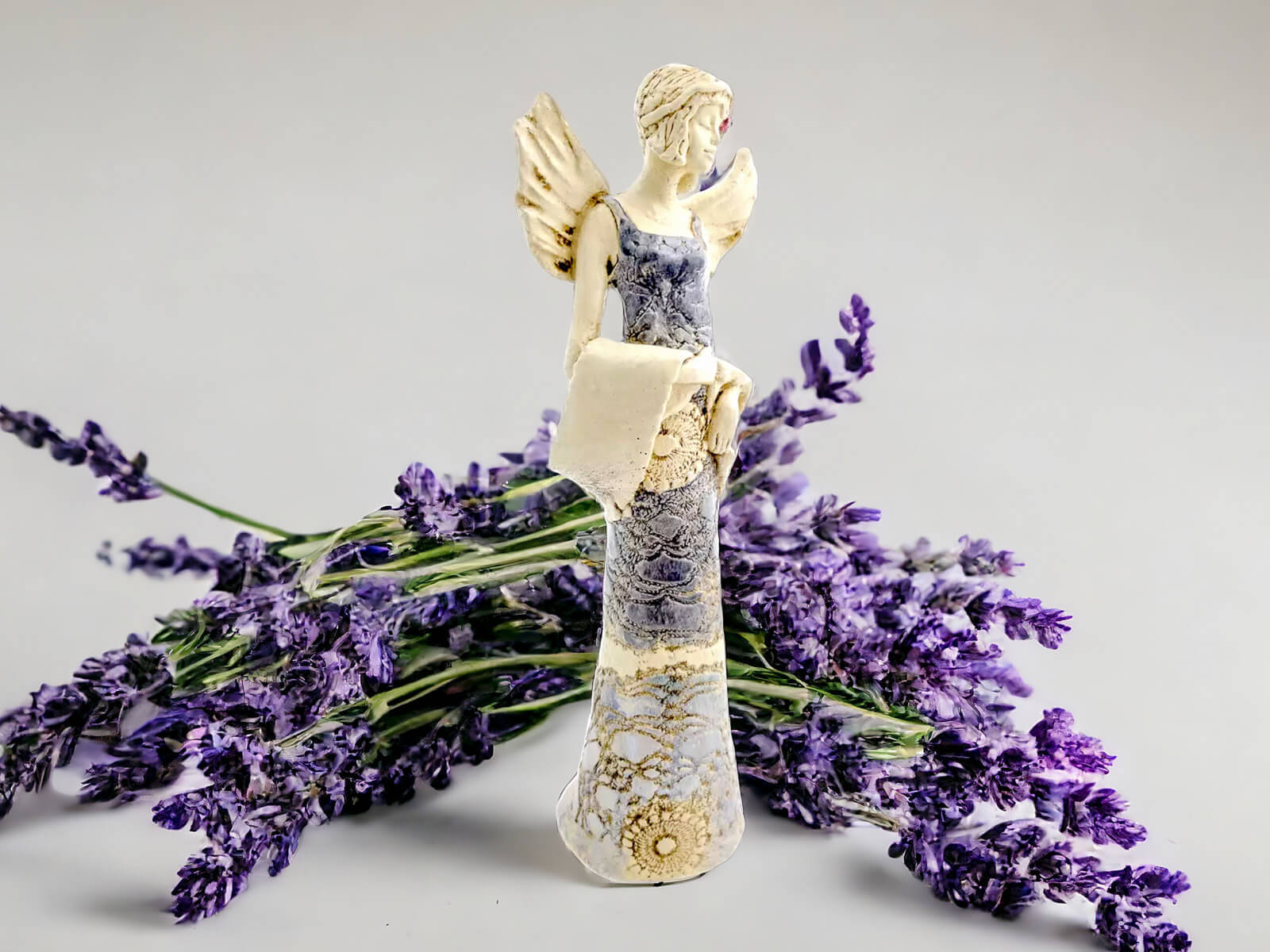Anioł Frances w szarej, eleganckiej sukni. Zafascynowana jest wszystkim co francuskie … Paryżem, kuchnią, modą, muzyką i filmami. W domu często ma w wazonie peonie, bo to jej ulubione kwiaty. Na ulubionej sukience też one są. Frances ma dużo dystansu do siebie, zawsze żartuje. Uwielbia wieczorne spacery i wypija mnóstwo kawy. Nigdy nie jest na diecie, uwielbia słodycze, ale sama nie potrafi zrobić nawet budyniu. Jest najlepszą opiekunką małych Aniołkowych dzieci.