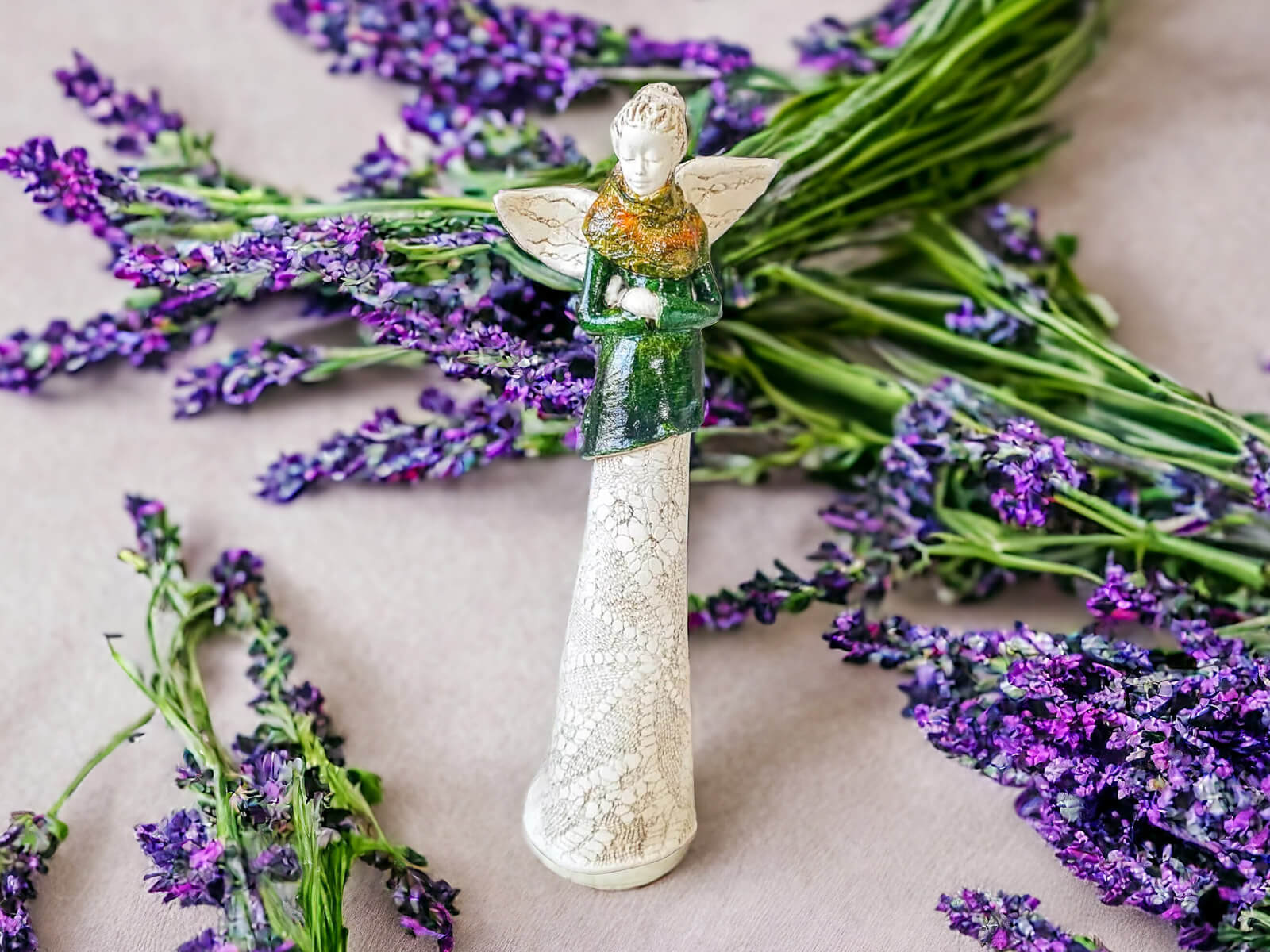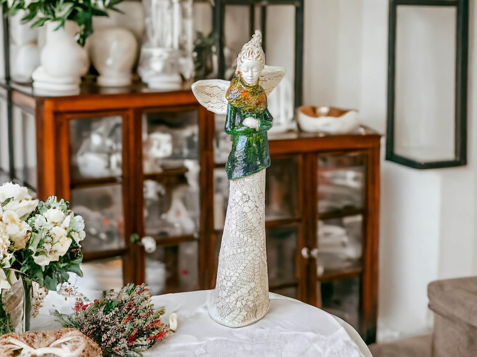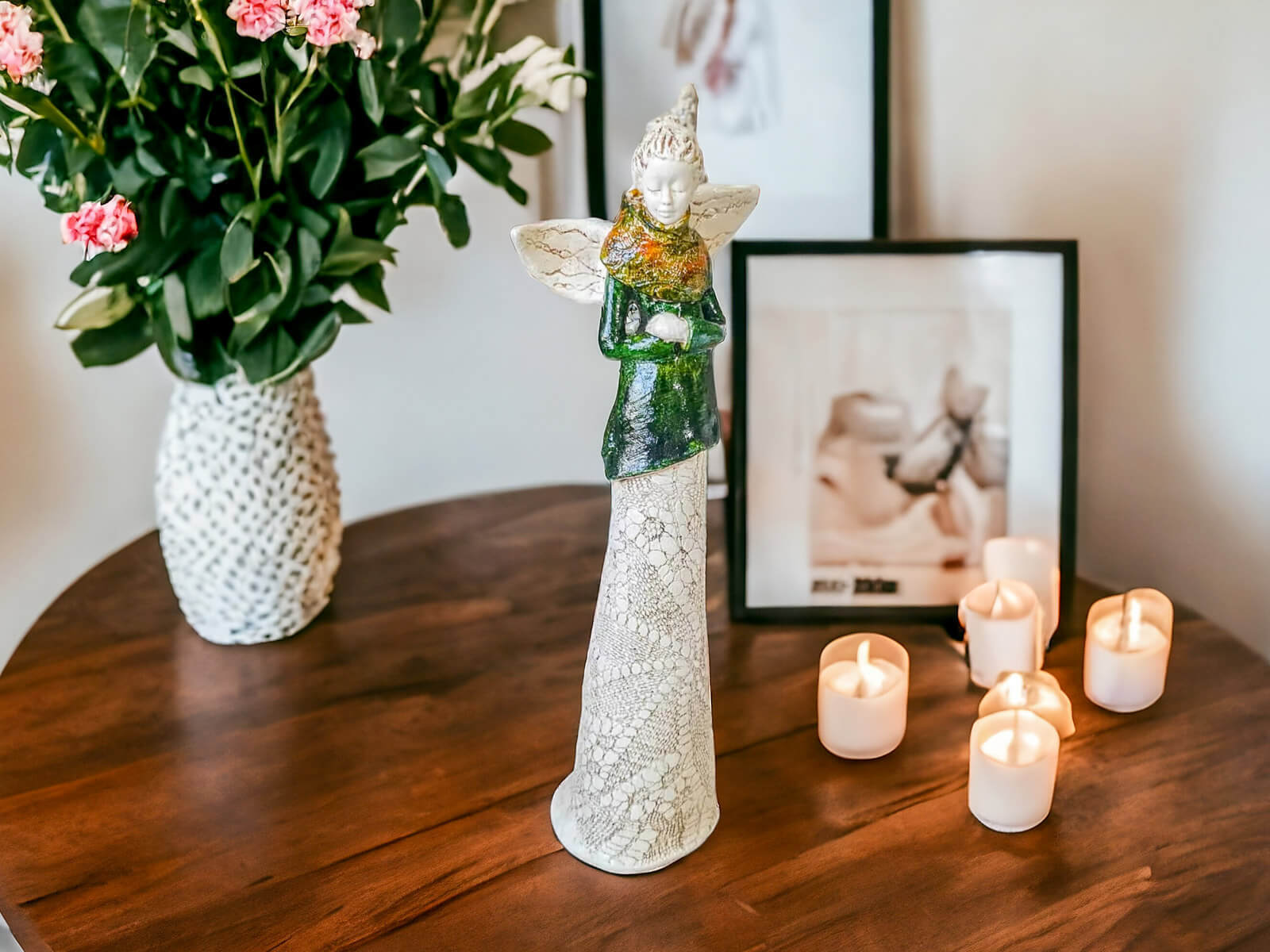 Anioł Catherine w zielonej sukni. Kasia to kobieta pełna wdzięku i klasy. Urok Catherine kryje się w jej nieśmiałości - spuszczony wzrok świadczy o zawstydzeniu spojrzeniami, które ściąga na siebie anielskim blaskiem. Figura pięknie zaprezentuje się w ogrodzie bądź salonie i z pewnością wywoła uśmiechy na twarzach Twoich gości.