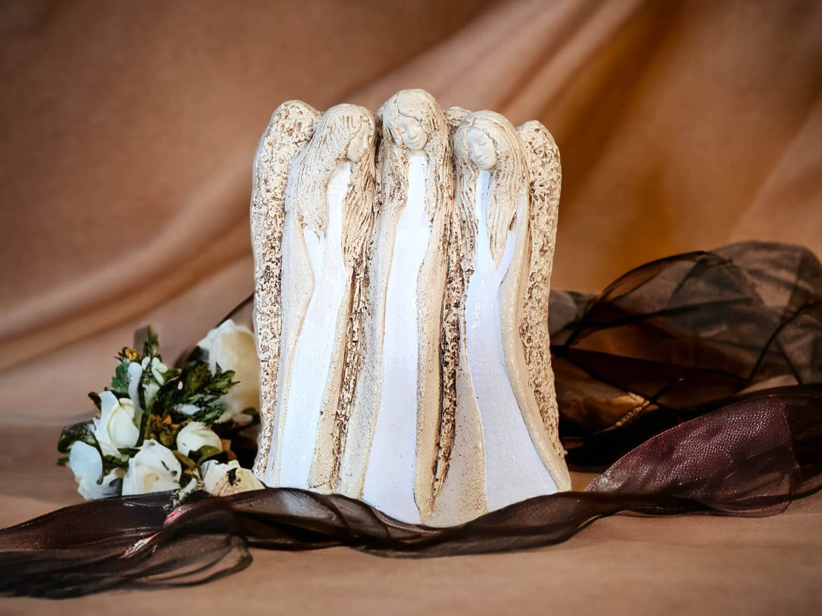 Figurka trzech aniołów gipsowych Wiara, Nadzieja, Miłość symbolizuje trzy fundamentalne wartości. Każdy z tych aniołów emanuje delikatnością i spokojem, przynosząc ze sobą inspirację i poczucie harmonii.
