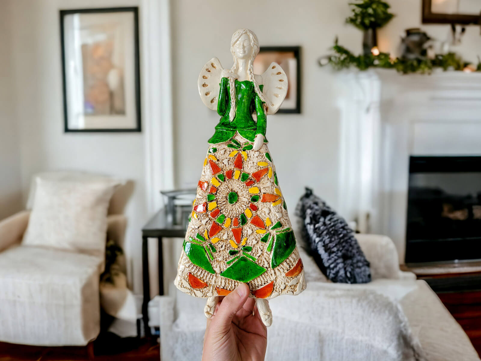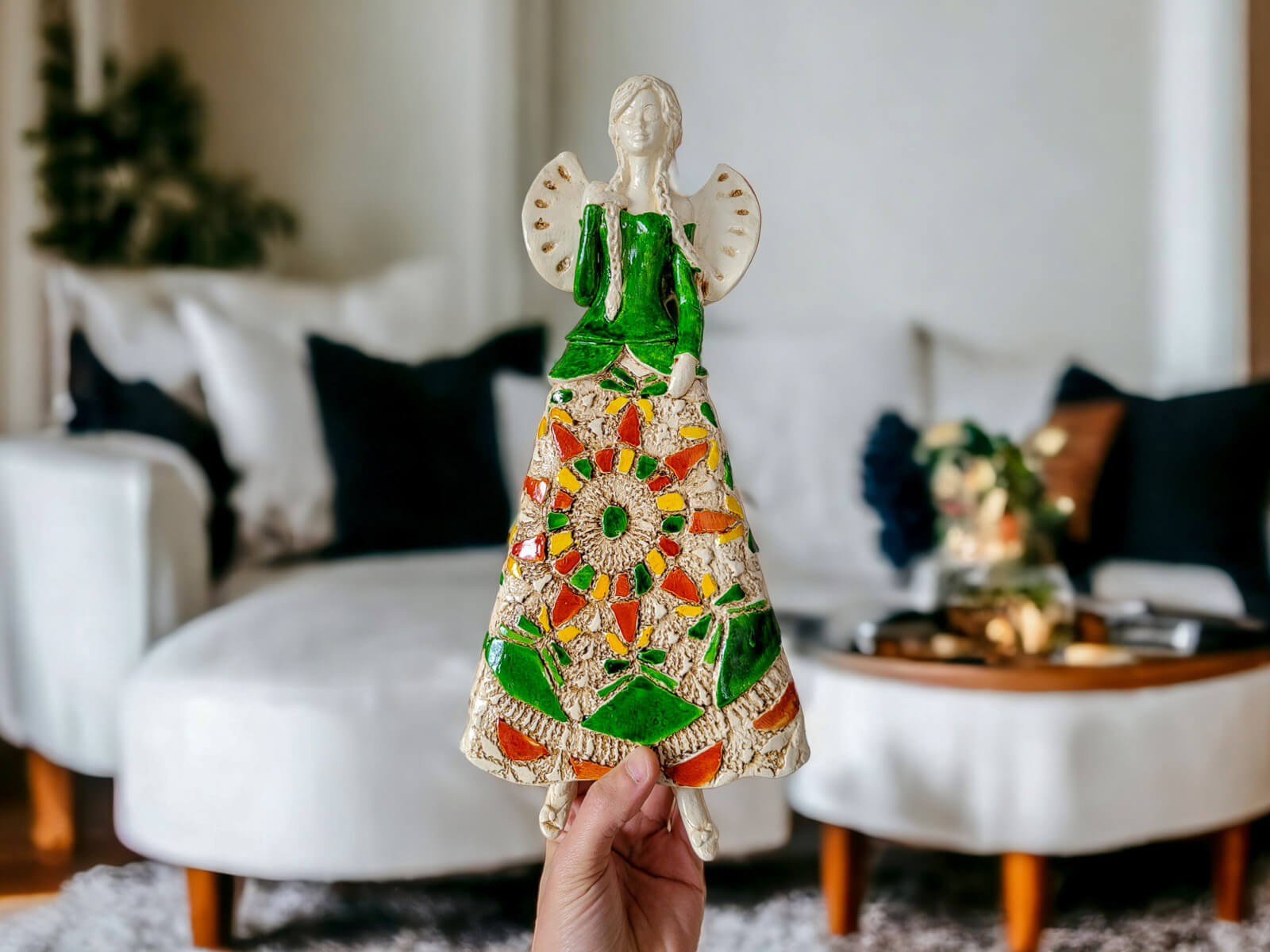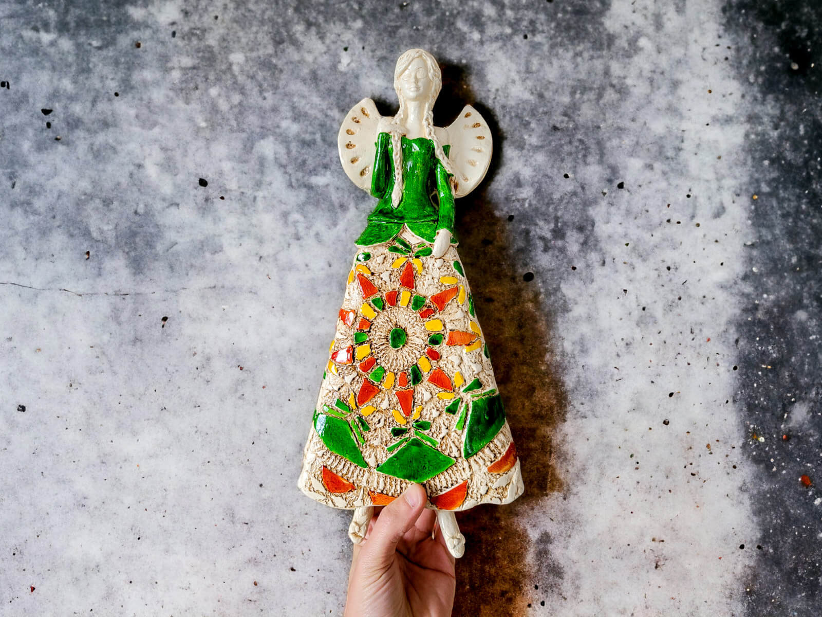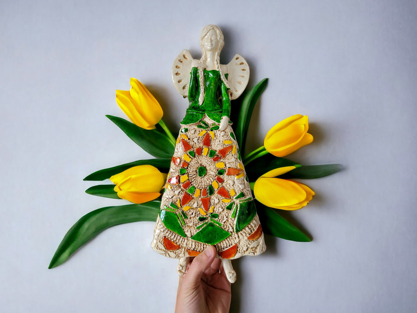 Anioł Heather w kolorze zielono pomarańczowym to ręcznie wykonana figurka do zawieszenia na ścianę. Heather to śliczna anieliczka ceniąca sobie tradycję. Jest artystką uwielbia kulturę ludową swojej wioski. Jest ubrana w folklorystyczną suknie. Eksponuje piękne, długie warkocze. Ma delikatne, rozłożyste skrzydła. Figurka nadaje się na prezent na każdą okazję. Można ją zawiesić w każdym miejscu. Świetnie wkomponuje się w klasyczne jak i nowoczesne wnętrze.