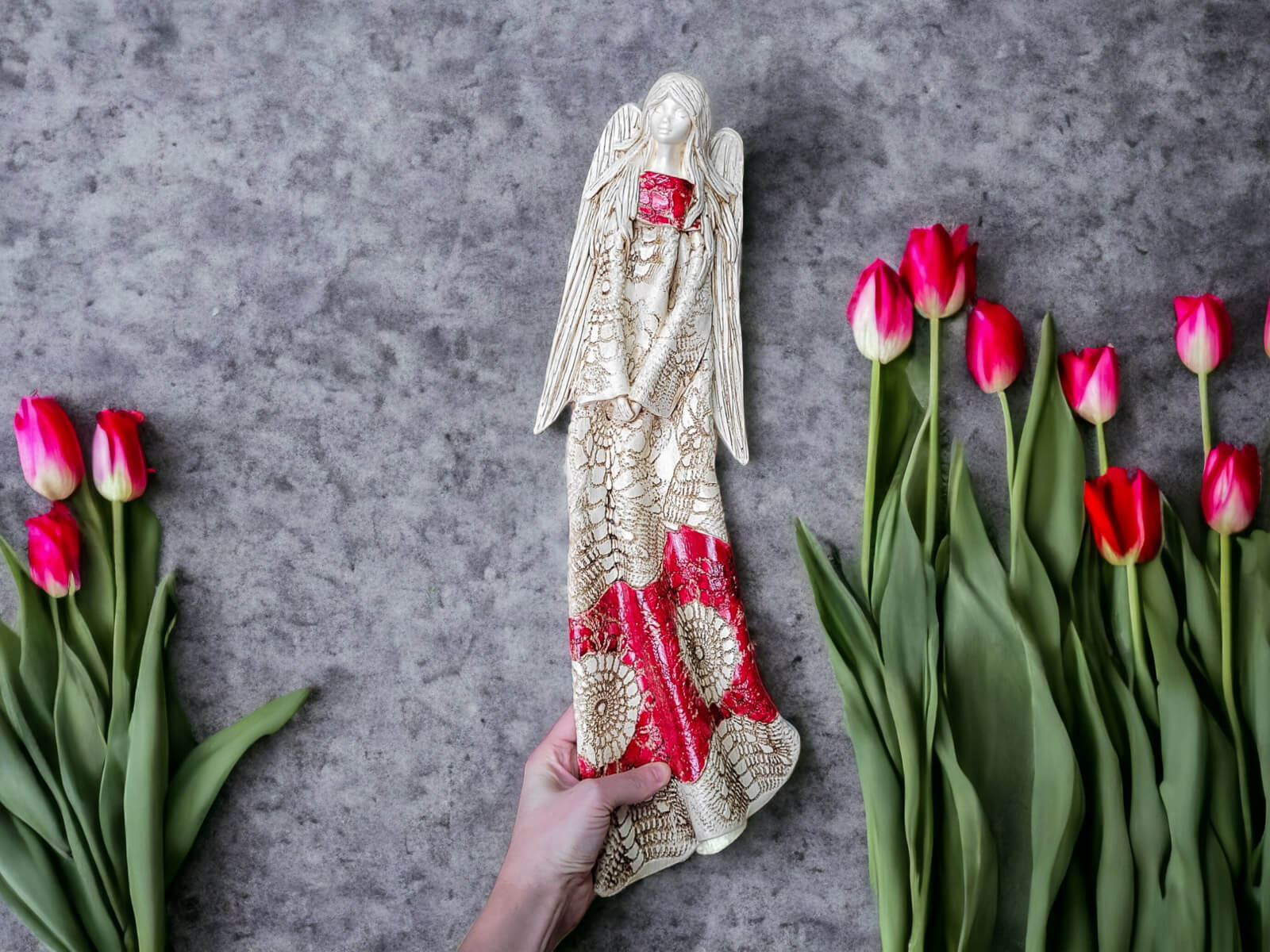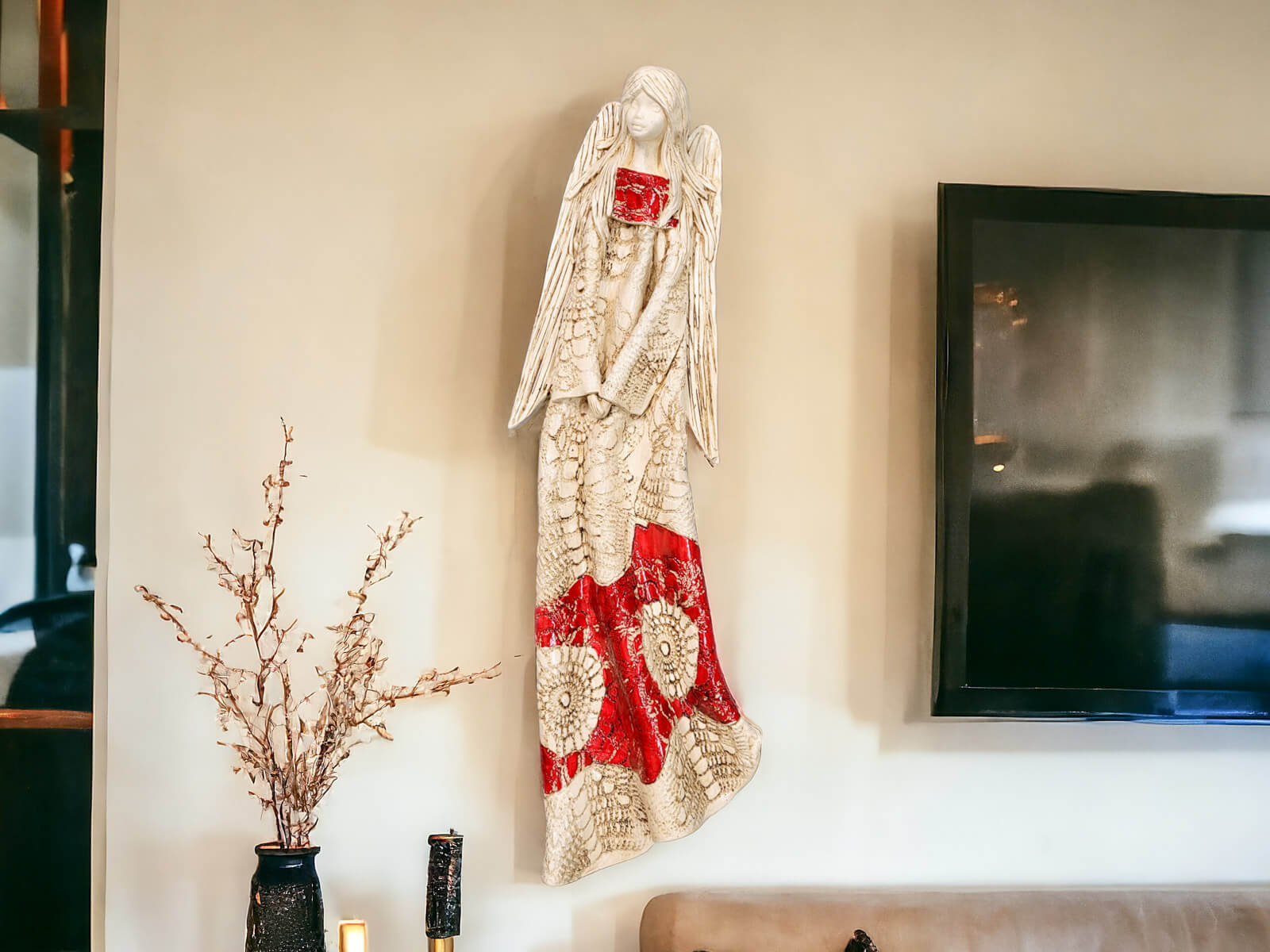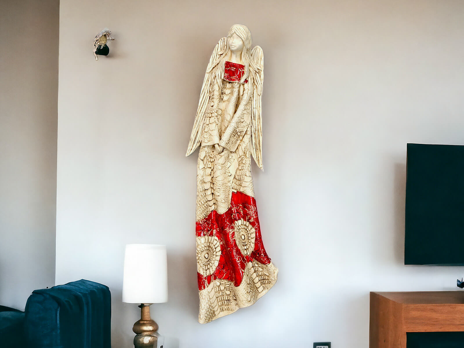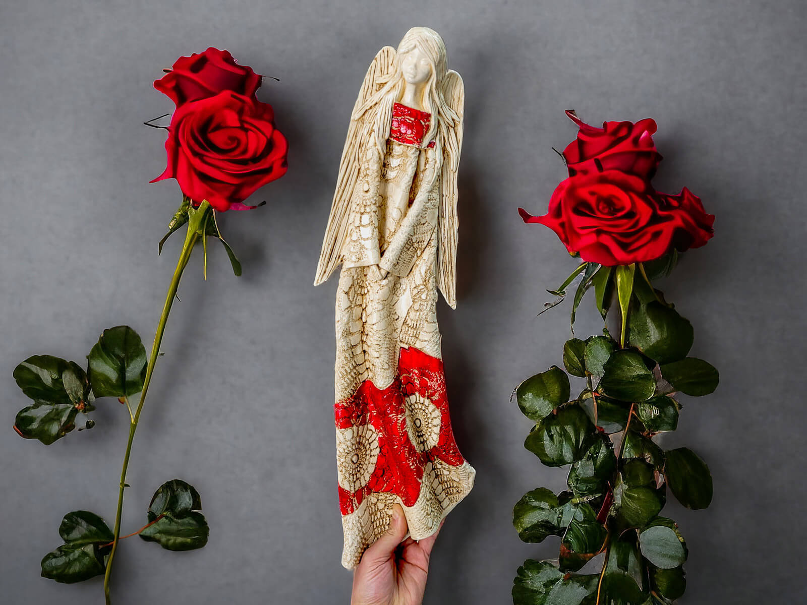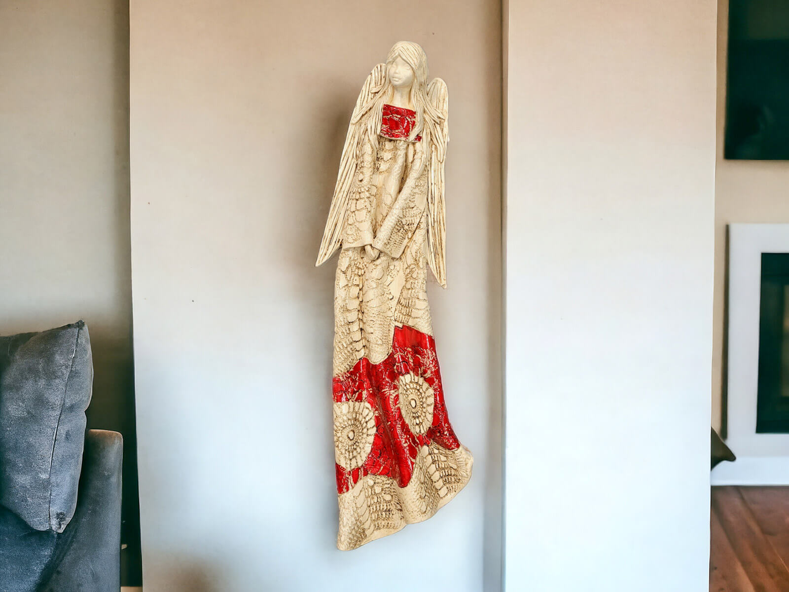 Anioł Genesis to ręcznie wykonana figurka do zawieszenia na ścianę w kolorze czerwonym. Jego imię jest pochodzenia greckiego. Anioł jest pełen tajemnic. Cały swój czas poświęca sprawom społecznym. Potrafi każdemu udzielić pomocy i wsparcia. Troska o innych wypływa prosto z jej serca. Jest ubrany w zwiewną, beżową suknie z haftowanymi ornamentami. Z gracją eksponuje rozłożyste skrzydła. Figurka nadaje się na prezent na każdą okazję.