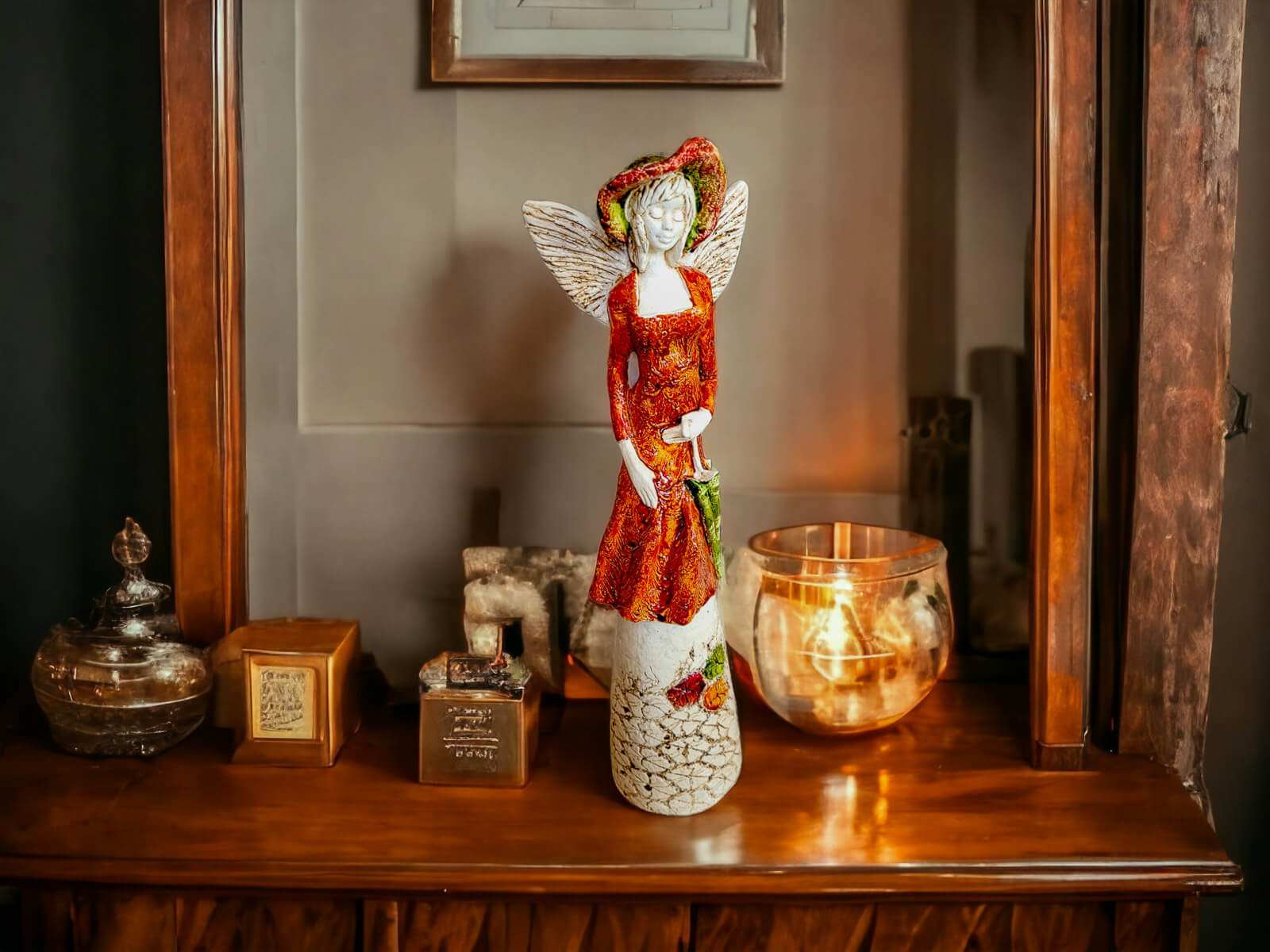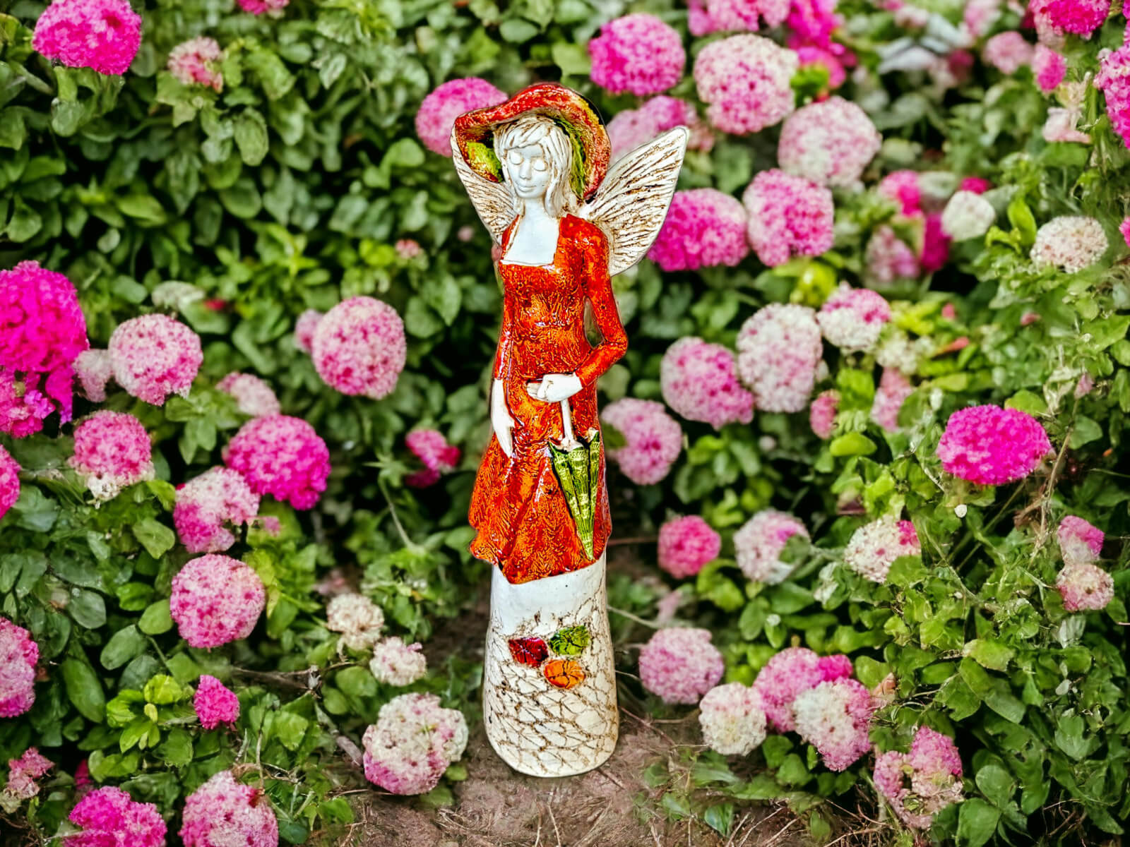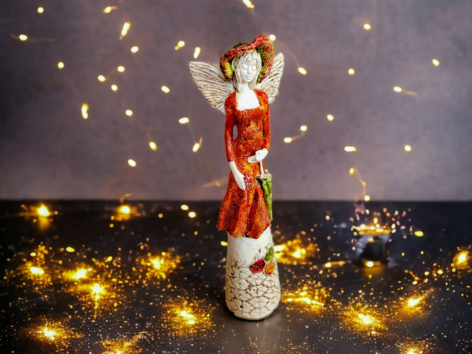 Anioł Olivia to dekoracja stojąca, wykonana ręcznie z gipsu. Anioł ma na sobie pomarańczową suknię i kapelusz na głowie. Ma krótkie, jasne włosy, a w lewej dłoni trzyma parasol. Z tyłu wystają małe skrzydła. Figurka pięknie wyglądałaby w stylowym wnętrzu, jak i na zewnątrz w ogrodzie. Idealnie nadaje się na prezent dla osoby, która lubi oryginalność.