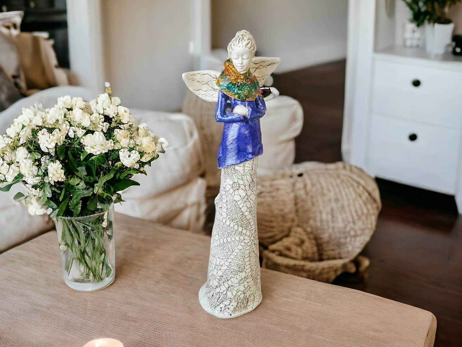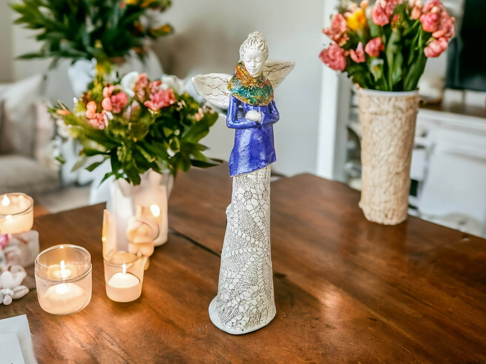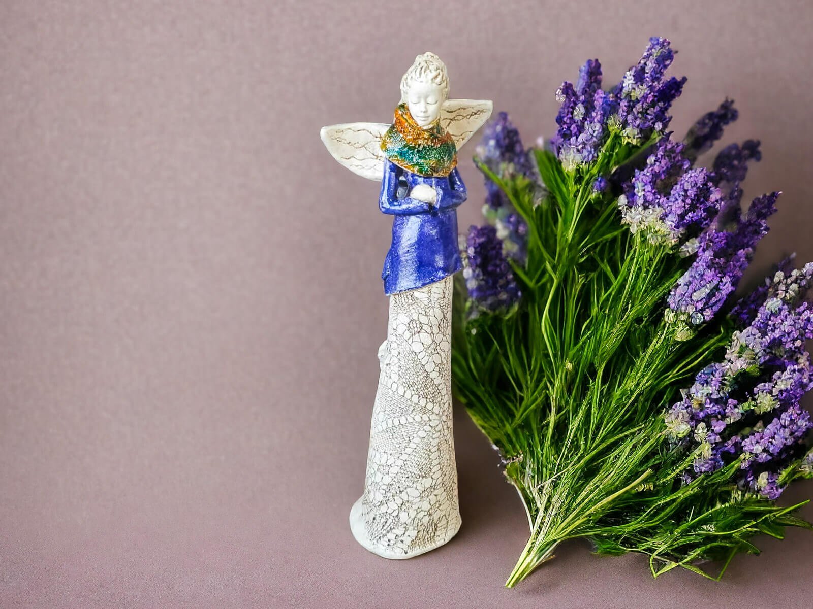 Anioł Catherine w granatowej sukni. Kasia to kobieta pełna wdzięku i klasy. Urok Catherine kryje się w jej nieśmiałości - spuszczony wzrok świadczy o zawstydzeniu spojrzeniami, które ściąga na siebie anielskim blaskiem. Figura pięknie zaprezentuje się w ogrodzie bądź salonie i z pewnością wywoła uśmiechy na twarzach Twoich gości.