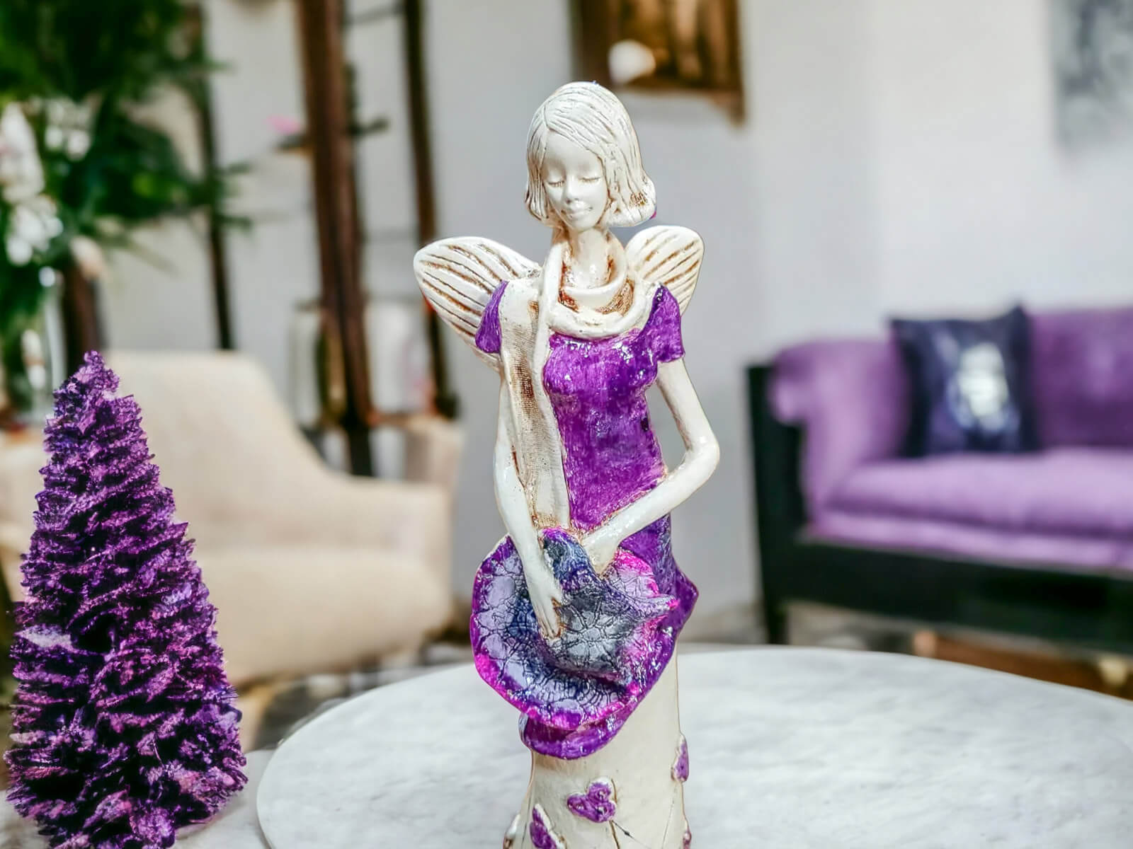 Sunday Rose prezentuje się w urokliwej fioletowej sukni z delikatnymi zdobieniami, w rękach trzyma rozłożysty kapelusz, co nadaje jej wyjątkowego charakteru. Figurka ma 32 cm wysokości i jest idealnym dodatkiem do każdego wnętrza, dodając mu subtelnego uroku i blasku.