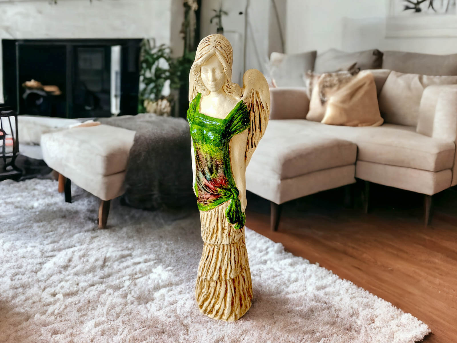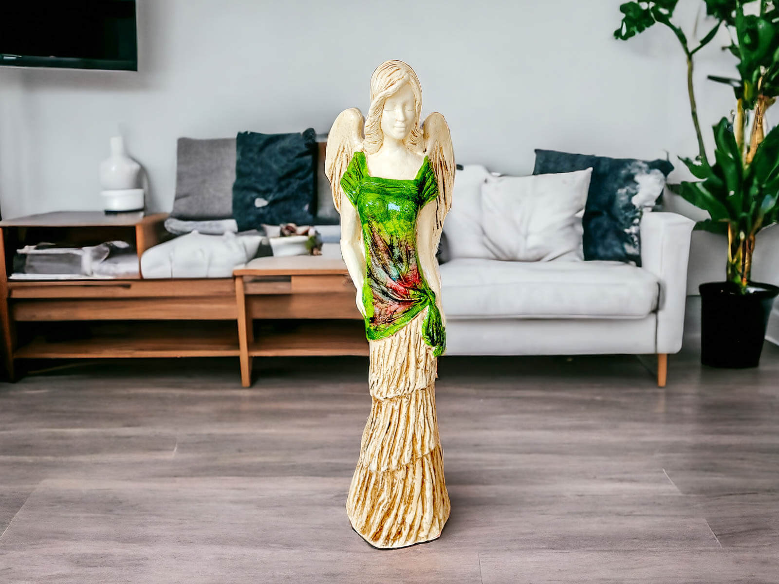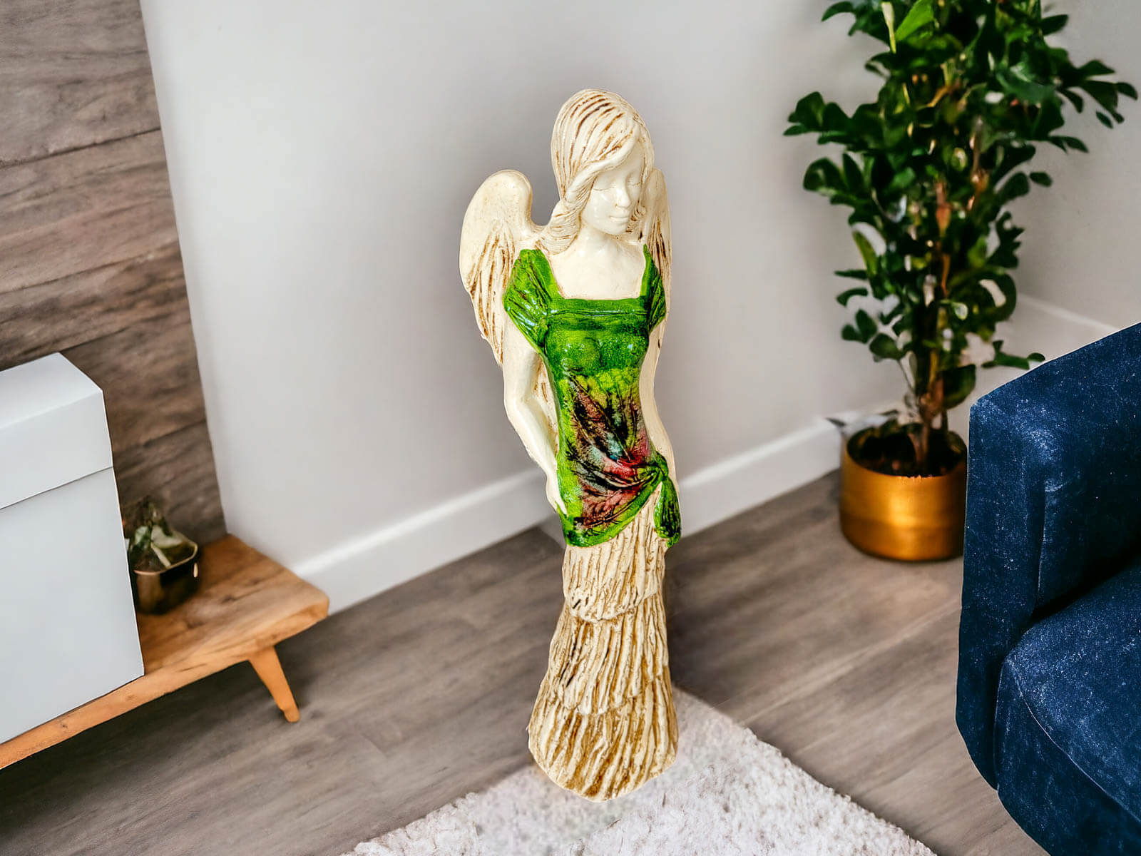 Figurka anioła Victoria to wyjątkowy element dekoracyjny, który zachwyca swoją subtelnością i niezwykłym detalem. Wykonana ręcznie w Polsce, jest częścią unikatowej kolekcji Art, która charakteryzuje się użyciem prawdziwych liści, co nadaje każdej figurce niepowtarzalny wygląd i naturalne piękno. Anioł Victoria ubrany jest w delikatną, zieloną suknię, która symbolizuje harmonię z naturą oraz spokój.