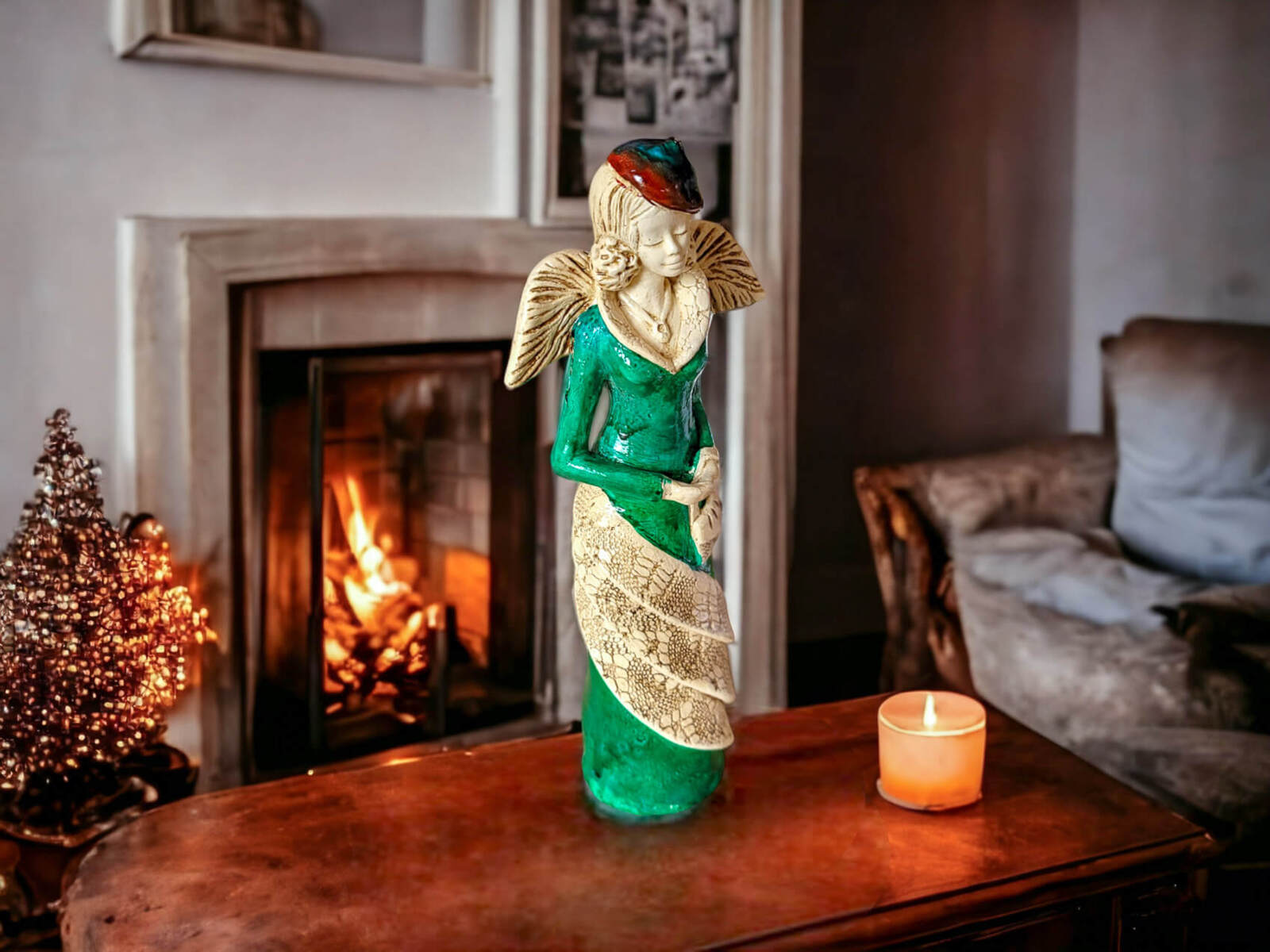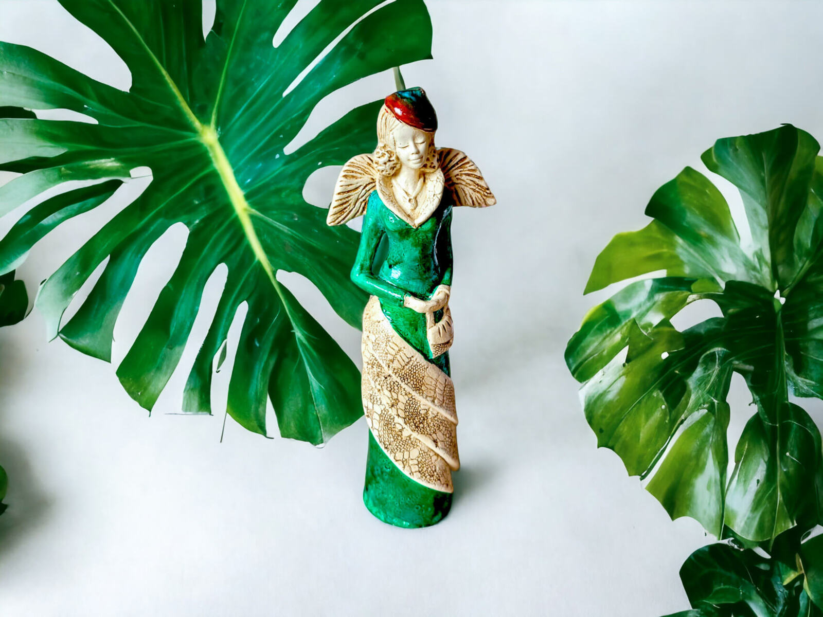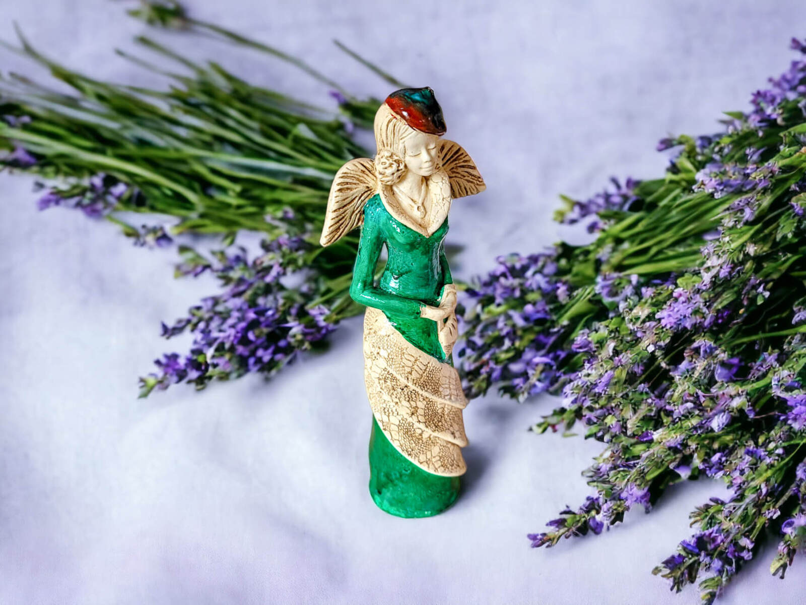 Charlotte w zielonej sukni z brązowym liściem. Uwielbia wyjścia do teatru i do kina. Podróżuje po całym świecie i podziwia architekturę miast. Kolekcjonuje śnieżne kule z miejsc, w których już była. Pomoże uleczyć duszę. Z pewnością przypomni jak używa się skrzydeł i jak się lata. Anioł, który przyda się w każdym domu, i każdym biurze. Przywróci wiarę we własne siły, pomoże w walce o lepszy czas. Charlotte jak nikt potrafi podziękować za wszystko. Jeśli chcesz komuś podziękować podaruj mu tego Anioła.