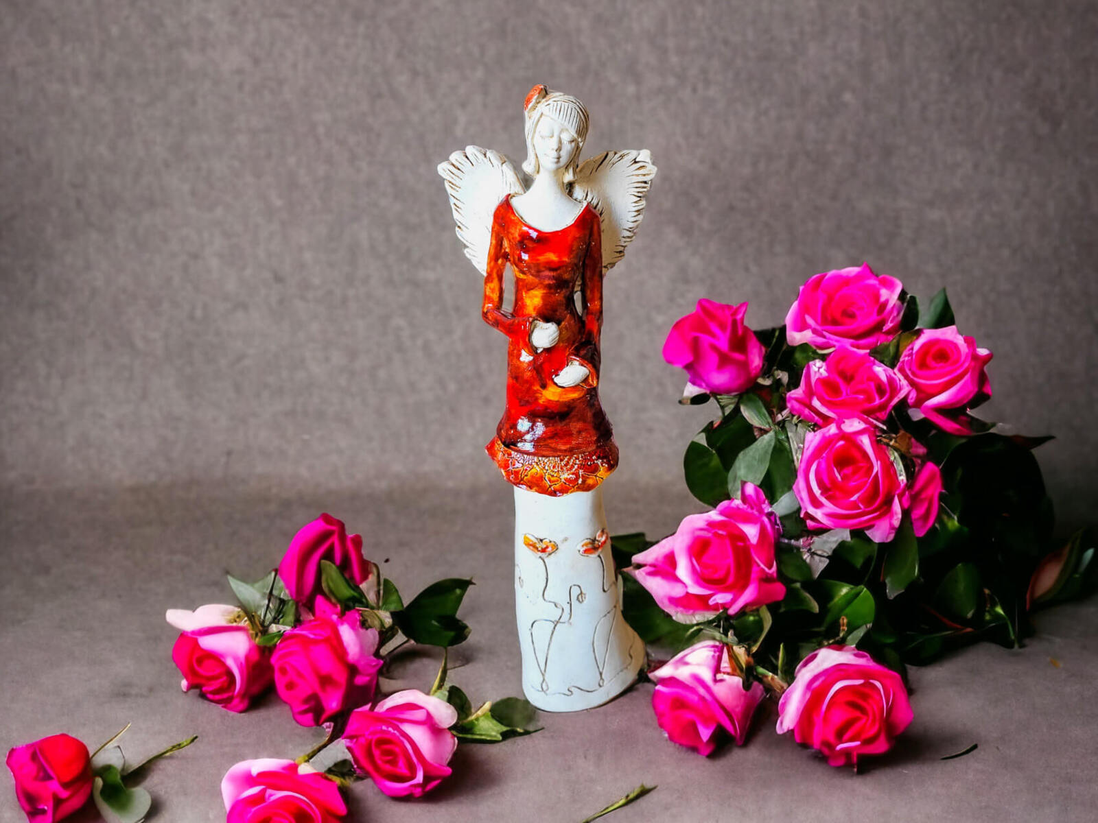 Jesienna Mia w odcieniach brązu i ostatnich promieni zachodzącego słońca. Mia to anioł dla każdej kobiety lubiącej kwiaty, takiej która ma dobrą rękę i serce oddane pielęgnowaniu. Podaruj ją komuś kto cały rok zachwyca się kwitnącymi roślinami, sadzi je, podlewa i zawsze jak wyjeżdża to martwi się „co będzie z kwiatami?”. Obiecujemy, że Mia będzie patronką kwiatów w domu i w ogródku, chętnie zamieszka w altance lub w domu ogrodowym. Jednak polecamy nie zostawiać jej obowiązków pielęgnacji ;)