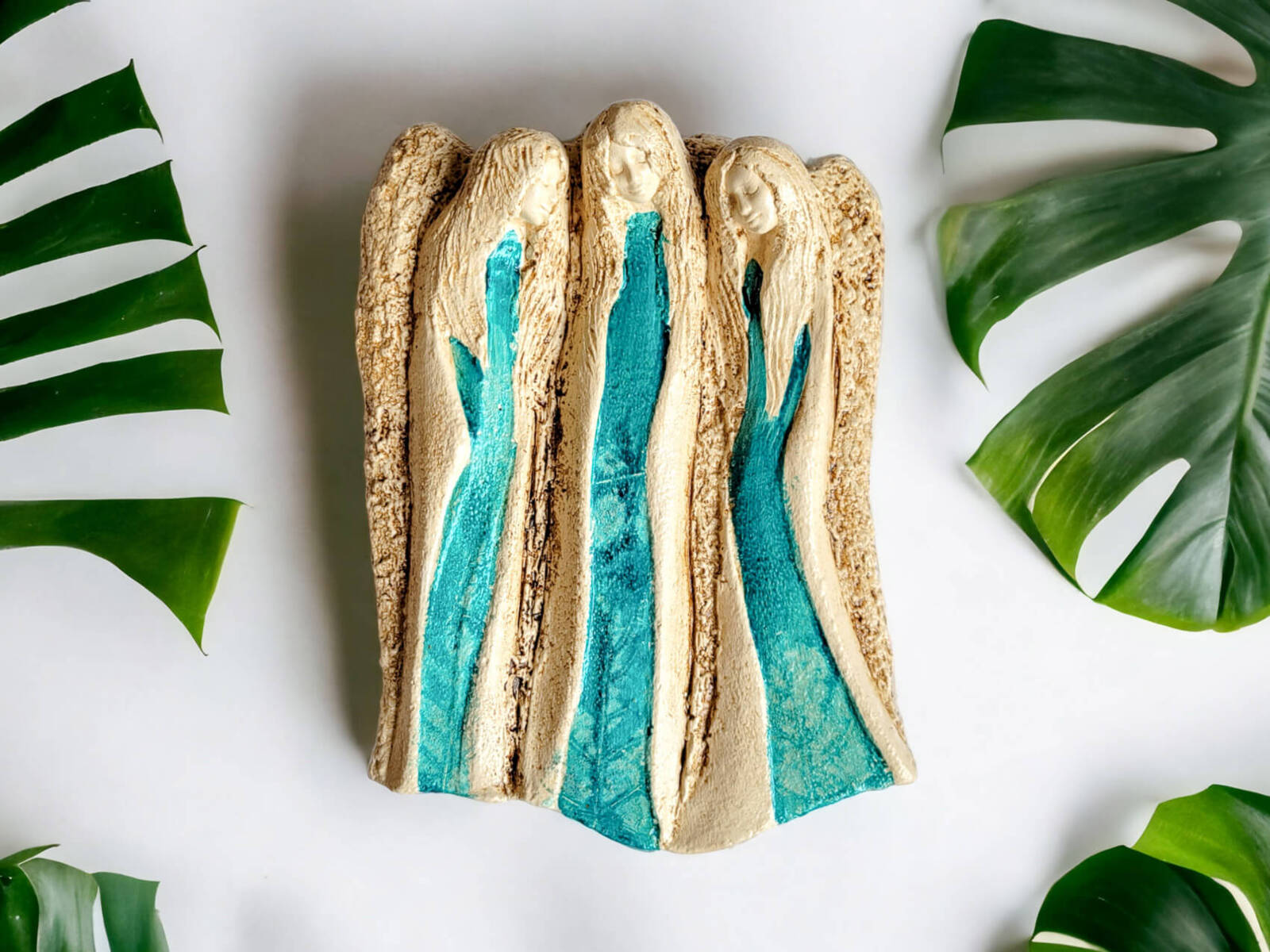 Anioły Wiara Nadzieja Miłość w wersji turkusowej z delikatnymi wzorami liści to wyjątkowe symbole, które niosą ze sobą potężne przesłanie nadziei, wiary i miłości. Ich turkusowy kolor i subtelne wzory liści dodają im delikatności i harmonii, emanując spokojem i optymizmem.