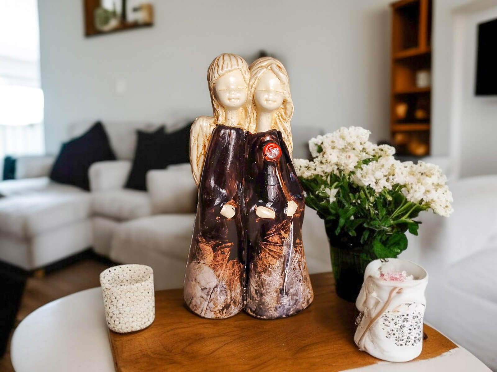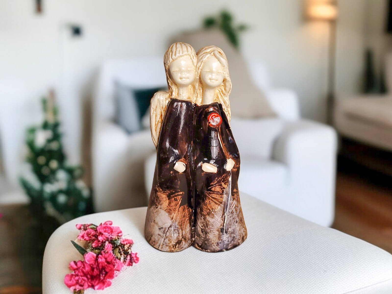 Jeśli anioł ma zostać wręczony jako prezent możemy go również elegancko zapakować w przeźroczysty celofan wiązany ekologicznym sznurkiem. Dzięki temu anioł będzie wyglądał jeszcze bardziej dostojnie i będzie gotowy do wręczenia. Dla wygody możesz również od razu zakupić papierową białą torbę prezentową.