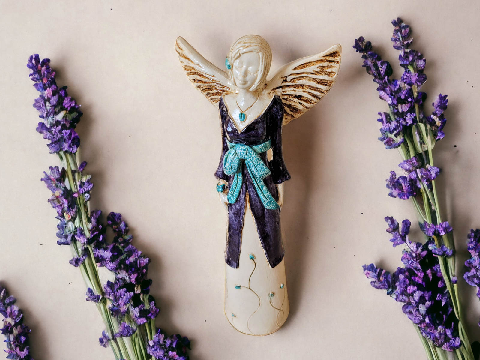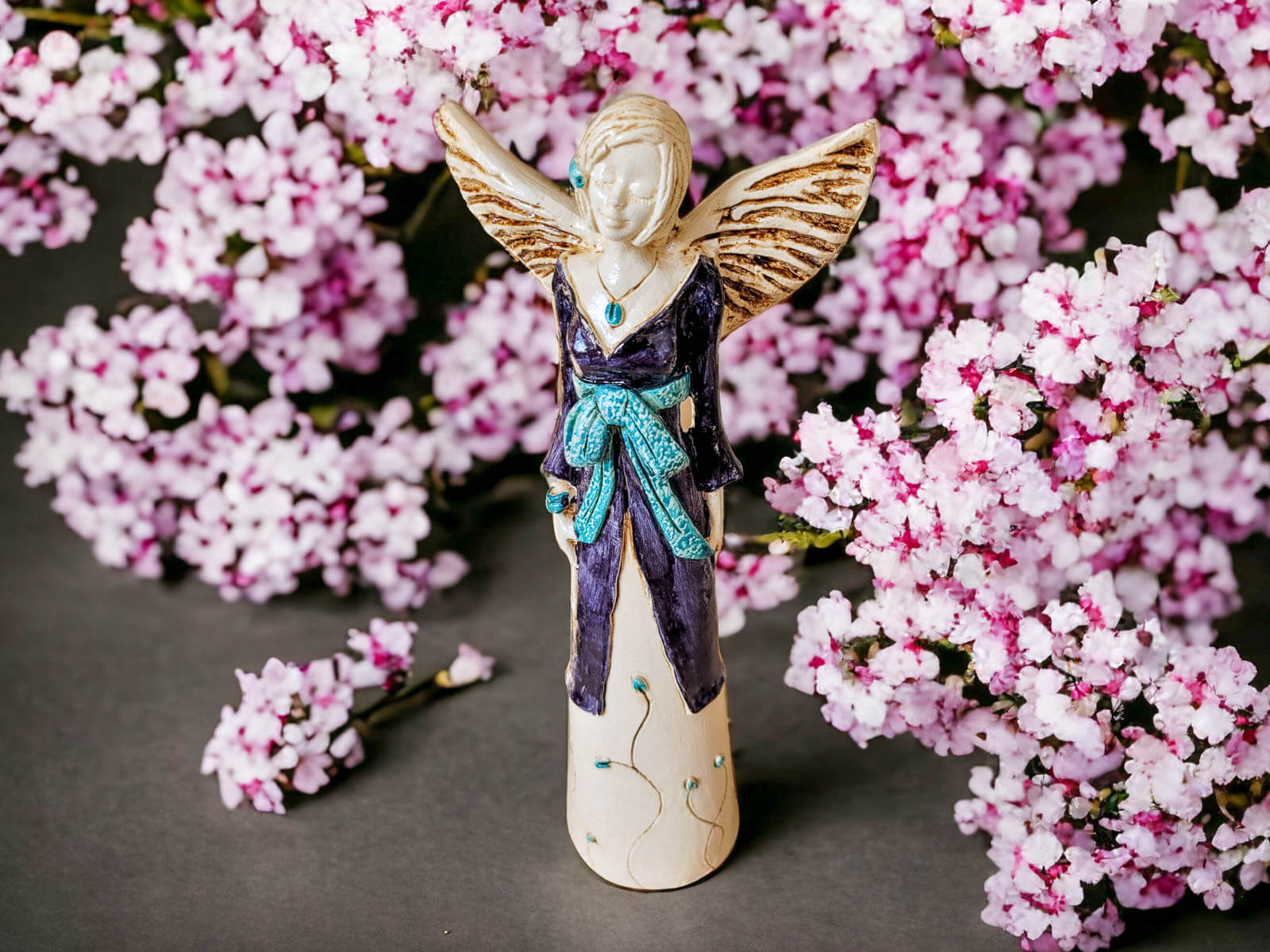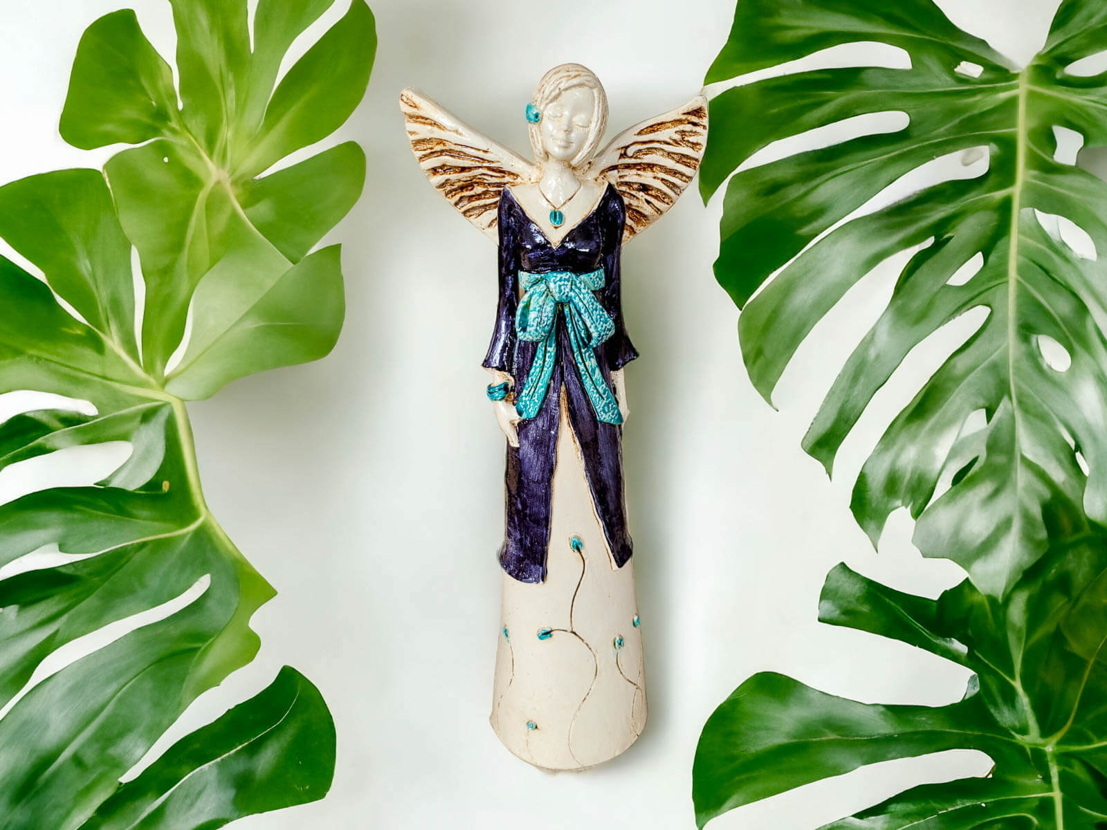 Anioł Lily w kolorze granatowym to ręcznie wykonana figurka. Lily jest niezwykle czarującą i naturalnie piękną kobietą. Stoi wyprostowana, eksponuje elegancką, długą granatowo suknie z turkusową wstęgą. Ma delikatne, rozłożyste skrzydła. Jest na koncercie, gdzie wsłuchuje się w dźwięki muzyki klasycznej. Muzyka zagłusza jej rzeczywistość, dlatego tak bardzo ją kocha. Idealnie nadaje się na prezent dla kobiet. Świetnie ozdobi każde wnętrze.