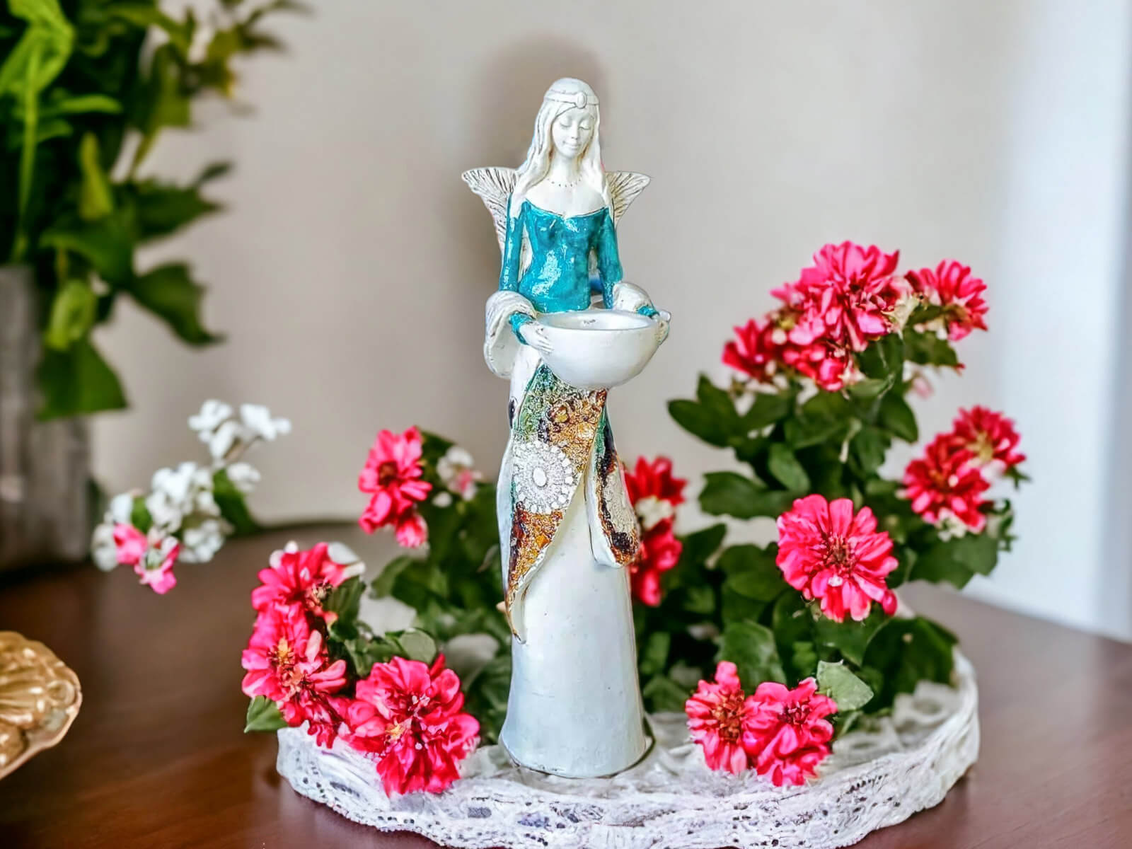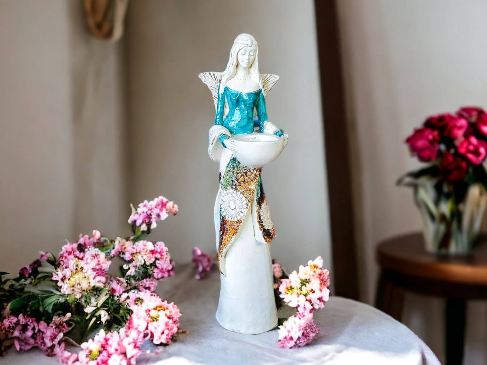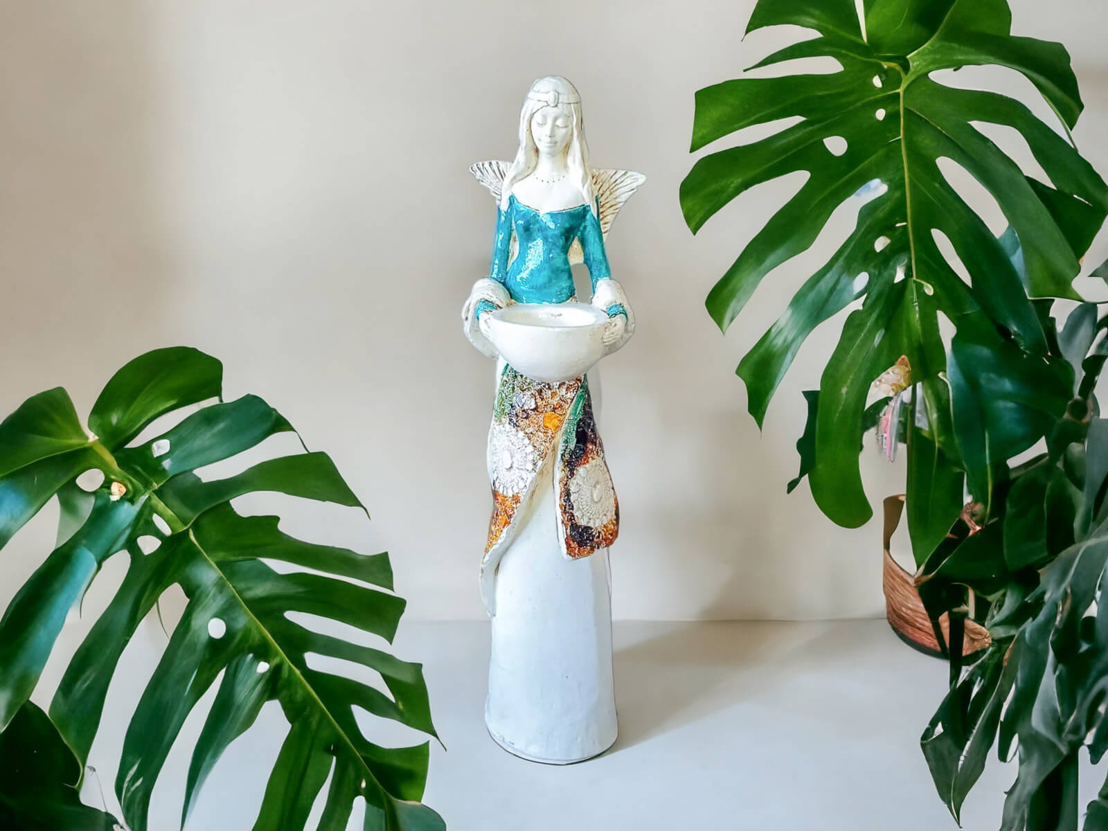 Anioł Florence jest piękną kobietą, która ma na sobie długą suknię oraz jasne włosy sięgające za ramiona. Suknia posiada na górze dłuższą narzutkę w kolorze turkusowym z beżowymi ozdobami znajdującymi się przy jej końcu. Spod narzutki widnieje beżowa halka. Florence lubi biżuterię, ponieważ ma koralikowy naszyjnik oraz opaskę na głowie z okrągłą ozdobą. Jej skrzydła są małej wielkości uniesione do góry. W rękach trzyma wazę, do której można włożyć małą świeczkę i sprawić romantyczny klimat. Figurka wykonana jest z gipsu ręcznej produkcji. Należy do figurek stojących, dzięki czemu można ją gdziekolwiek postawić. Niezależnie od miejsca na pewno będzie przyciągać każdego uwagę. Anioł Florence idealnie nadaje się na prezent dla kobiety lub babci.