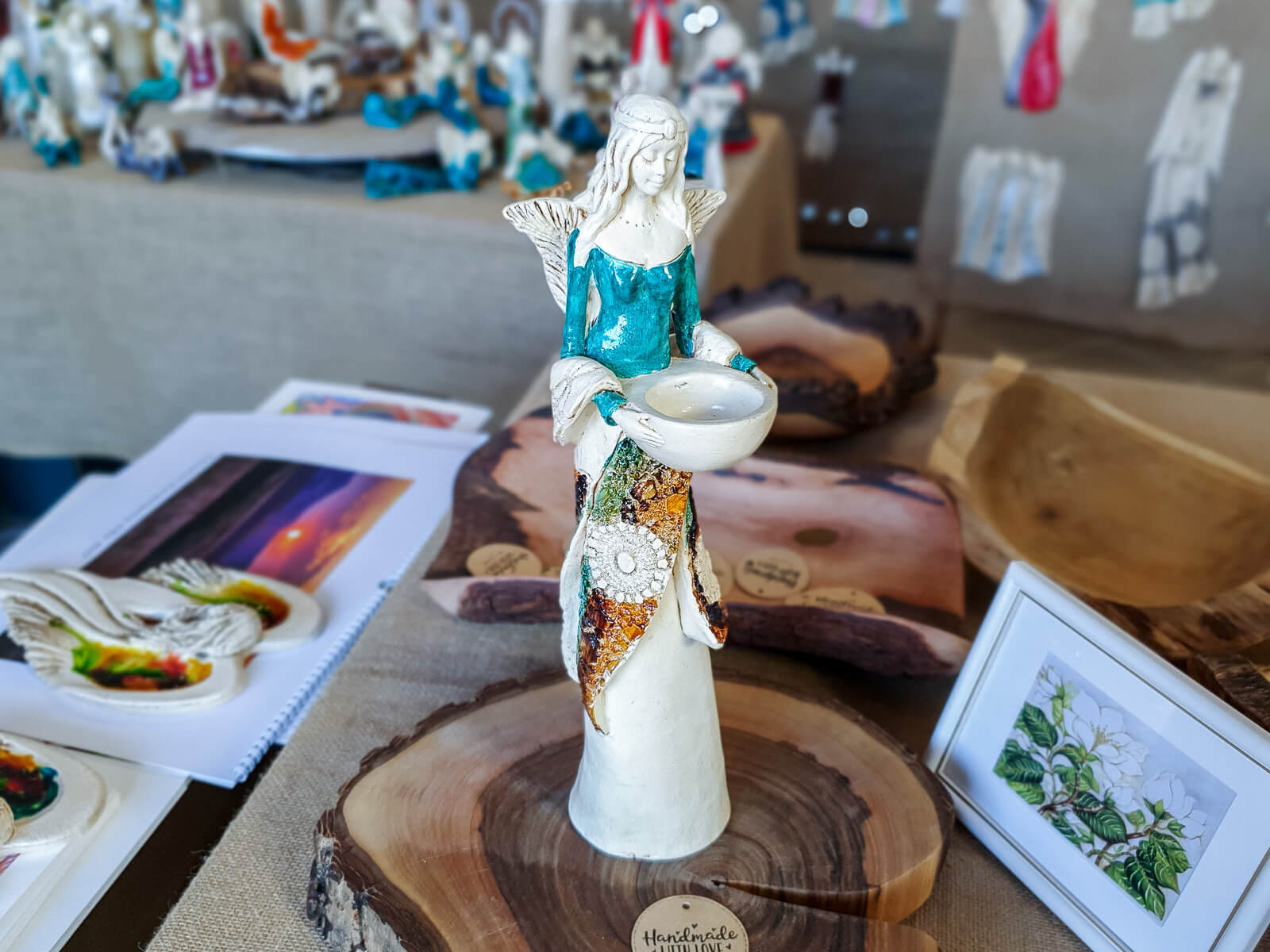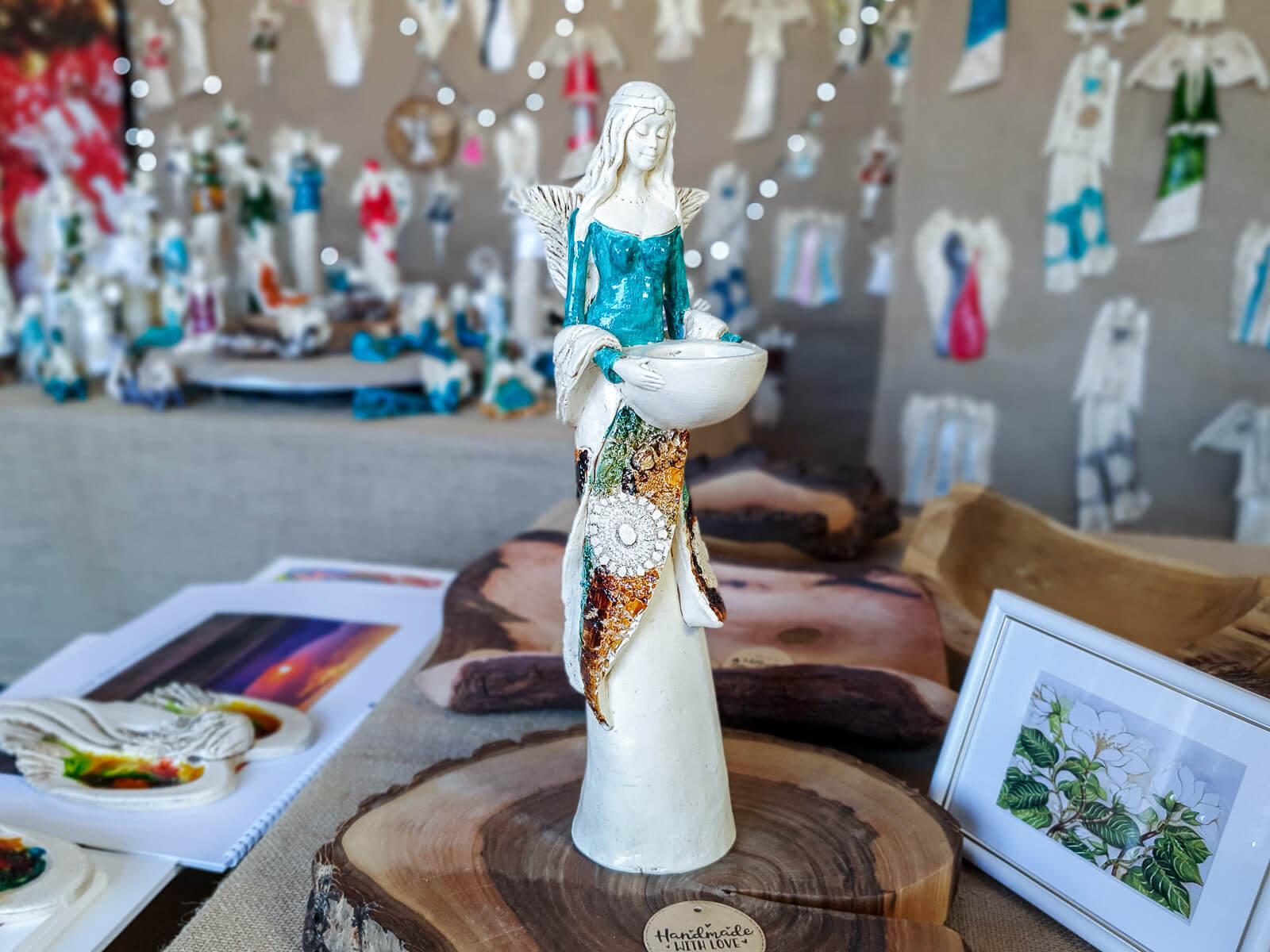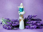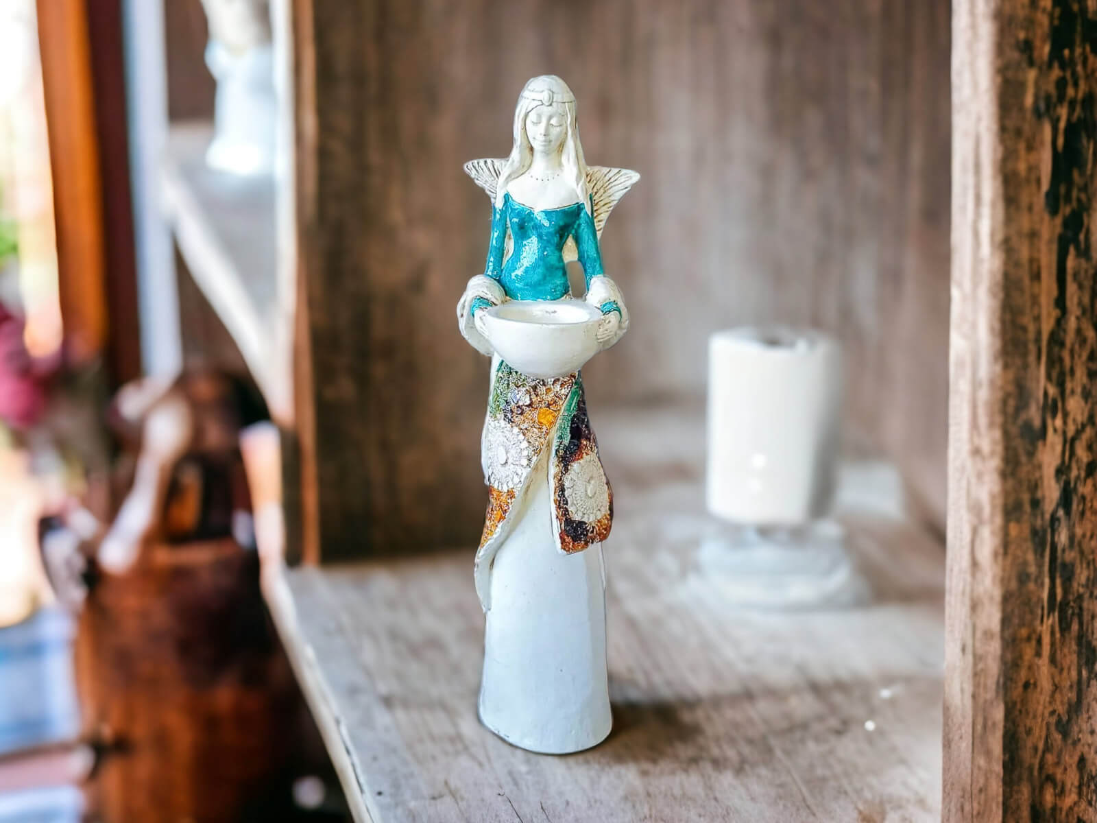 Anioł Florence jest piękną kobietą, która ma na sobie długą suknię oraz jasne włosy sięgające za ramiona. Suknia posiada na górze dłuższą narzutkę w kolorze turkusowym z beżowymi ozdobami znajdującymi się przy jej końcu. Spod narzutki widnieje beżowa halka. Florence lubi biżuterię, ponieważ ma koralikowy naszyjnik oraz opaskę na głowie z okrągłą ozdobą. Jej skrzydła są małej wielkości uniesione do góry. W rękach trzyma wazę, do której można włożyć małą świeczkę i sprawić romantyczny klimat. Figurka wykonana jest z gipsu ręcznej produkcji. Należy do figurek stojących, dzięki czemu można ją gdziekolwiek postawić. Niezależnie od miejsca na pewno będzie przyciągać każdego uwagę. Anioł Florence idealnie nadaje się na prezent dla kobiety lub babci.