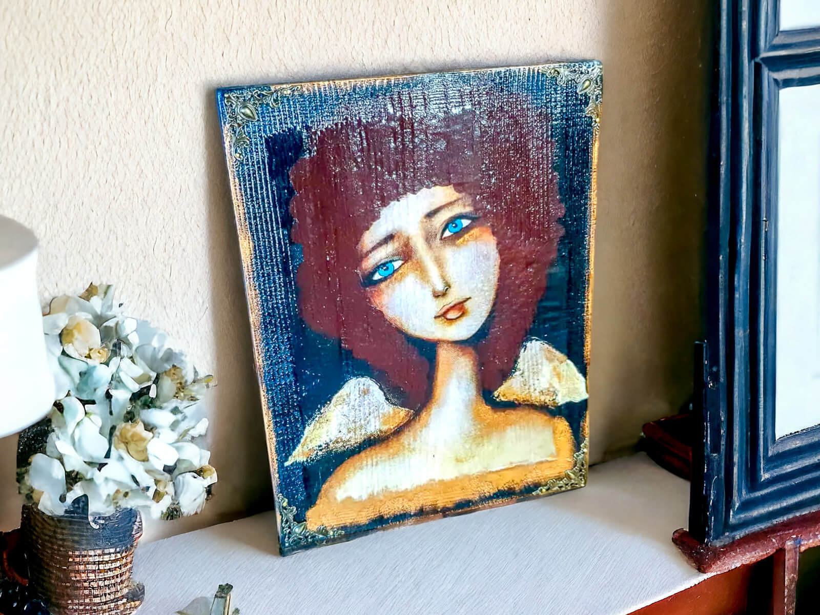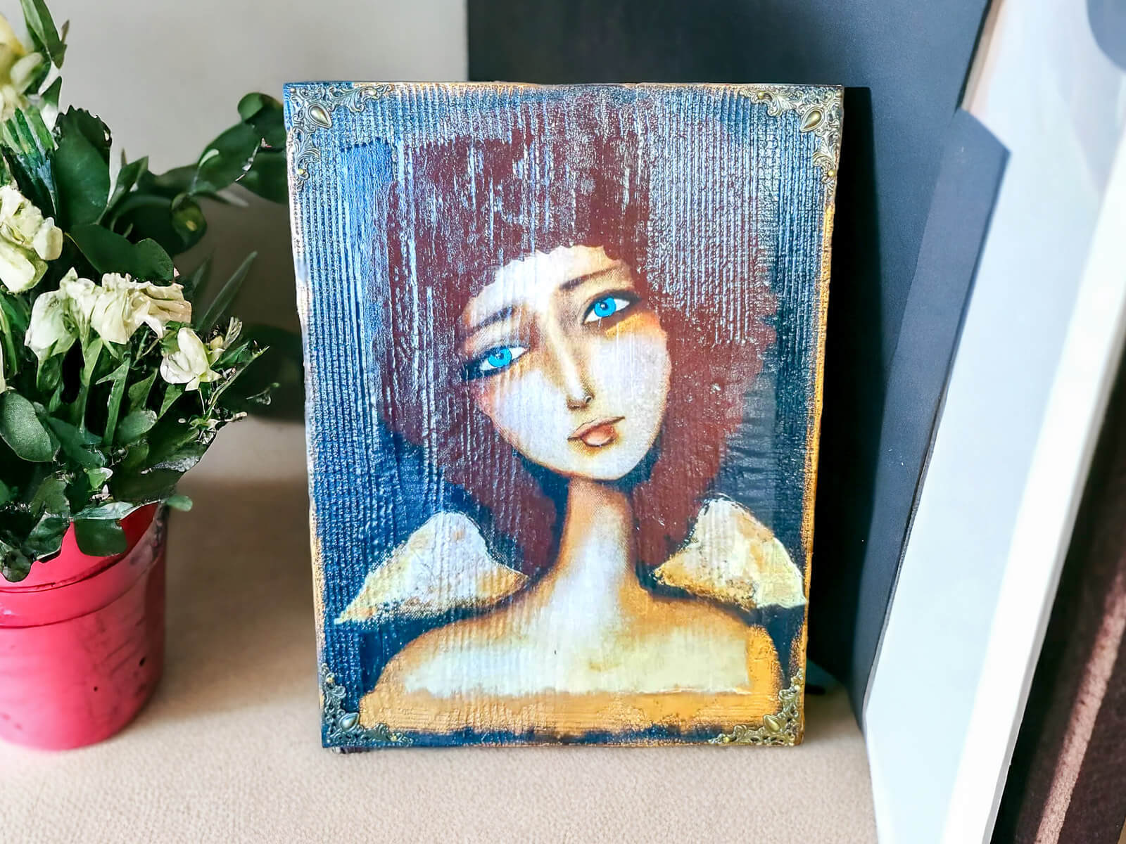 Intrygujący obraz anioła o imieniu Kalina. Obraz wykonany na desce w rozmiarze 22.5 x 29.5 cm z klamrami w rogach. Idealny na prezent.