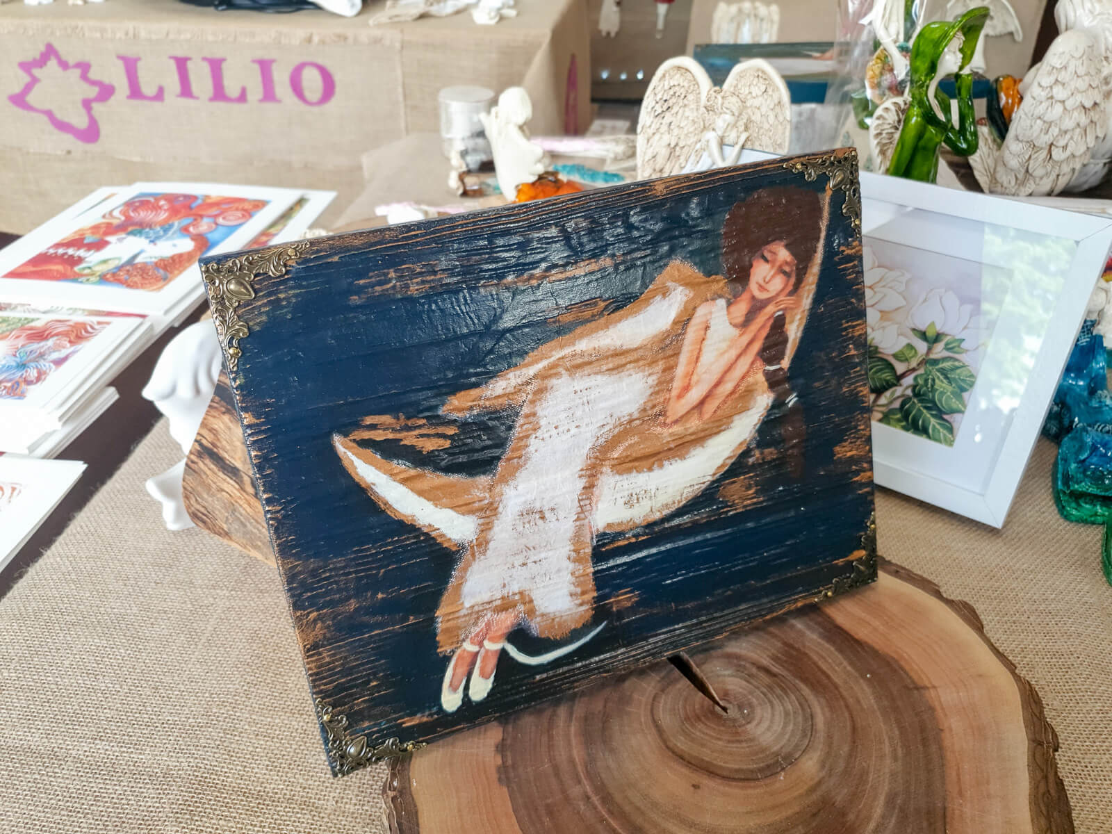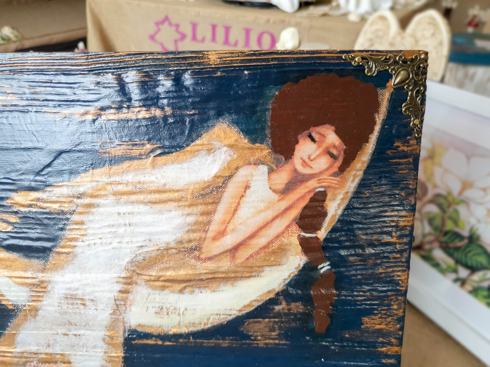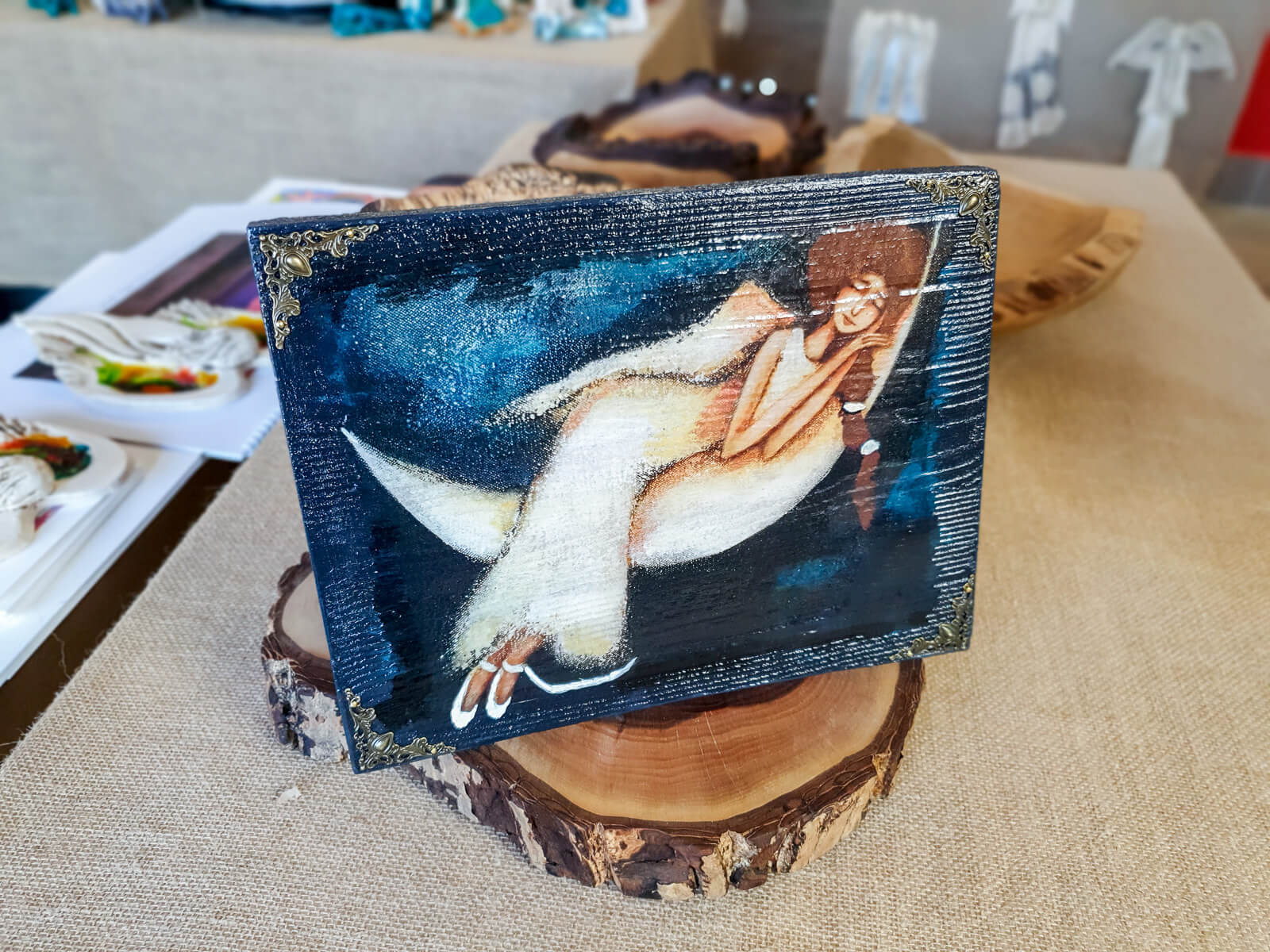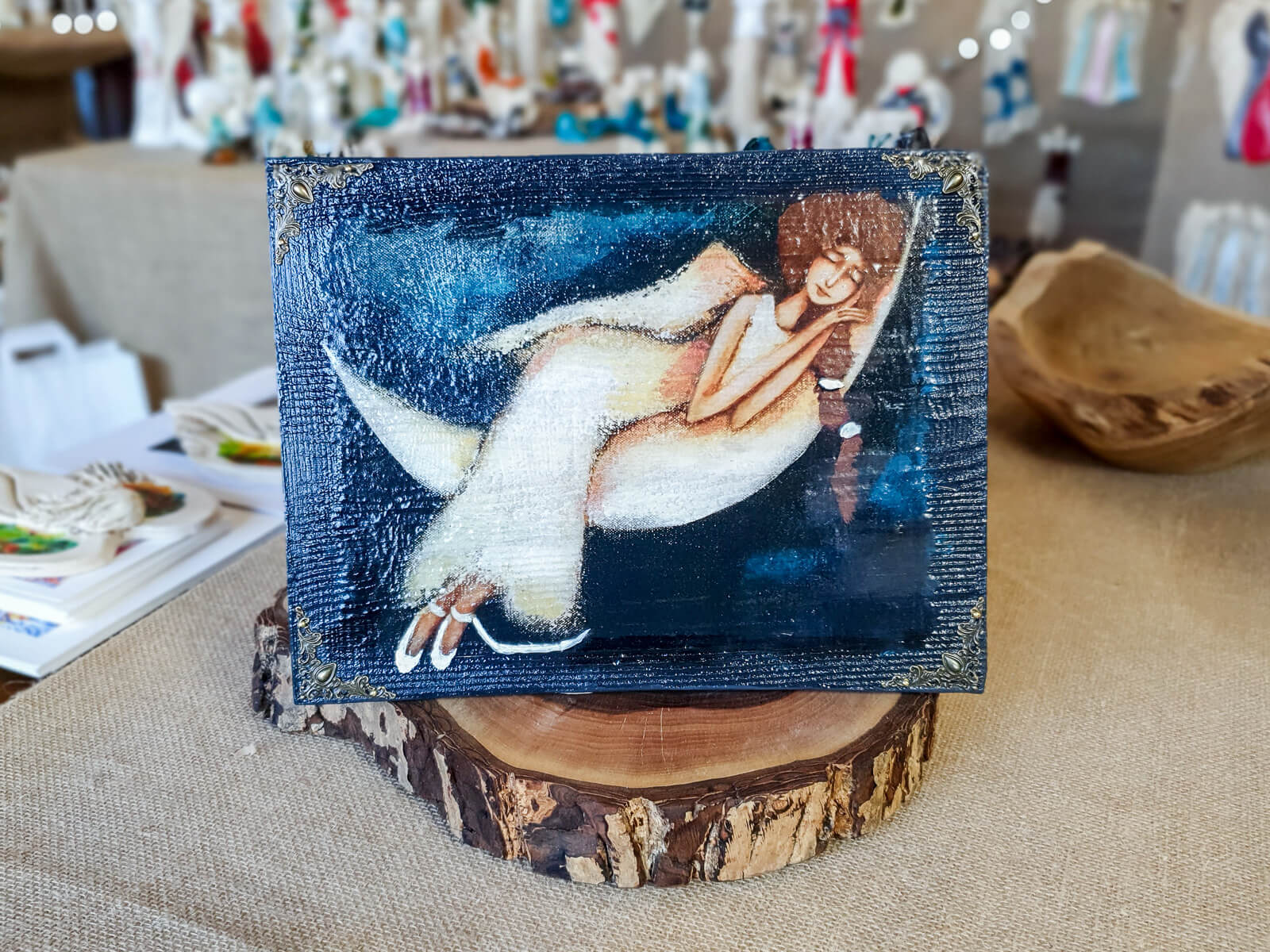 Intrygujący obraz anioła o imieniu Alina Śpiochna. Obraz wykonany na desce w rozmiarze 29.5 x 22.5 cm, z klamrami w rogach. Idealny na prezent.