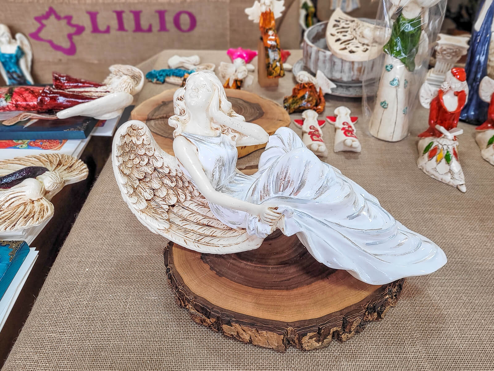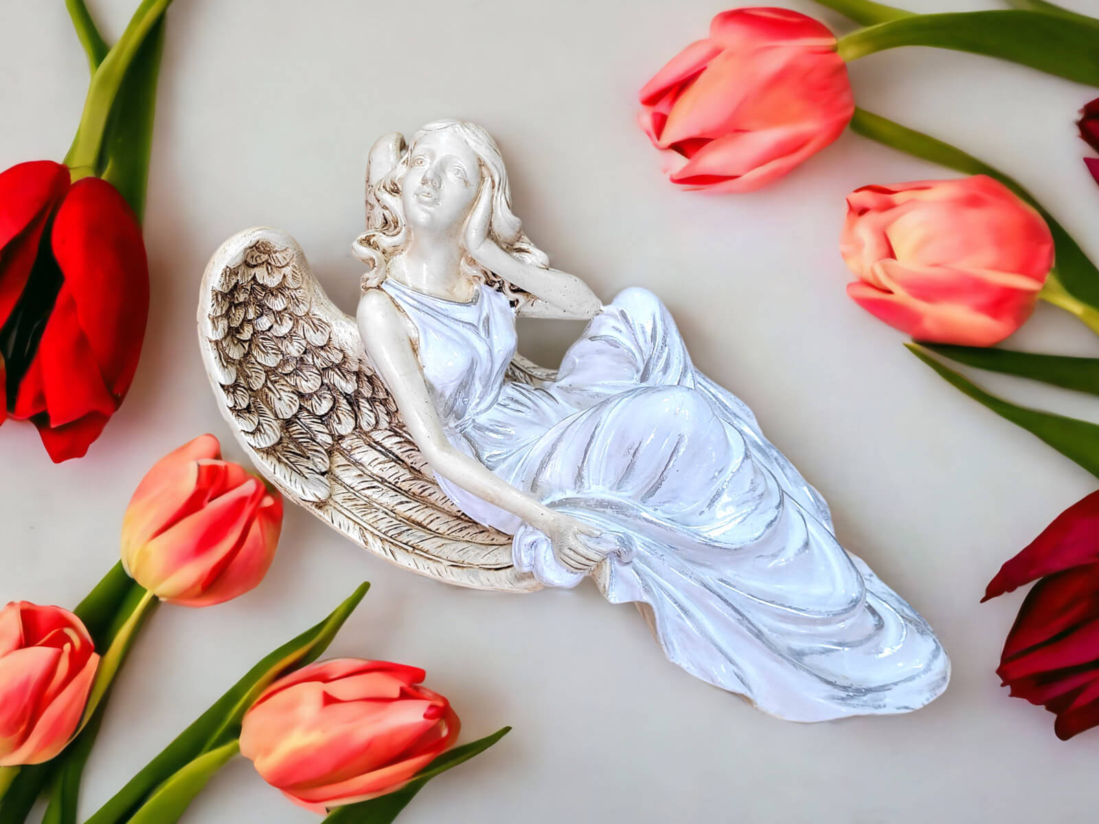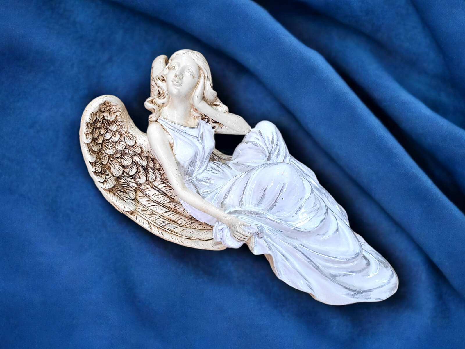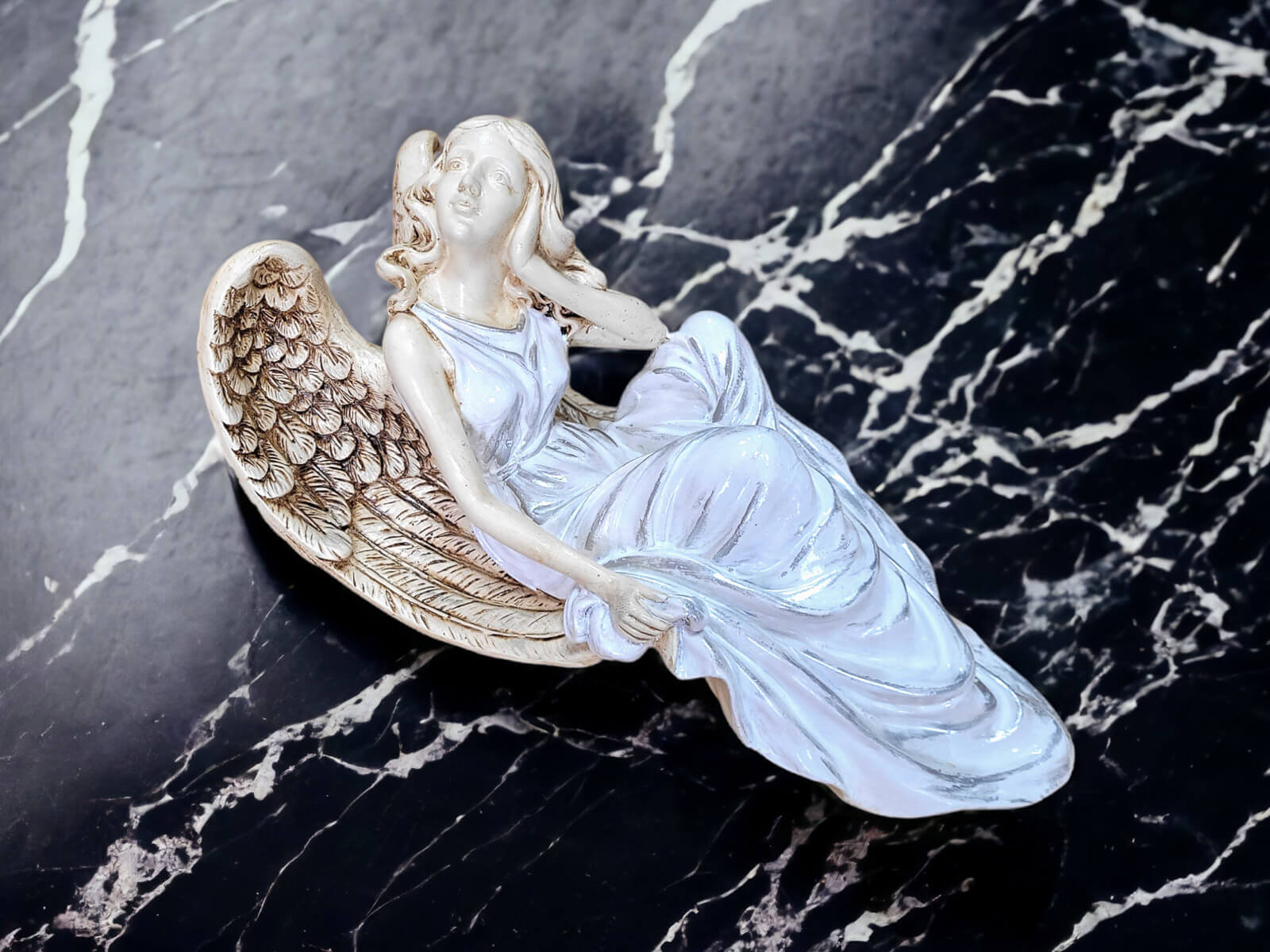 Figurka anioła od Świętej Rity w kolorze białym ze srebrnymi przetarciami. Jak mówi legenda za każdym razem gdy Święta Rita modliła się do Boga z nieba schodził Anioł. Święta Rita to protektorka wszystkich zmartwień i trosk. Jest to Anioł romantyczny i delikatny, który pomaga w sprawach trudnych a nawet beznadziejnych. Specjalna wersja kolorystyczna na prezent na I Komunię jak i na inne okazje.