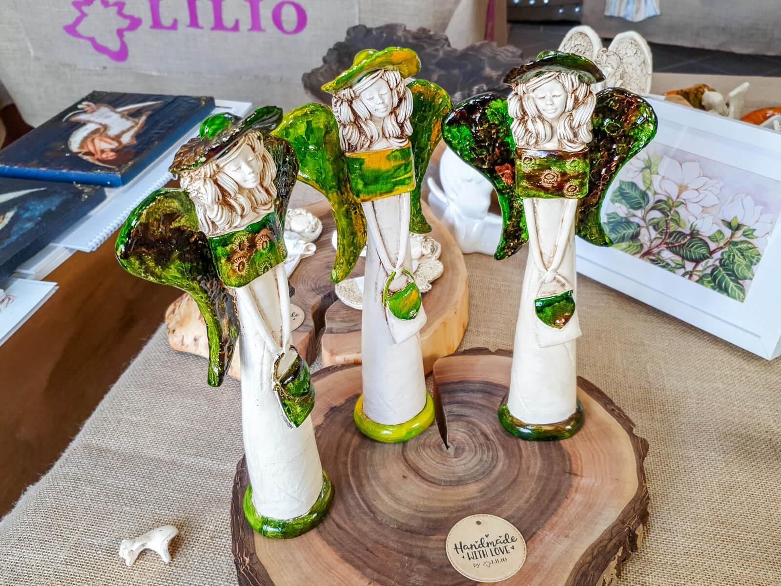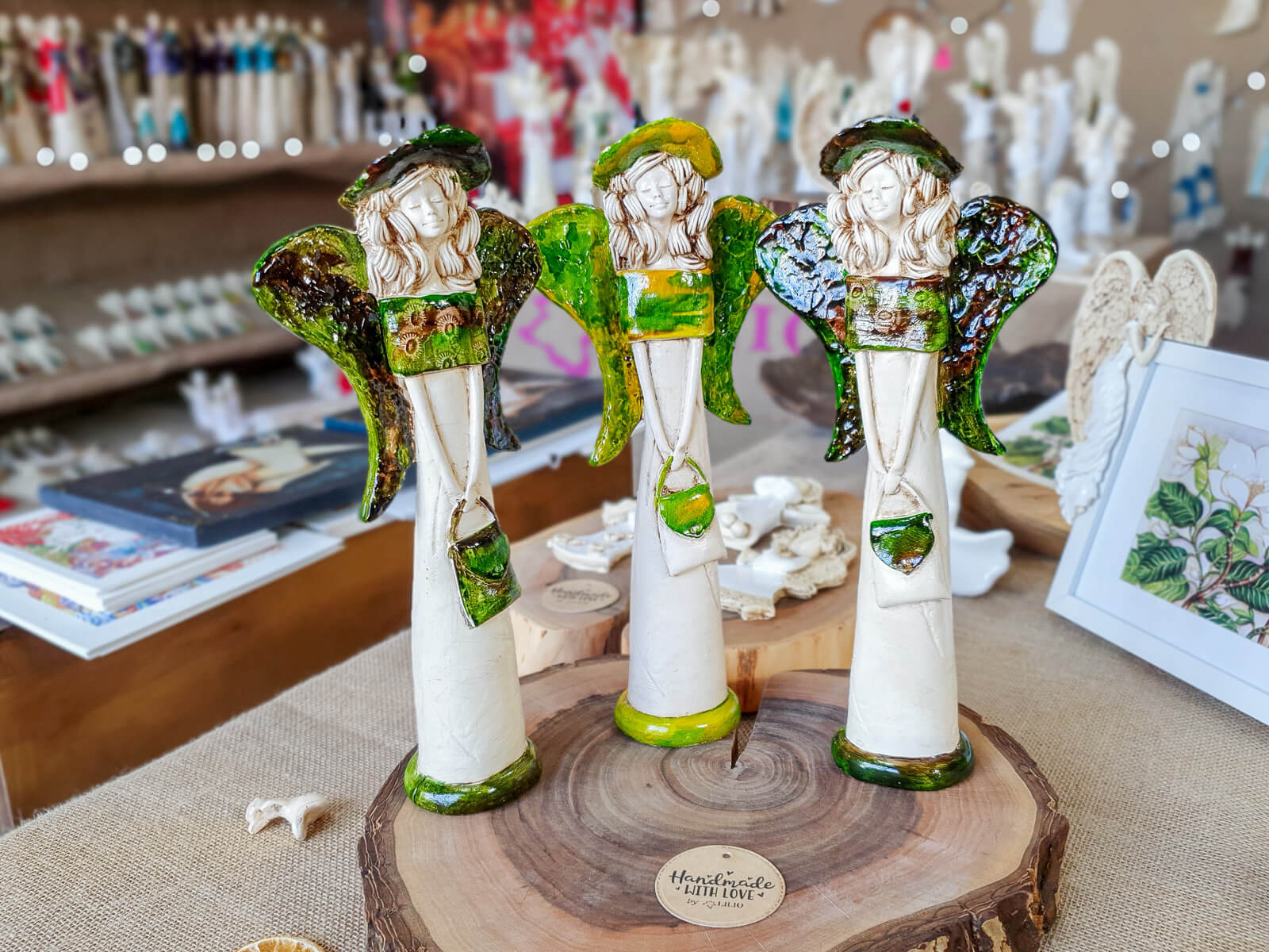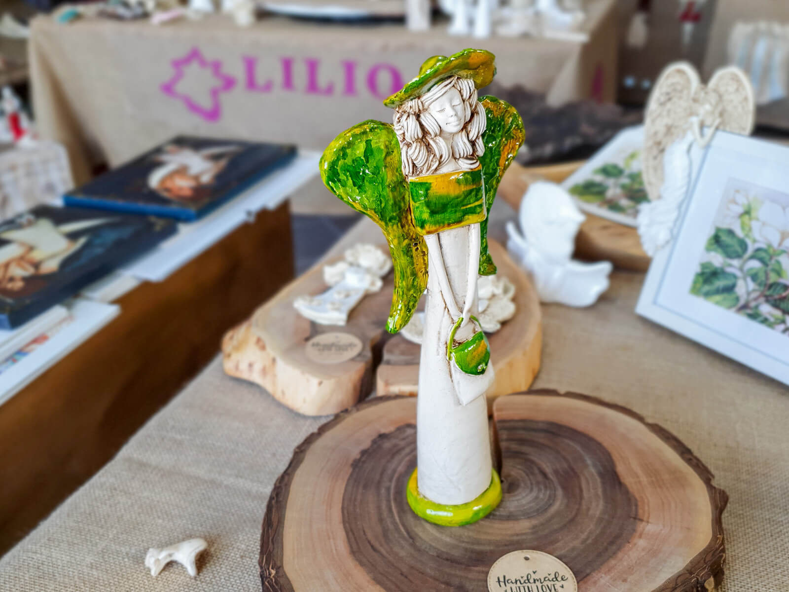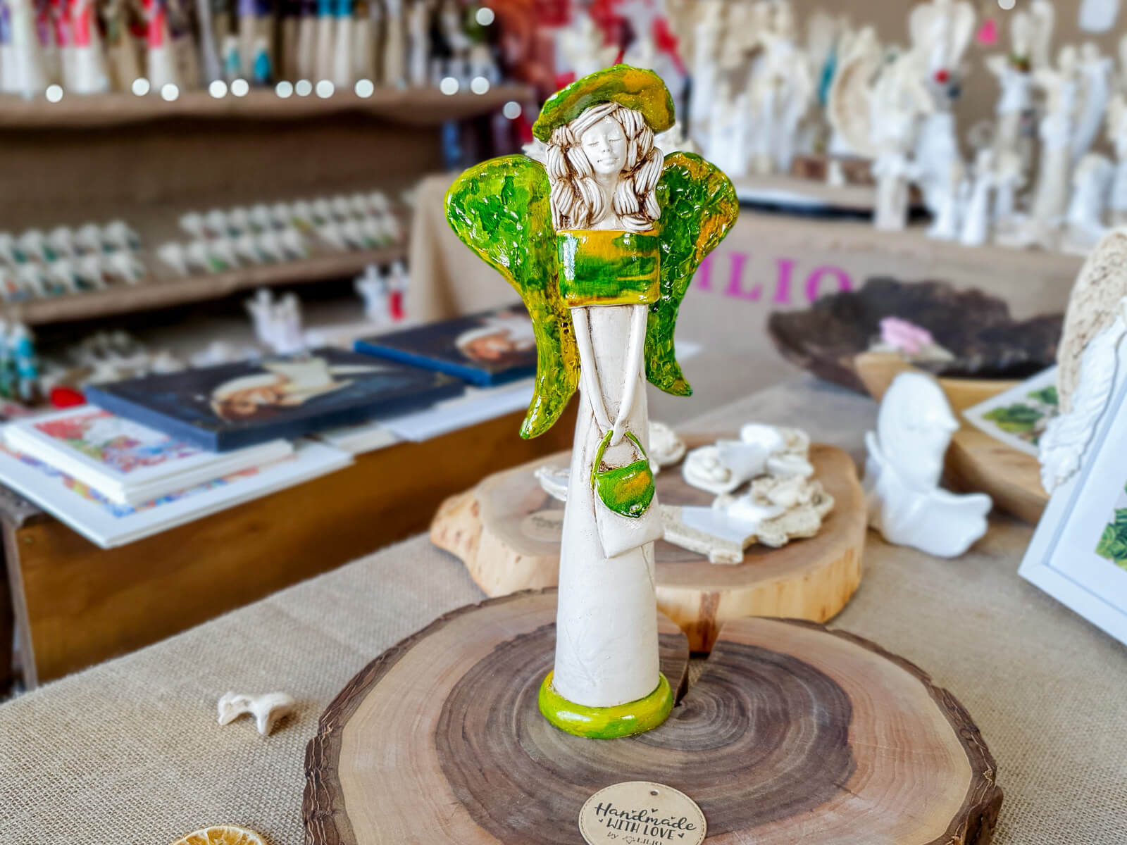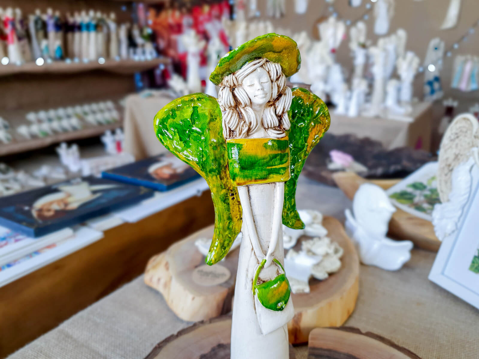 Anioł Coco zdecydowanie wyróżnia się na tle innych figurek. Anioł na burzę blond loków, smukłą sylwetkę i ogrom gracji. Nosi dumnie swój czarny kapelusz, a suknia w tonacjach jasnej zieleni i pomarańczu leży wręcz idealnie. Podobnie niezwykłe są jej skrzydła - niesamowita kompozycja barw rozmieszczona na ogromnych, rozłożystych piórach. Anioł Coco podarowany w prezencie z pewnością wywoła dużo radości u Twoich najbliższych.