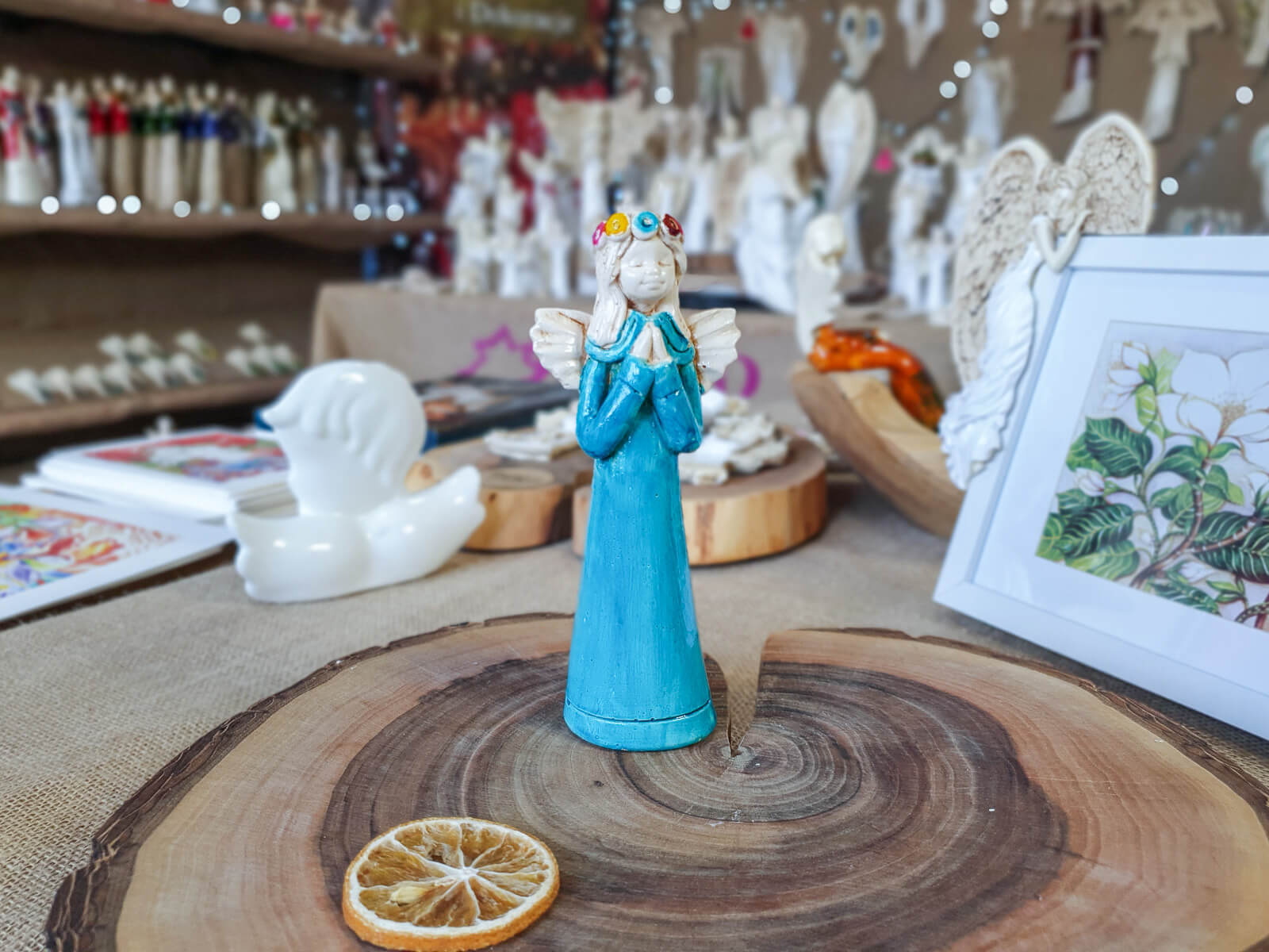 Aniołek Eva to urocza figurka dziewczynki w turkusowej sukience, która delikatnie opada wzdłuż jej małego ciała, emanuje czystością i niewinnością. Na główce ma wianek spleciony z delikatnych kwiatów, które podkreślają jej anielski urok. Jej ręce złożone w modlitwie wyrażają spokój i pokorę.