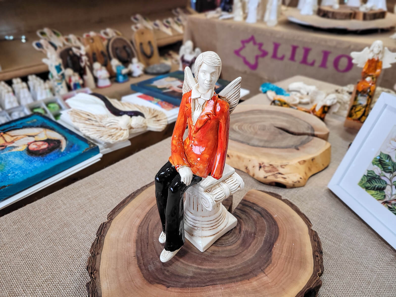 Anioły Młoda Para to ręcznie wykonana figurka. Czekają na ceremonię ślubną. Pan Młody ubrany jest w pomarańczowy garnitur. Panna Młoda ma na sobie krótką, pomarańczową sukienkę. W ręku trzyma bukiet z róż. Anioły są świetny pomysłem na prezent ślubny lub dekorację ślubną. Pięknie mogą ozdobić stół na przyjęciu weselnym.