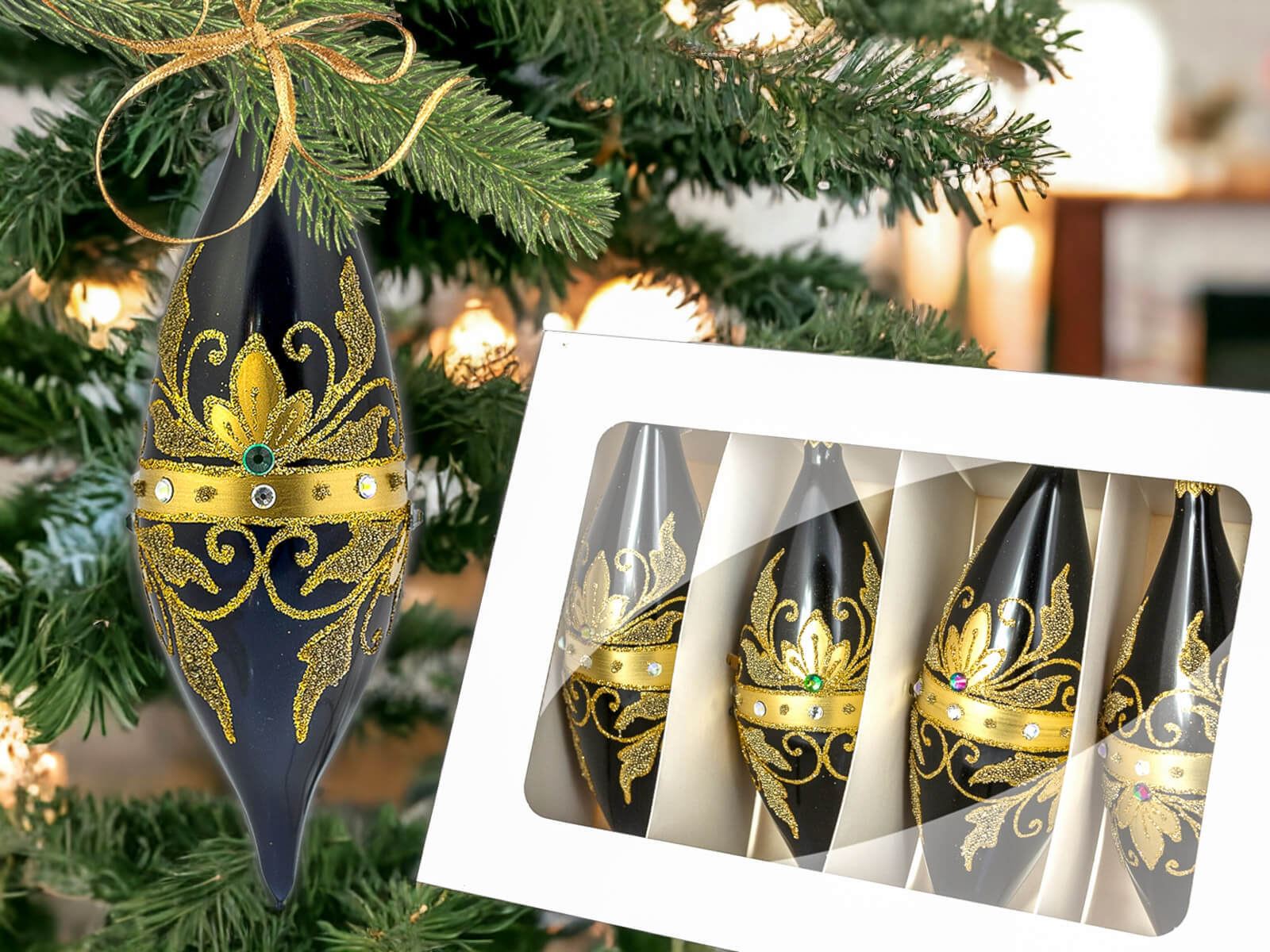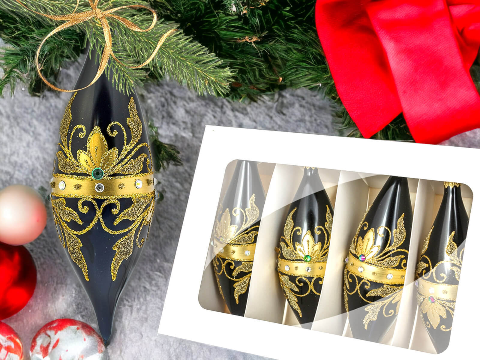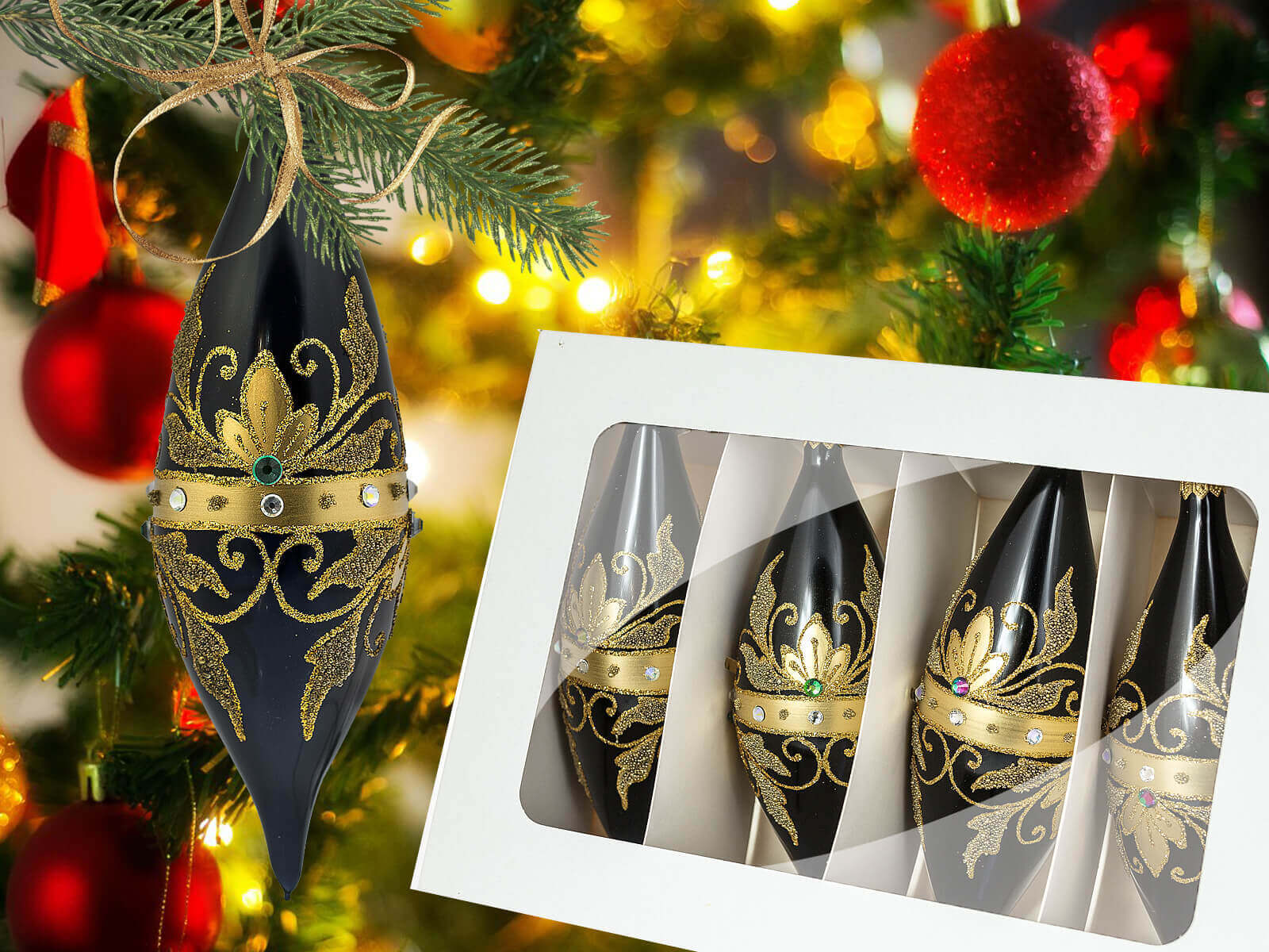 W komplecie znajdują się cztery bombki, starannie pakowane w elegancki kartonik z okienkiem. To nie tylko zabezpiecza je przed ewentualnymi uszkodzeniami, ale także pozwala podziwiać ich piękno jeszcze przed otwarciem opakowania.