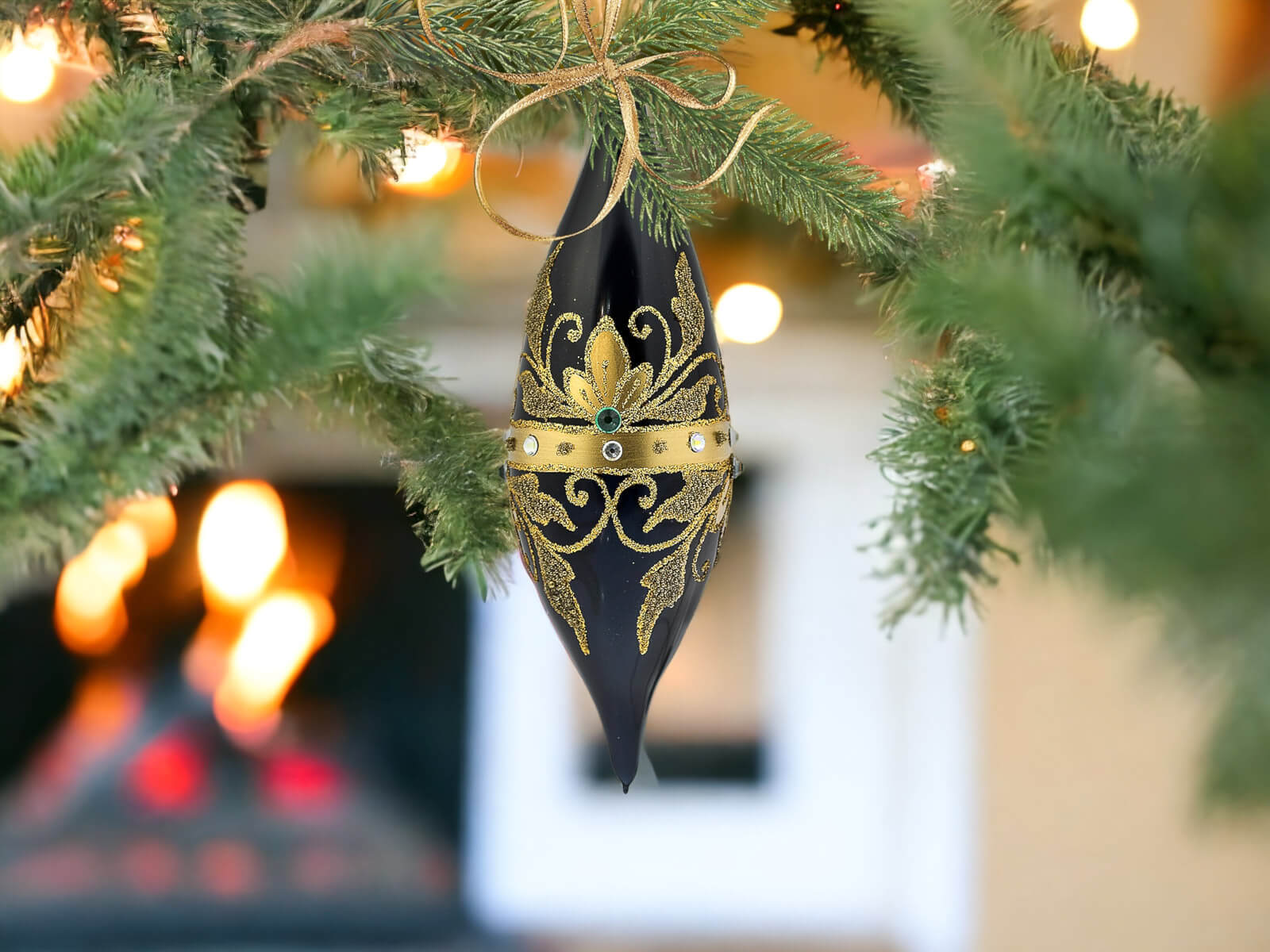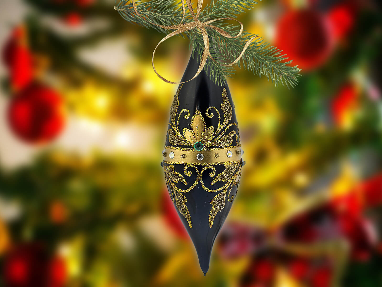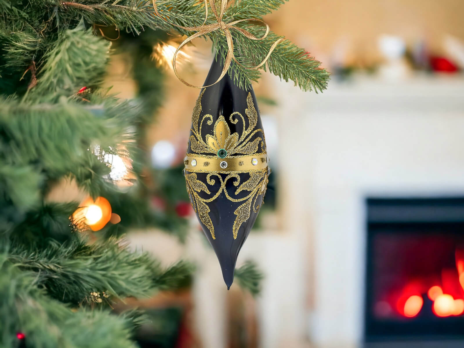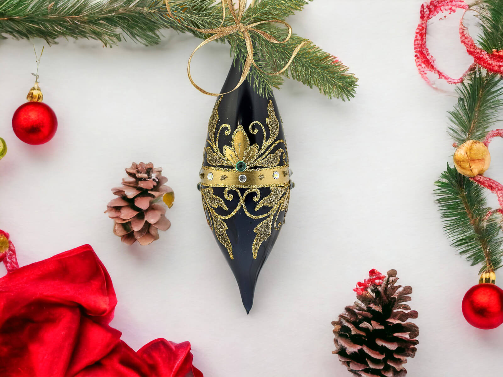 Czarna porcelana stanowi eleganckie tło dla bogatych, złotych zdobień, które zdobią sople na powierzchni każdej z bombek. Złote elementy, precyzyjnie ręcznie nanoszone, nadają bombkom wyjątkowego blasku, tworząc efektowny zestaw, który z pewnością przyciągnie uwagę i stworzy wyjątkowy klimat świąt Bożego Narodzenia.
