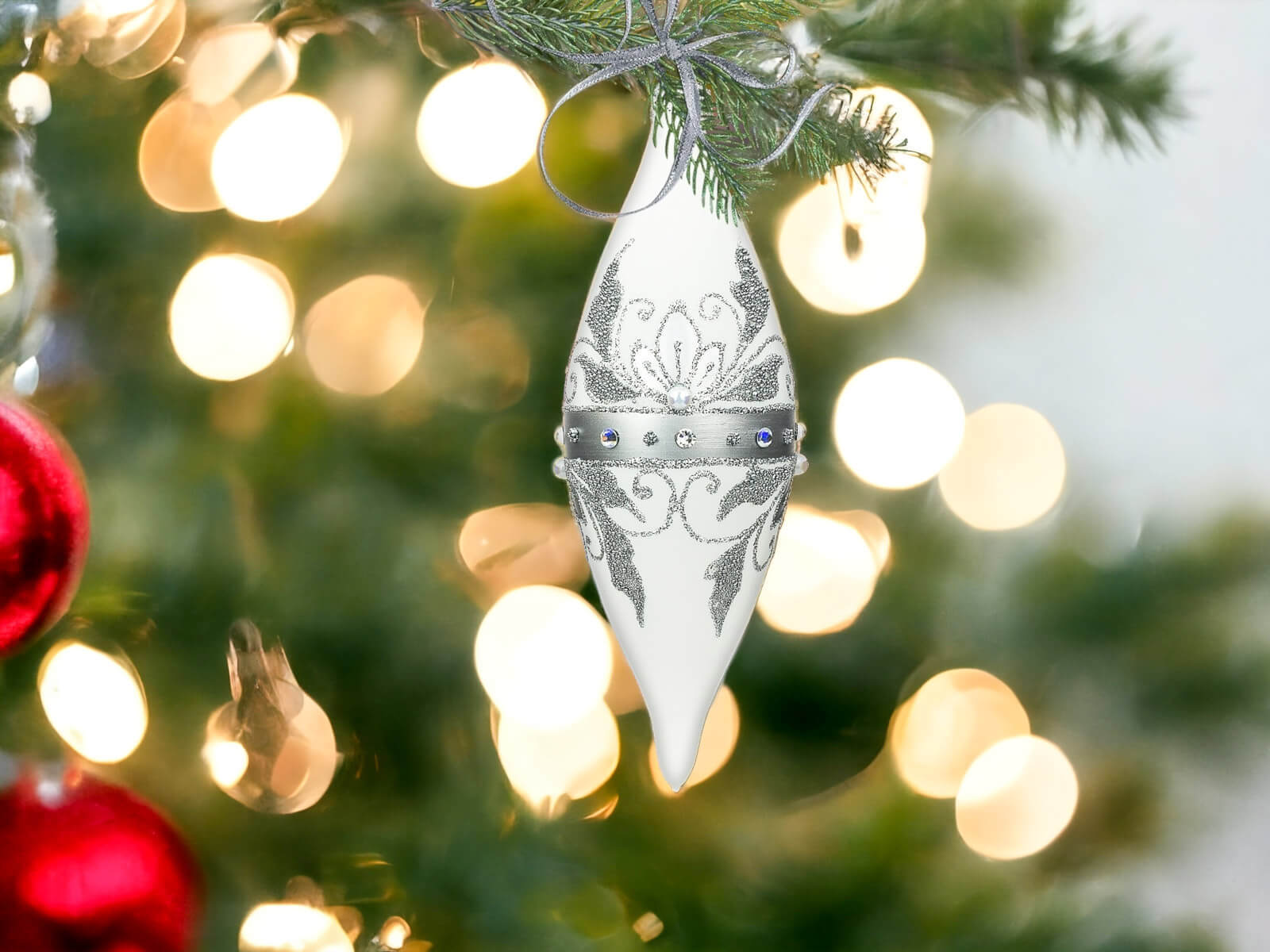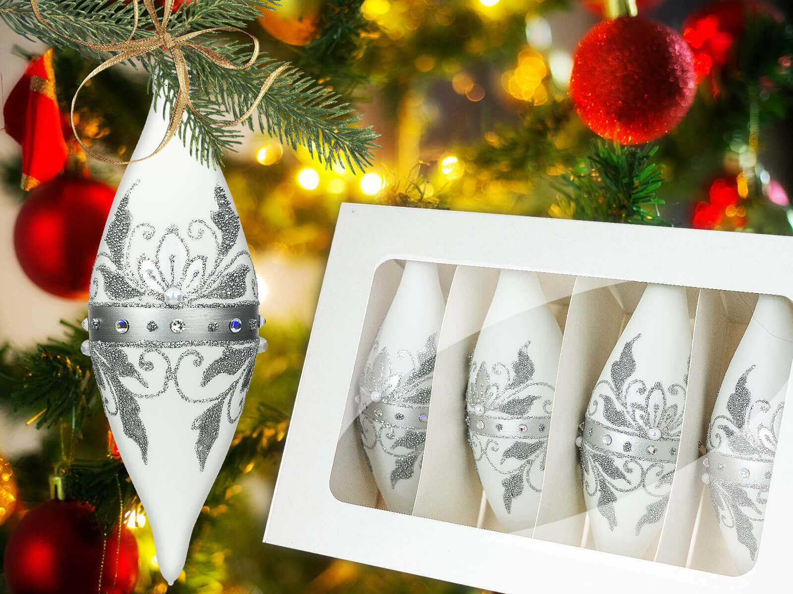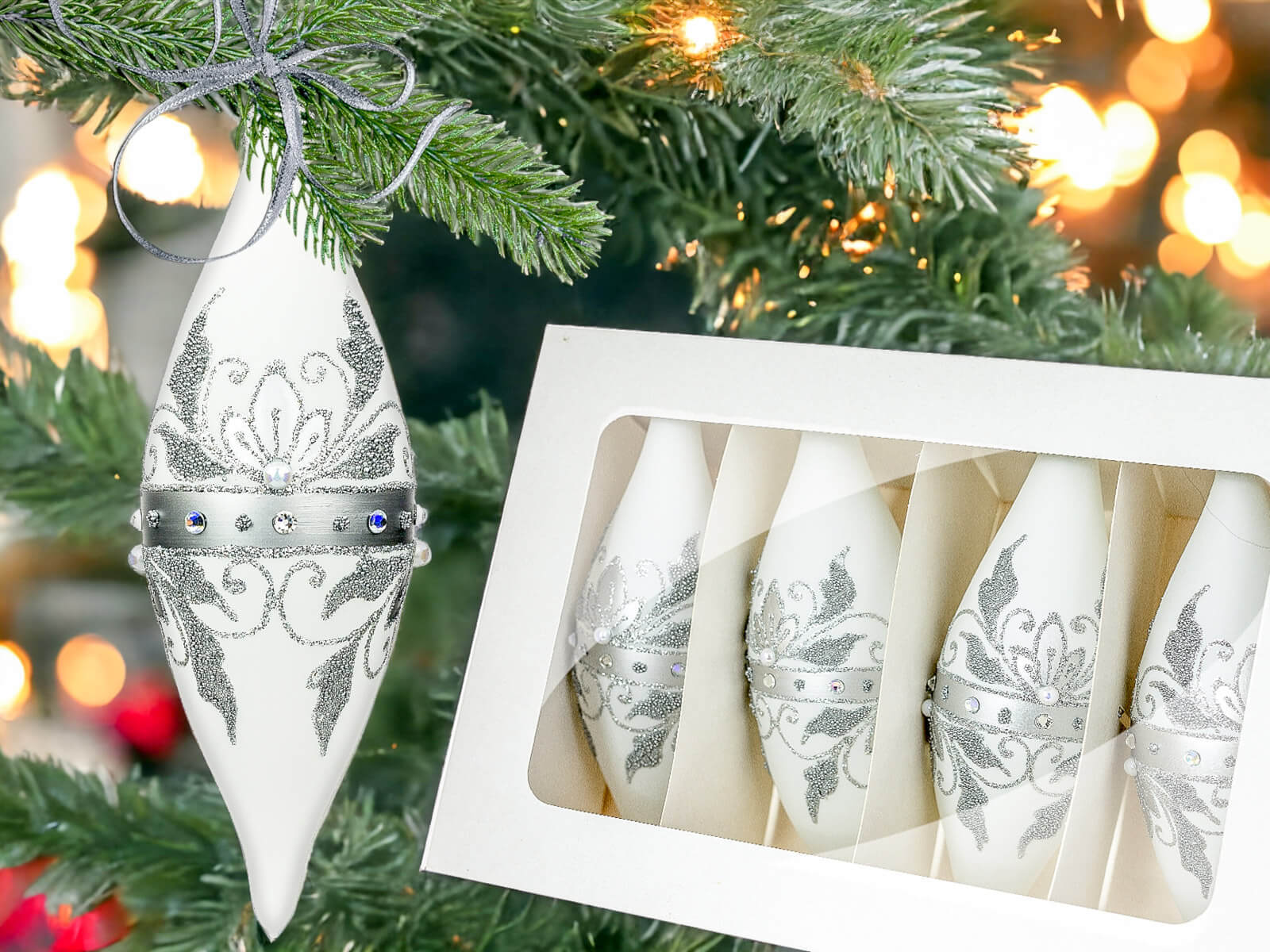 Białe tło bombek nadaje im delikatności, podkreślając jednocześnie intensywność srebrnych zdobień. Te eleganckie dekoracje nie tylko urozmaicą choinkę, ale również staną się wyjątkowym elementem wystroju wnętrza. To doskonały pomysł na prezent dla bliskiej osoby, którą chcemy obdarować czymś pięknym, trwałym i jednocześnie pełnym świątecznego magicznego klimatu.