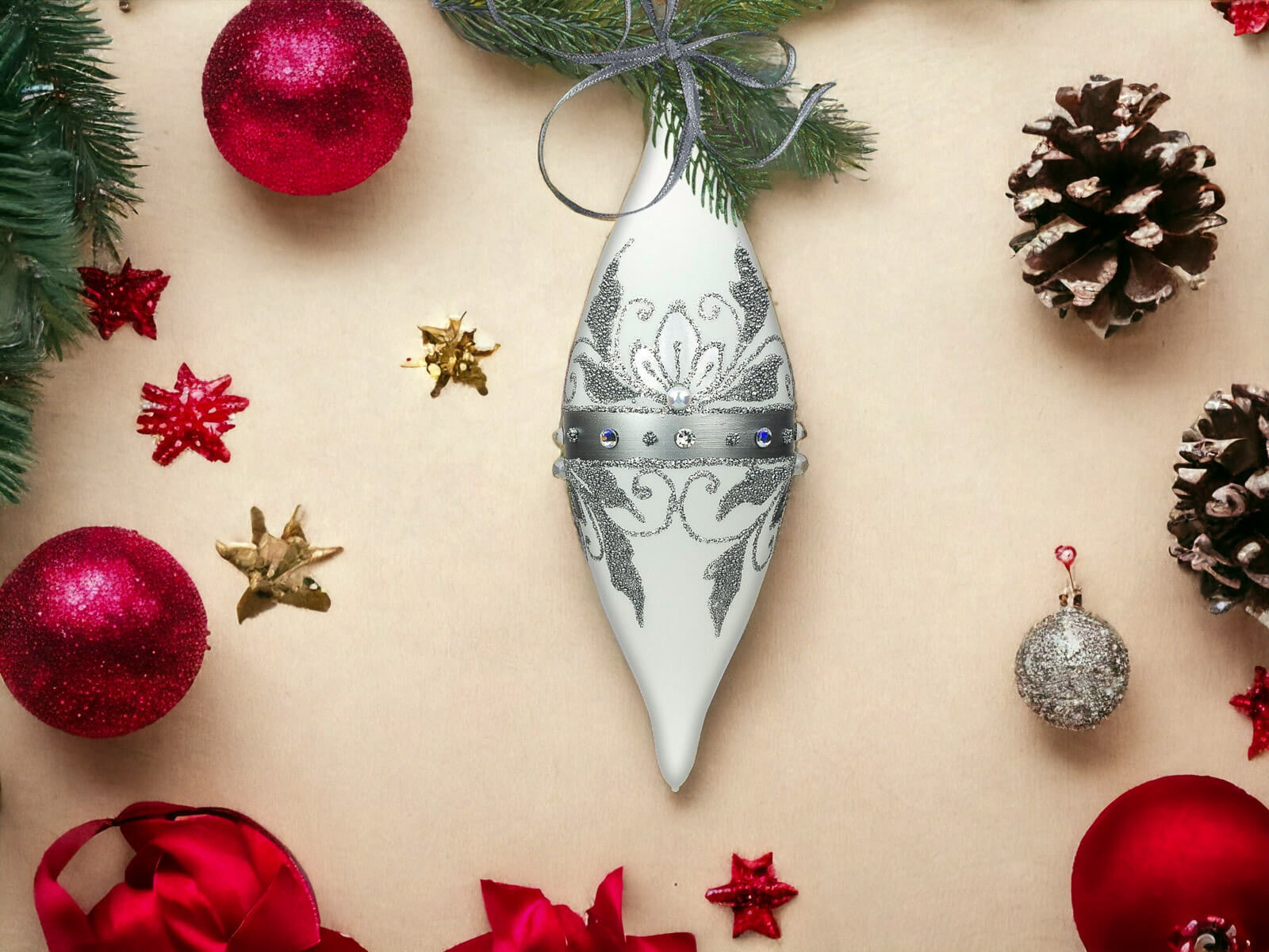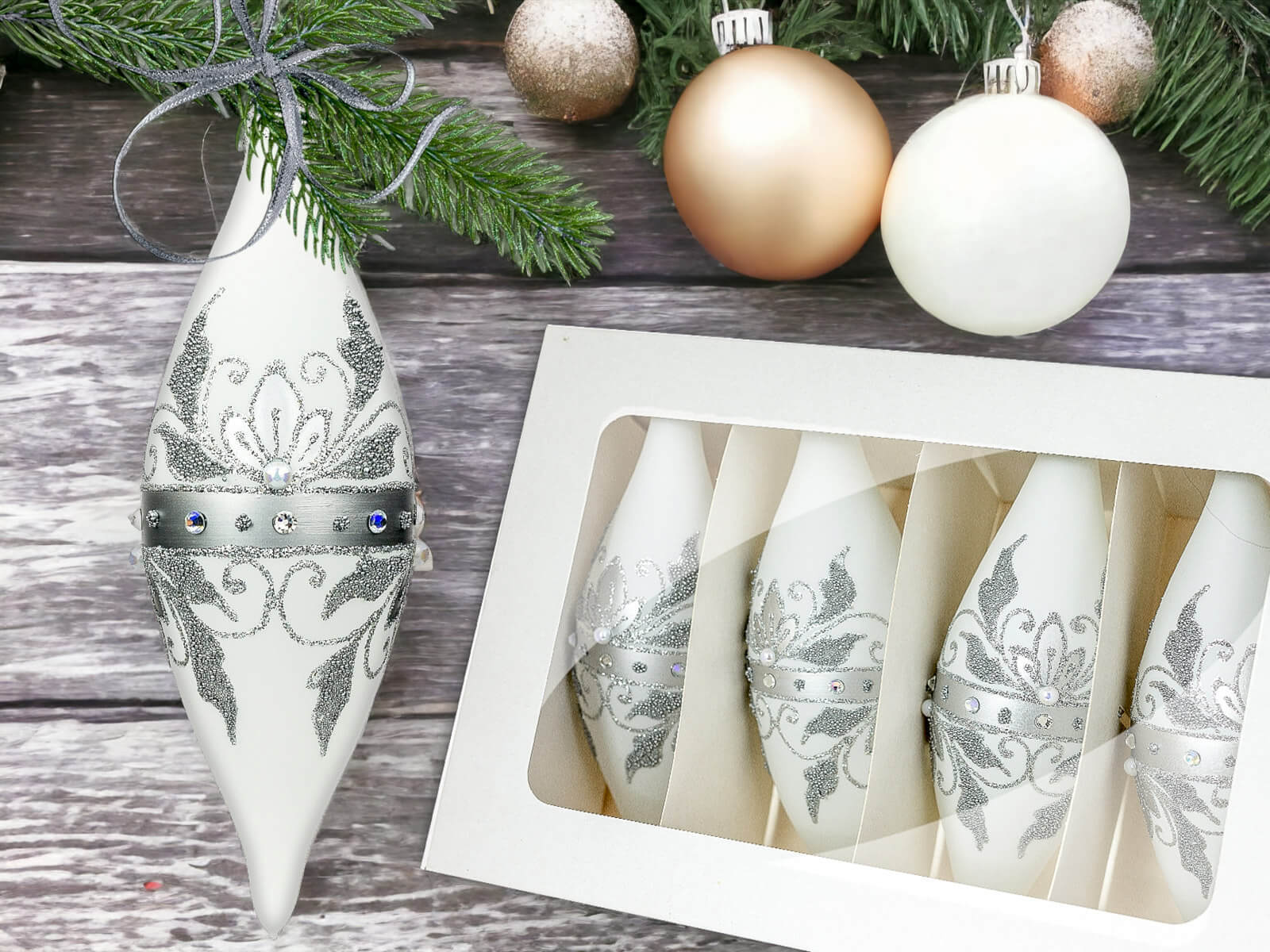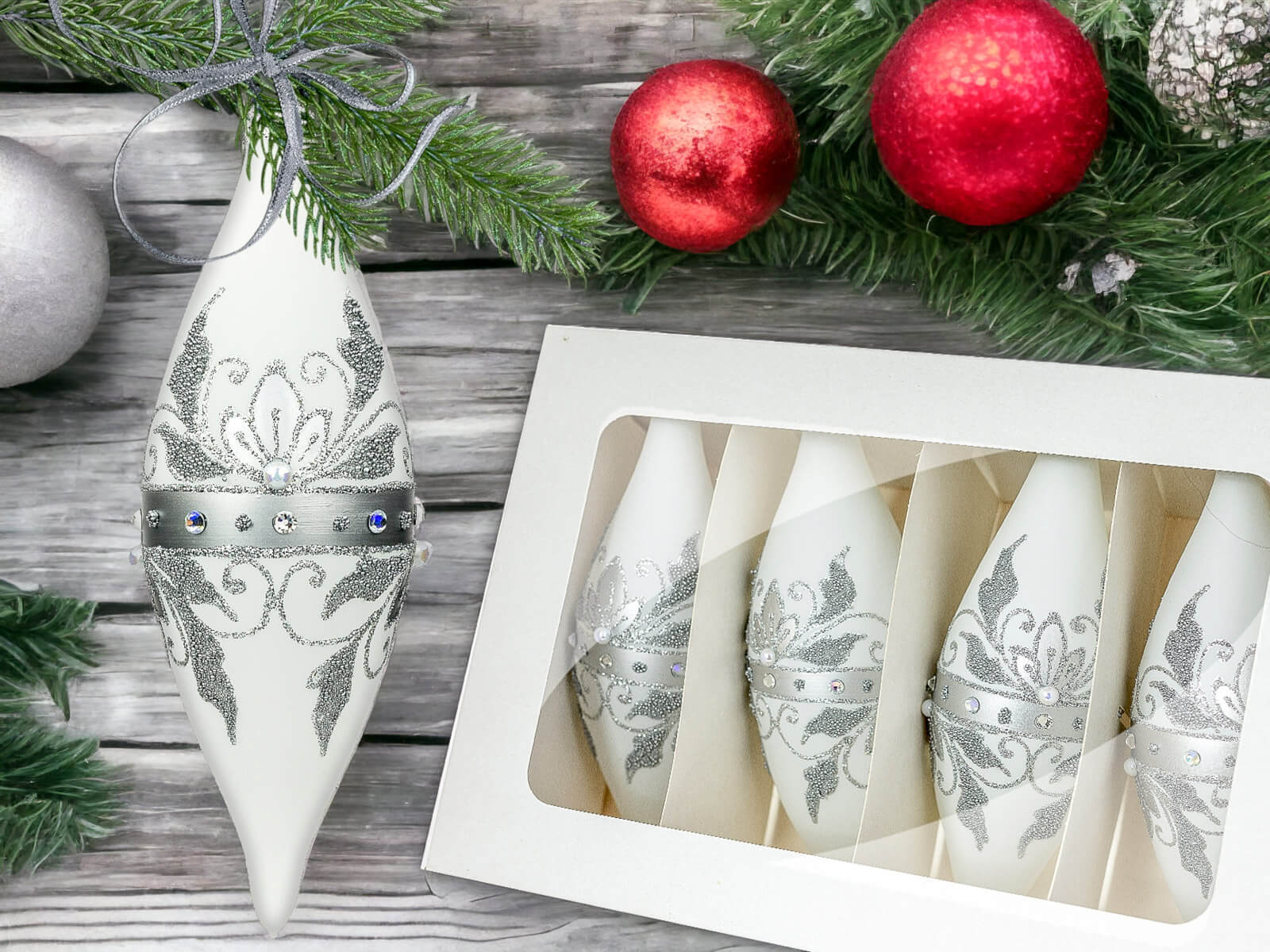 Komplet Szklanych Bombek Choinkowych - Sople Królewskie w Srebrnej Elegancji na Białej Kredzie to wyjątkowy zestaw szklanych bombek, które wprowadzą niepowtarzalny urok i elegancję do świątecznych dekoracji. Każda bombka jest dziełem ręcznej roboty, starannie malowana i ozdobiona bogatym srebrnym zdobieniem oraz lśniącymi szlifowanymi kamieniami, co nadaje im królewskiego blasku.