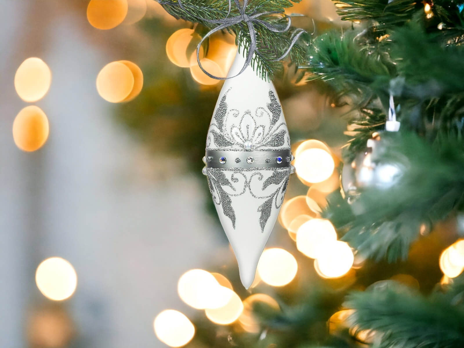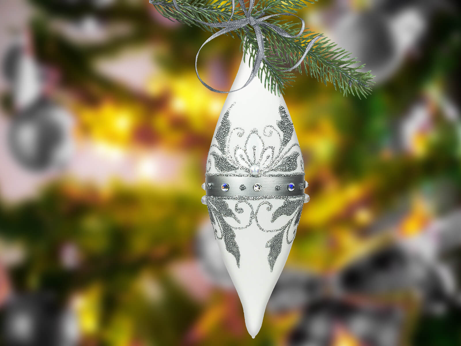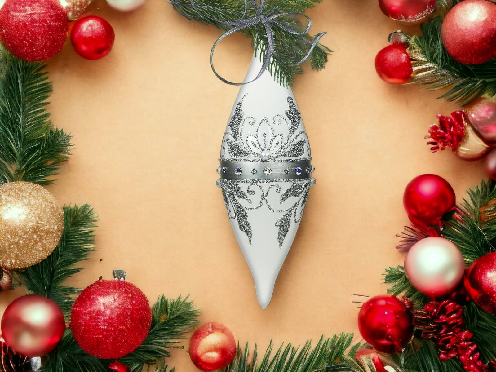 Komplet Szklanych Bombek Choinkowych - Sople Królewskie w Srebrnej Elegancji na Białej Kredzie to wyjątkowy zestaw szklanych bombek, które wprowadzą niepowtarzalny urok i elegancję do świątecznych dekoracji. Każda bombka jest dziełem ręcznej roboty, starannie malowana i ozdobiona bogatym srebrnym zdobieniem oraz lśniącymi szlifowanymi kamieniami, co nadaje im królewskiego blasku.