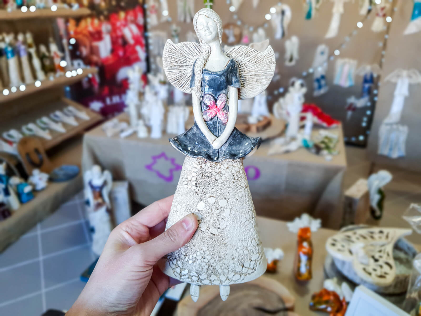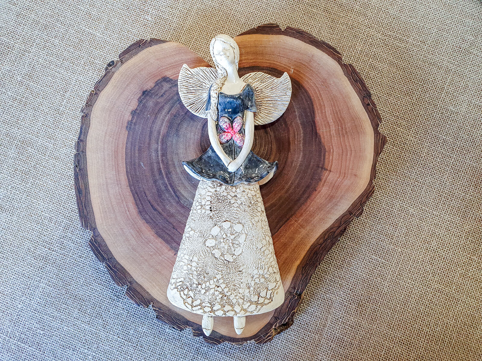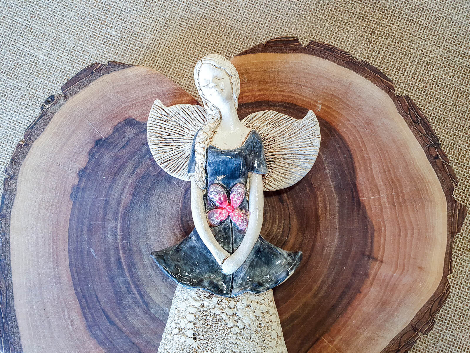Anioł Abigail to gipsowa figurka przedstawiająca dziewczynę ubraną w długą suknię w kolorze szarym. W dłoniach trzyma polny kwiat, który w połączeniu ze swobodnie opadającym na ramię warkoczem dodaje rzeźbie subtelności i lekkości. Podarowany bliskiej osobie w prezencie, wywoła dużo uśmiechu.