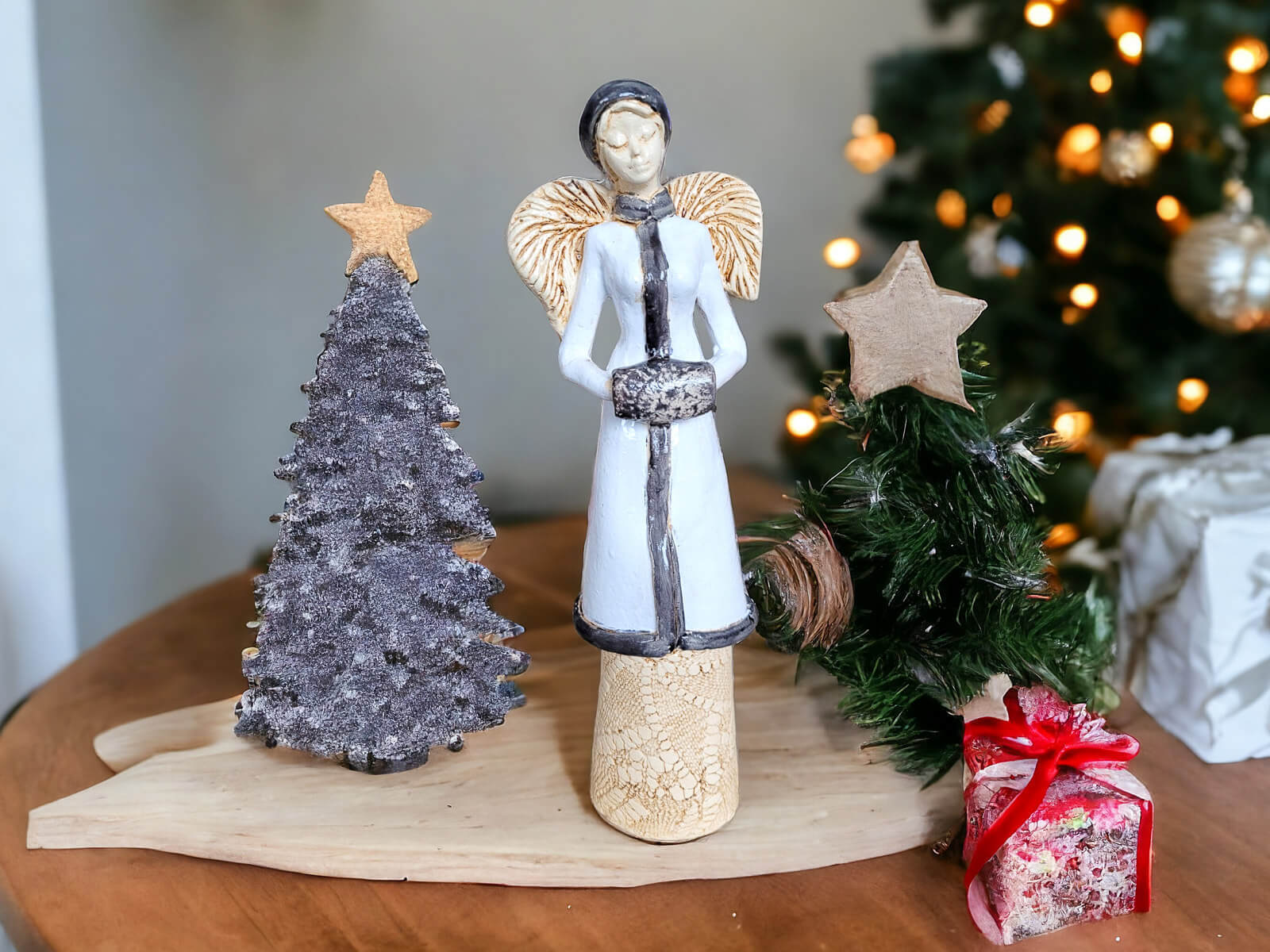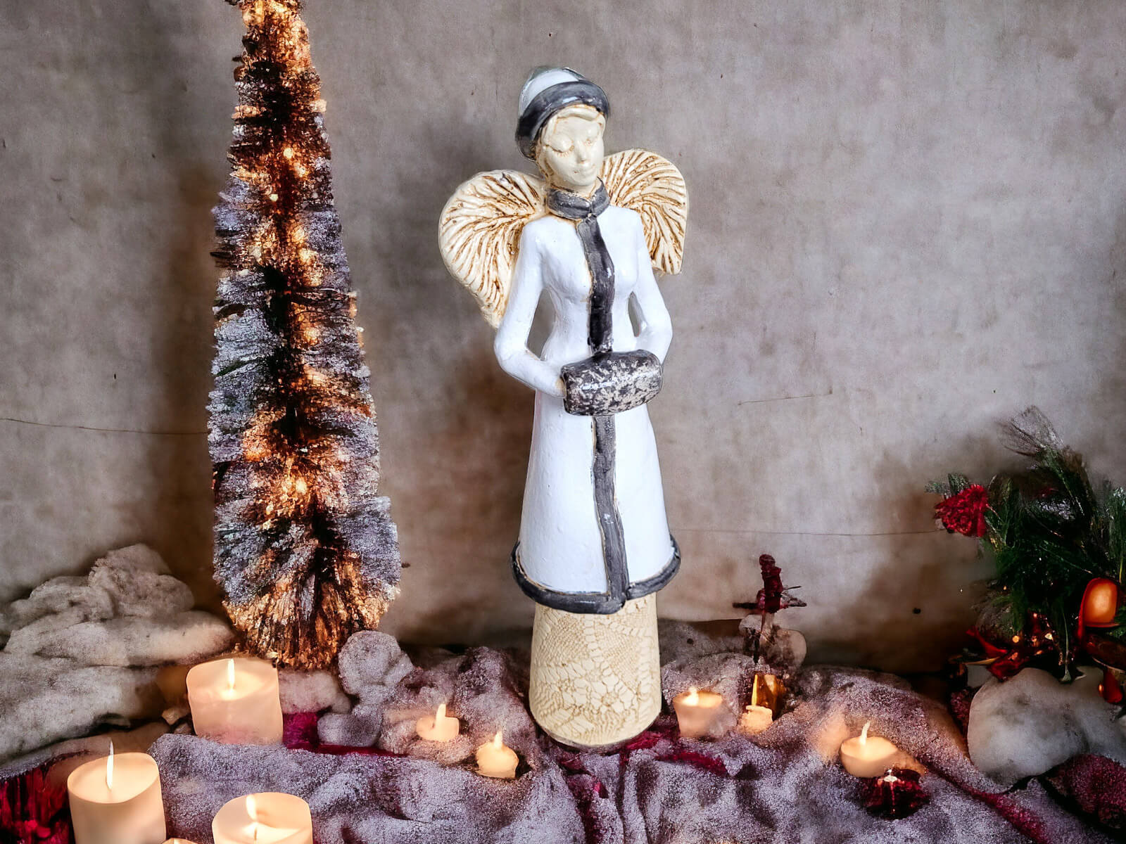Anioł Gia w białym zimowym płaszczu z szarymi lub brązowymi dodatkami z kolekcji Art. Gia jest elegancką damą, prezentującą swój wdzięk i włoski styl. Fascynuje się wszystkim co włoskie. W ten zimowy wieczór wybiera się na spotkanie. Na głowie ma elegancki beret. Chętnie służy radą rodzinie i bliskim. Posiada wielu adoratorów. Nie ma żadnych autorytetów, ponieważ sama chce nim pozostać. Idealna jako prezent dla kobiet. Świetnie sprawdzi się jako dekoracja w każdym wnętrzu.
