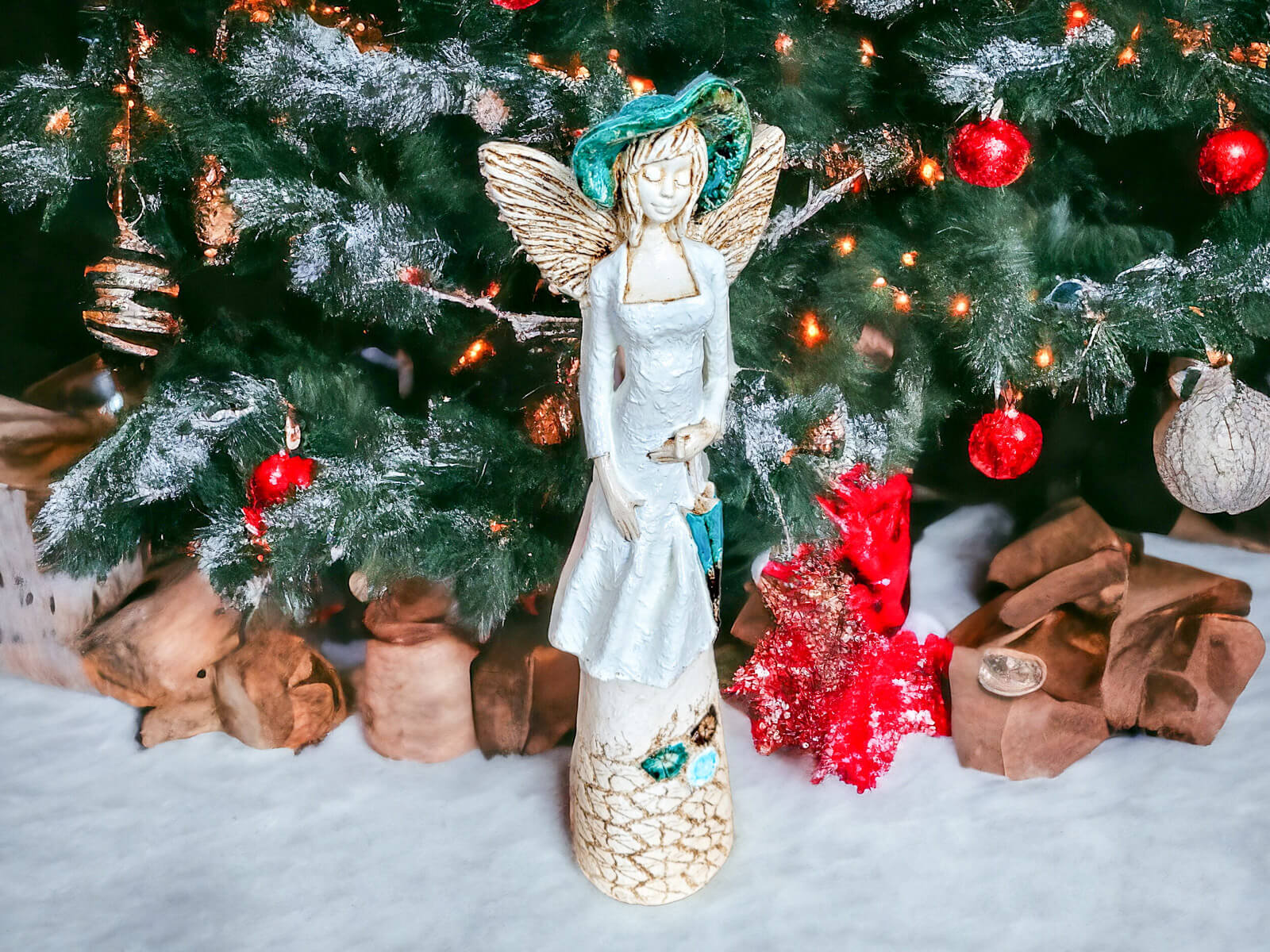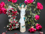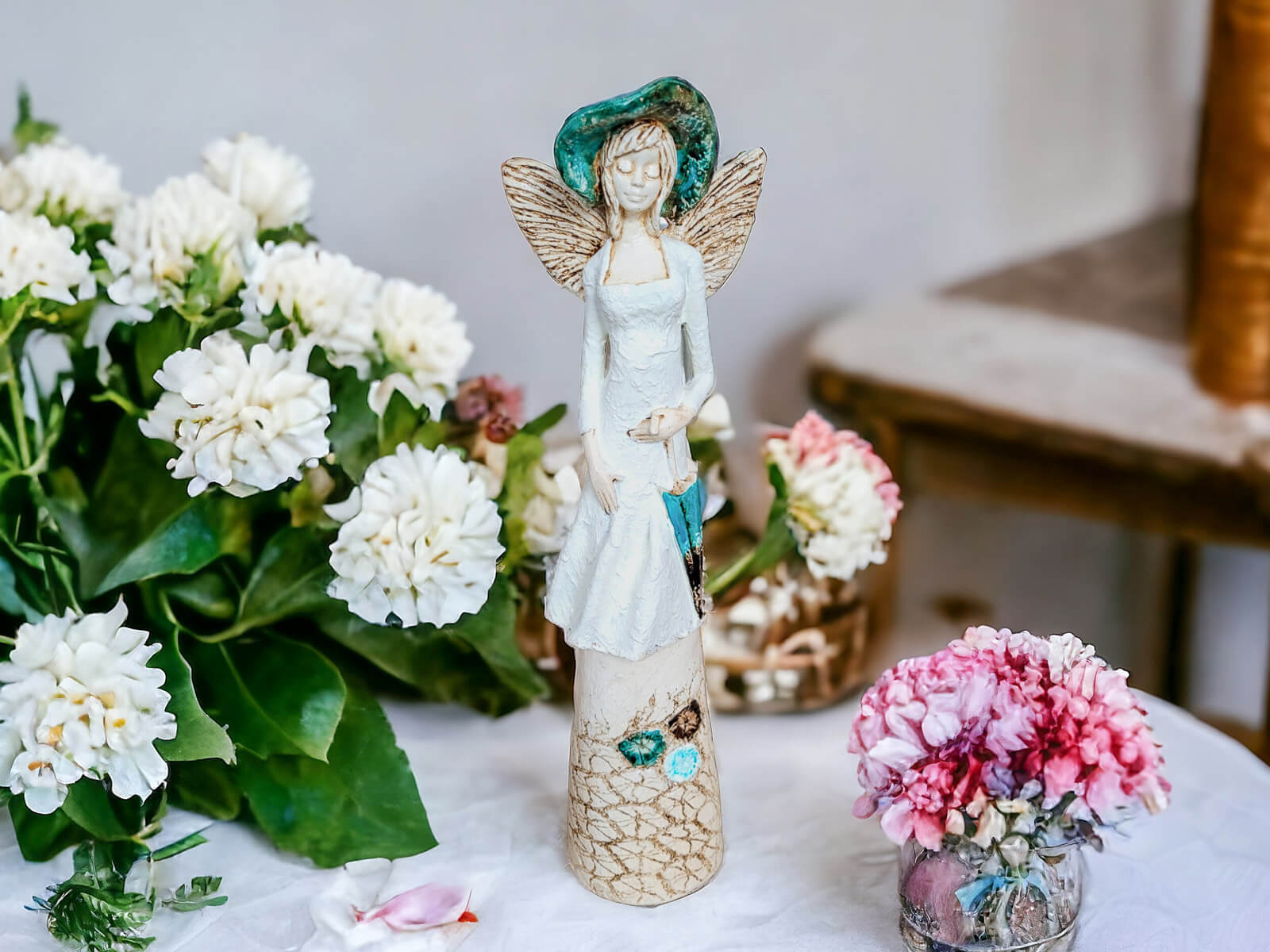 Anioł Olivia w białej sukni to dekoracja stojąca, ręcznie wykonana z gipsu. Prezentuje kobietę w białej sukience z kapeluszem na głowie. Ma krótkie, jasne włosy, a w lewej dłoni trzyma beżowy parasol. Z tyłu wystają małe skrzydła w kształcie liści. Figurka pięknie wyglądałaby w stylowym wnętrzu, jak i na zewnątrz w ogrodzie. Idealnie nadaje się na prezent dla osoby, która lubi oryginalność.