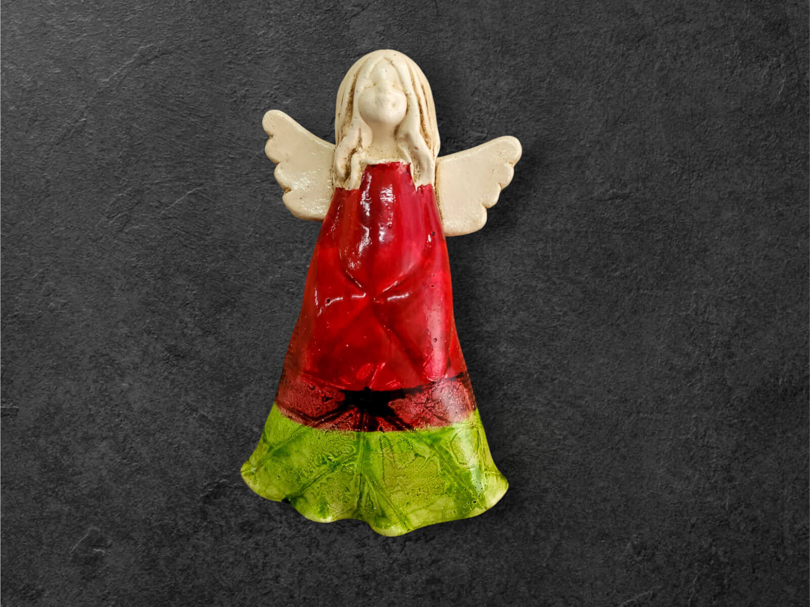Zielony Anioł Monica z kolekcji Art to ręcznie wykonana figurka do zawieszenia na ścianę. Monica to śliczna i młoda dziewczynka pełna ciepła i czułości. Anieliczka jest ubrana w zwiewną, zieloną sukienkę z wzorem prawdziwego liścia. Figurka idealnie sprawdzi się jako prezent urodzinowy dla dziewczynki. Świetnie wkomponuje się w klasyczne jaki i nowoczesne wnętrze.