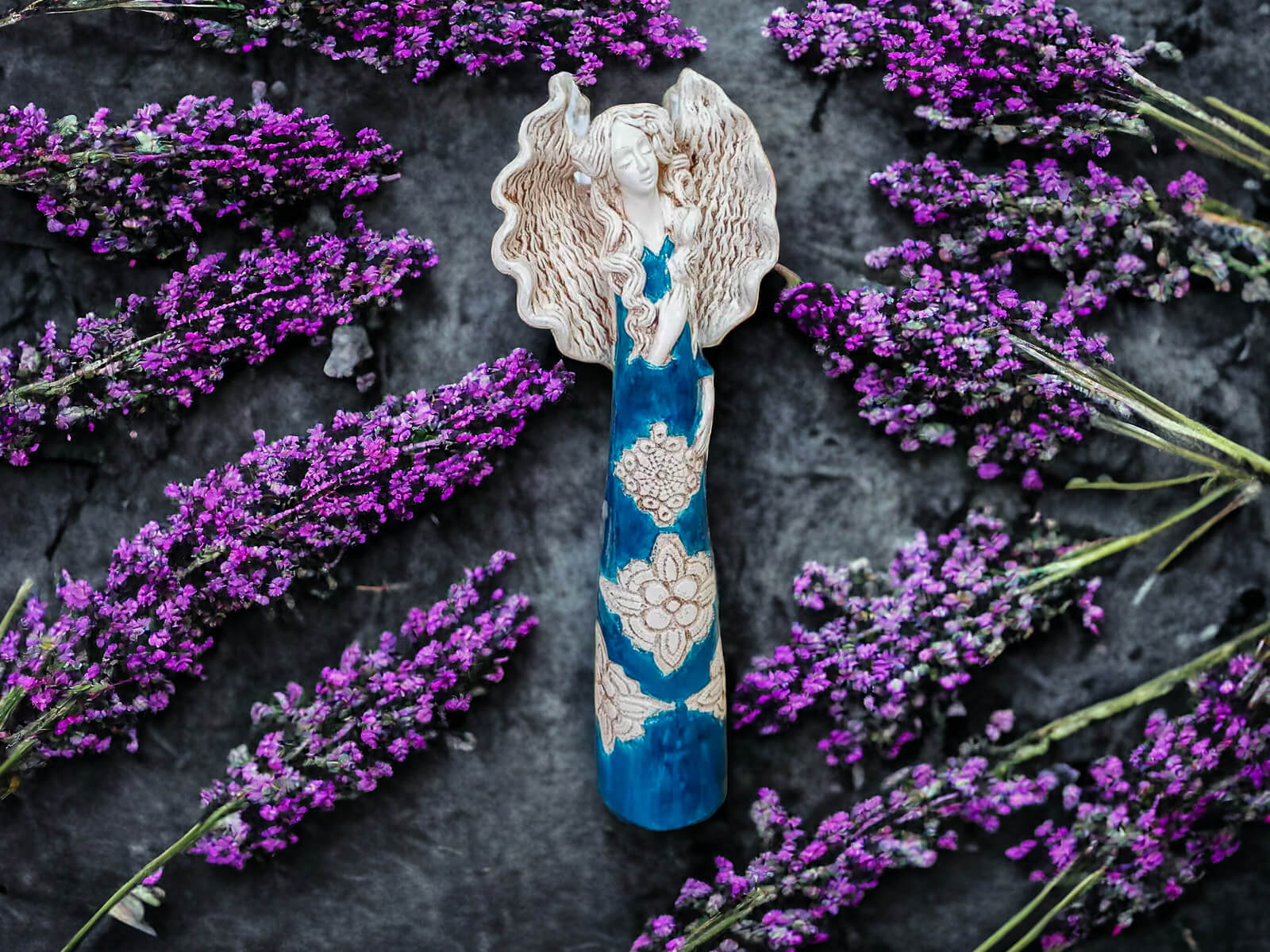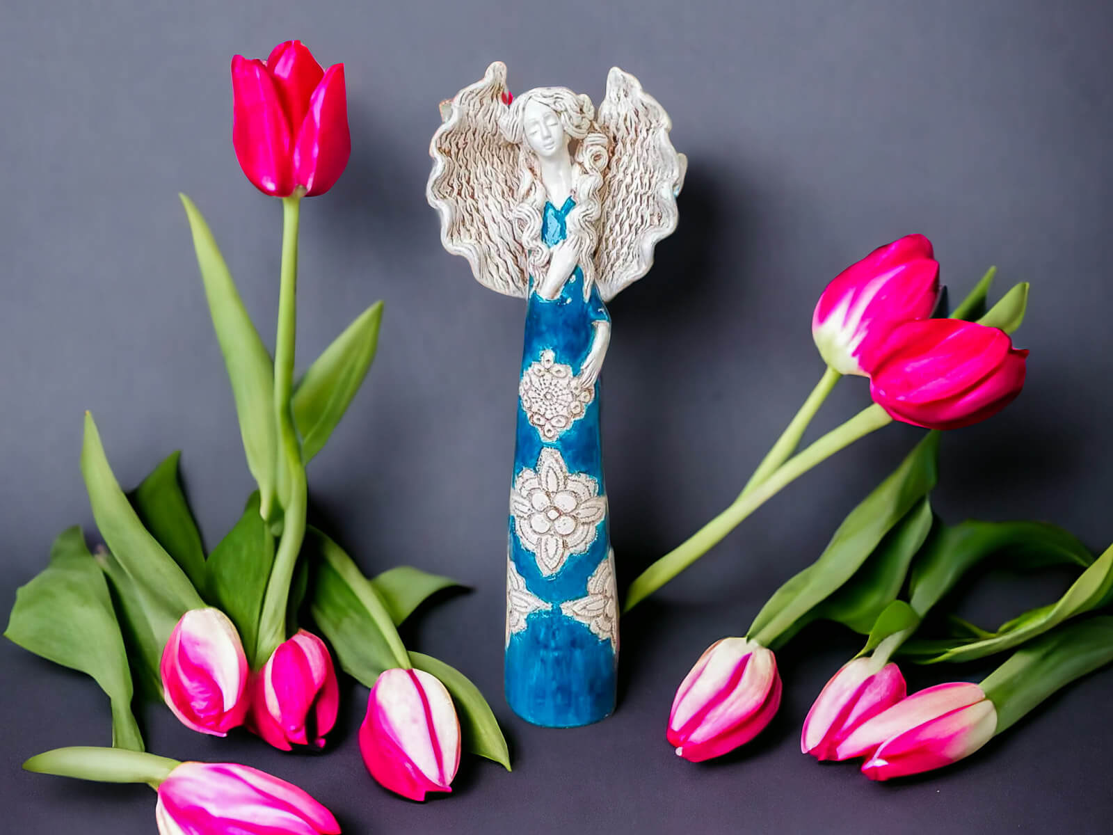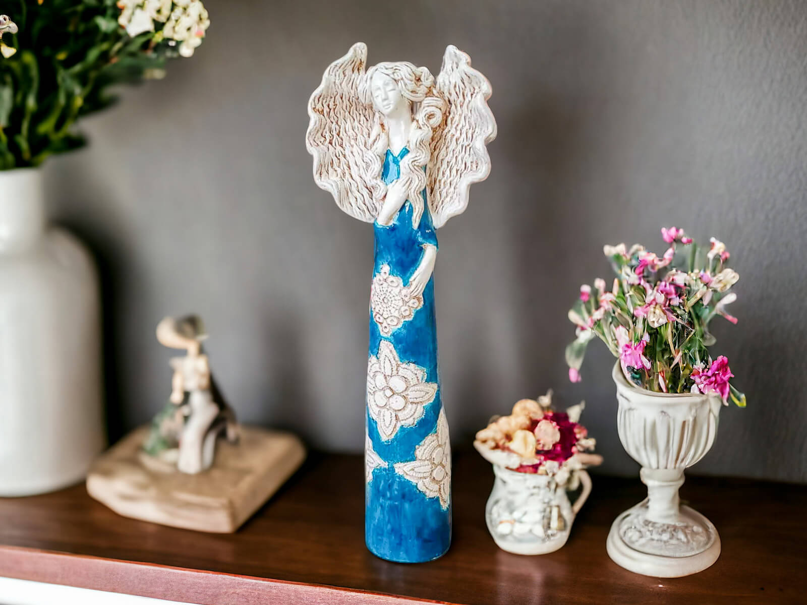 Anioł Madelyn przedstawia kobietę z długimi kręconymi włosami w turkusowej sukni. Ma duże skrzydła skierowane ku górze oraz prawą dłoń na piersi. Jest figurką stojącą, wykonaną ręcznie z gipsu. Nadaje się na ozdobę do ogrodu jak i wnętrz. Może służyć jako prezent na Dzień Kobiet, Walentynki, a także na Dzień Mamy i Babci.