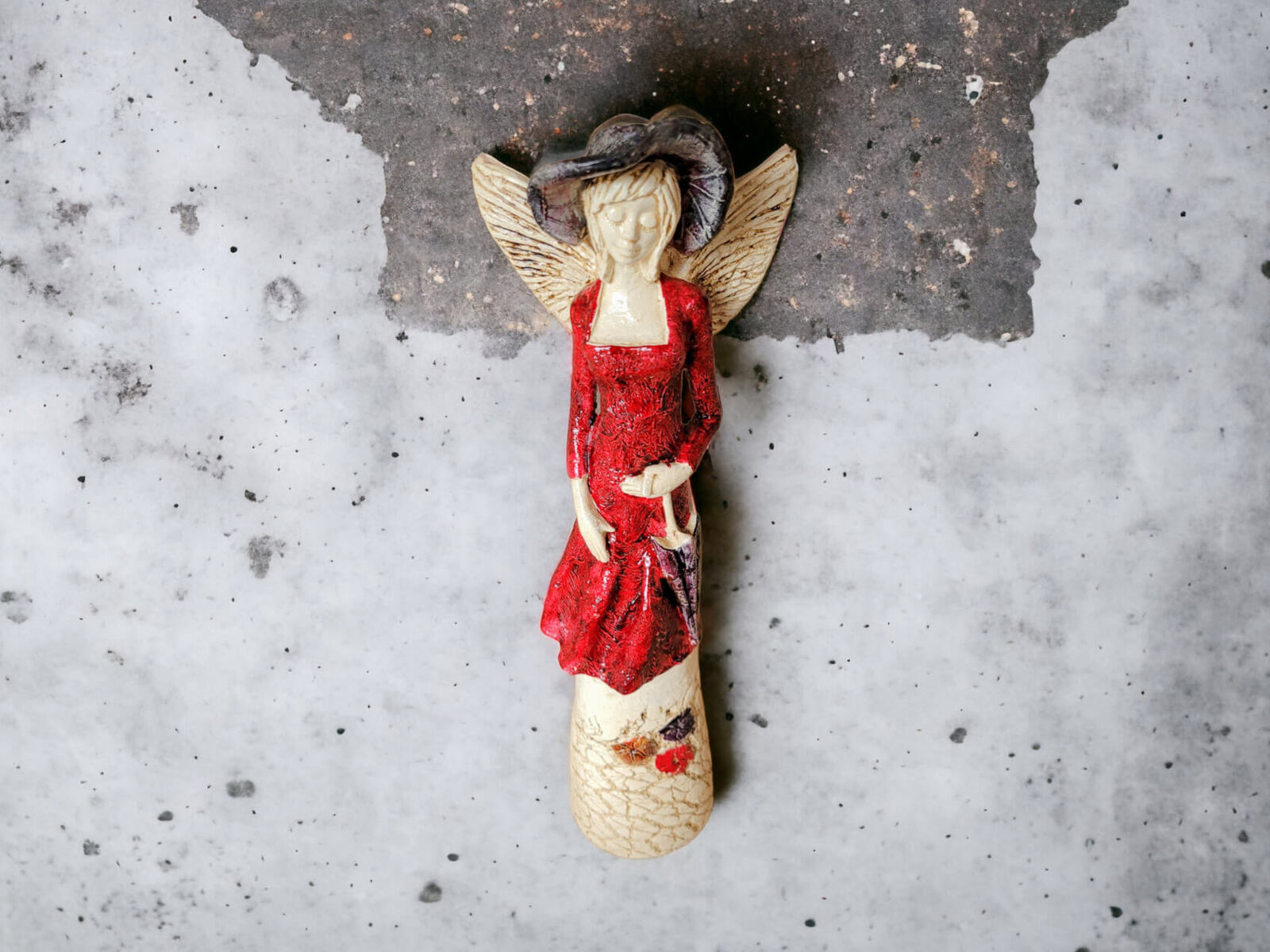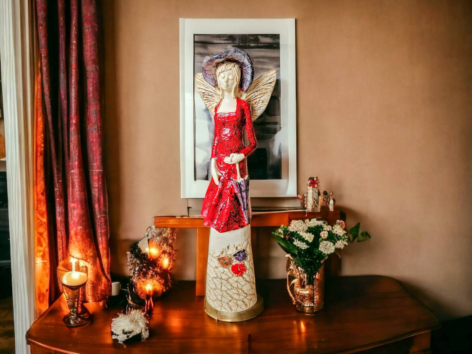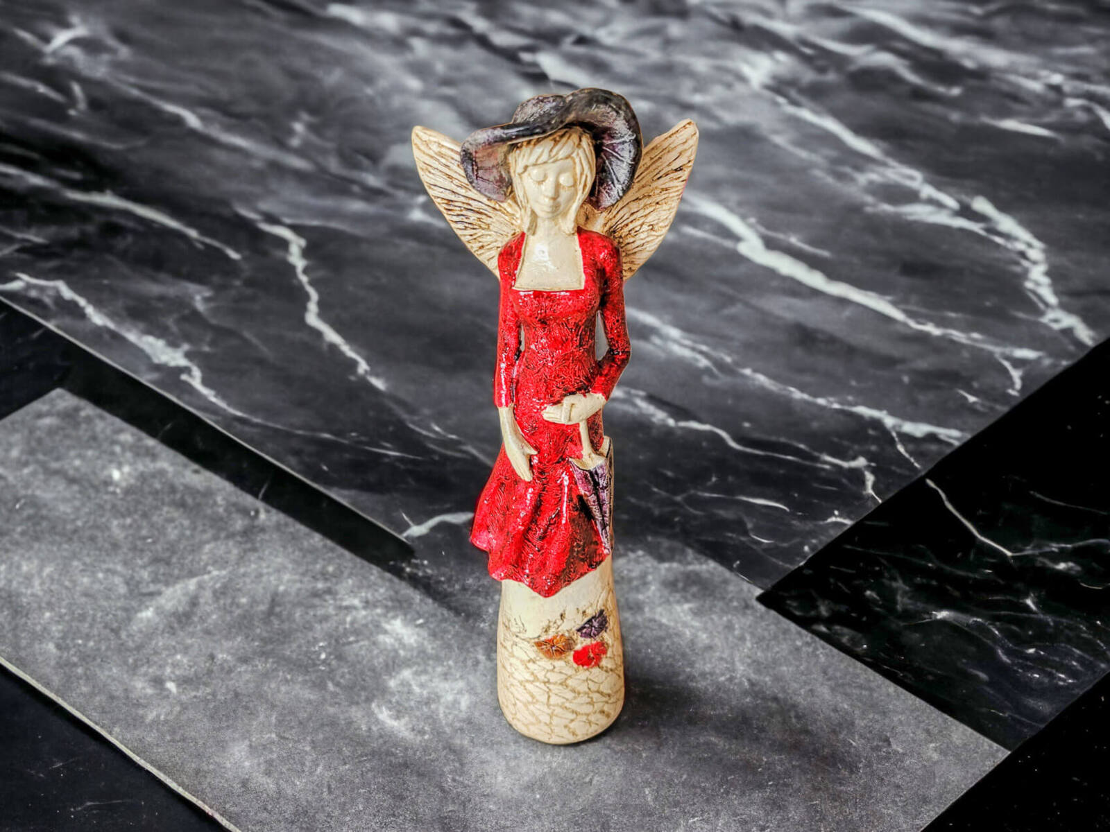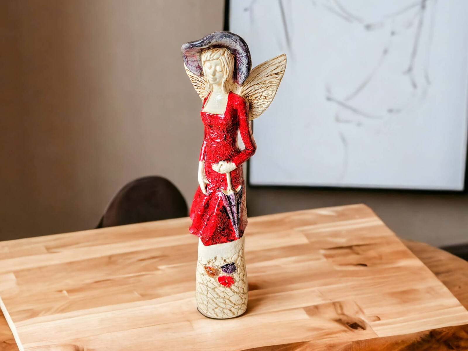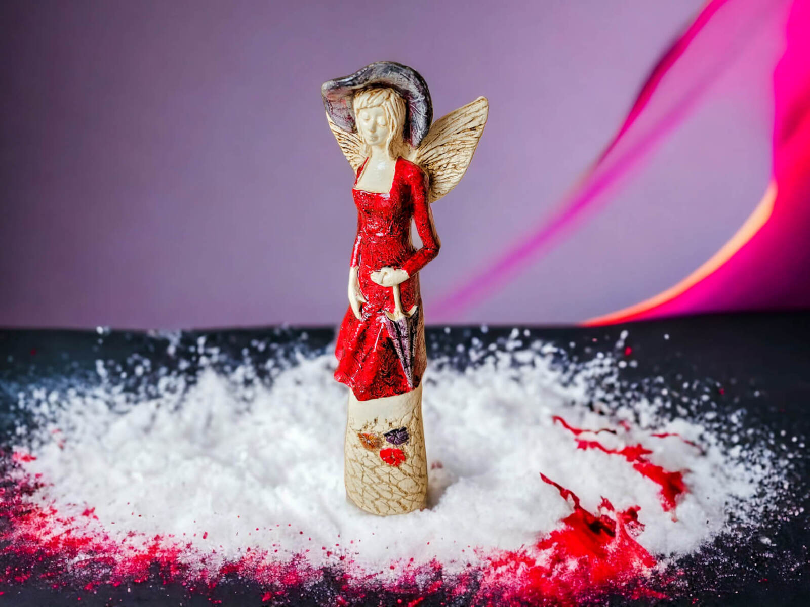 Anioł Olivia w burgundowej sukni to dekoracja stojąca, ręcznie wykonana z gipsu. Anioł ma krótkie, jasne włosy, a w lewej dłoni trzyma parasol. Z tyłu wystają małe skrzydła. Figurka pięknie zaprezentuje sie w stylowym wnętrzu np. w salonie. Idealnie nadaje się na prezent dla osoby, która lubi oryginalność.