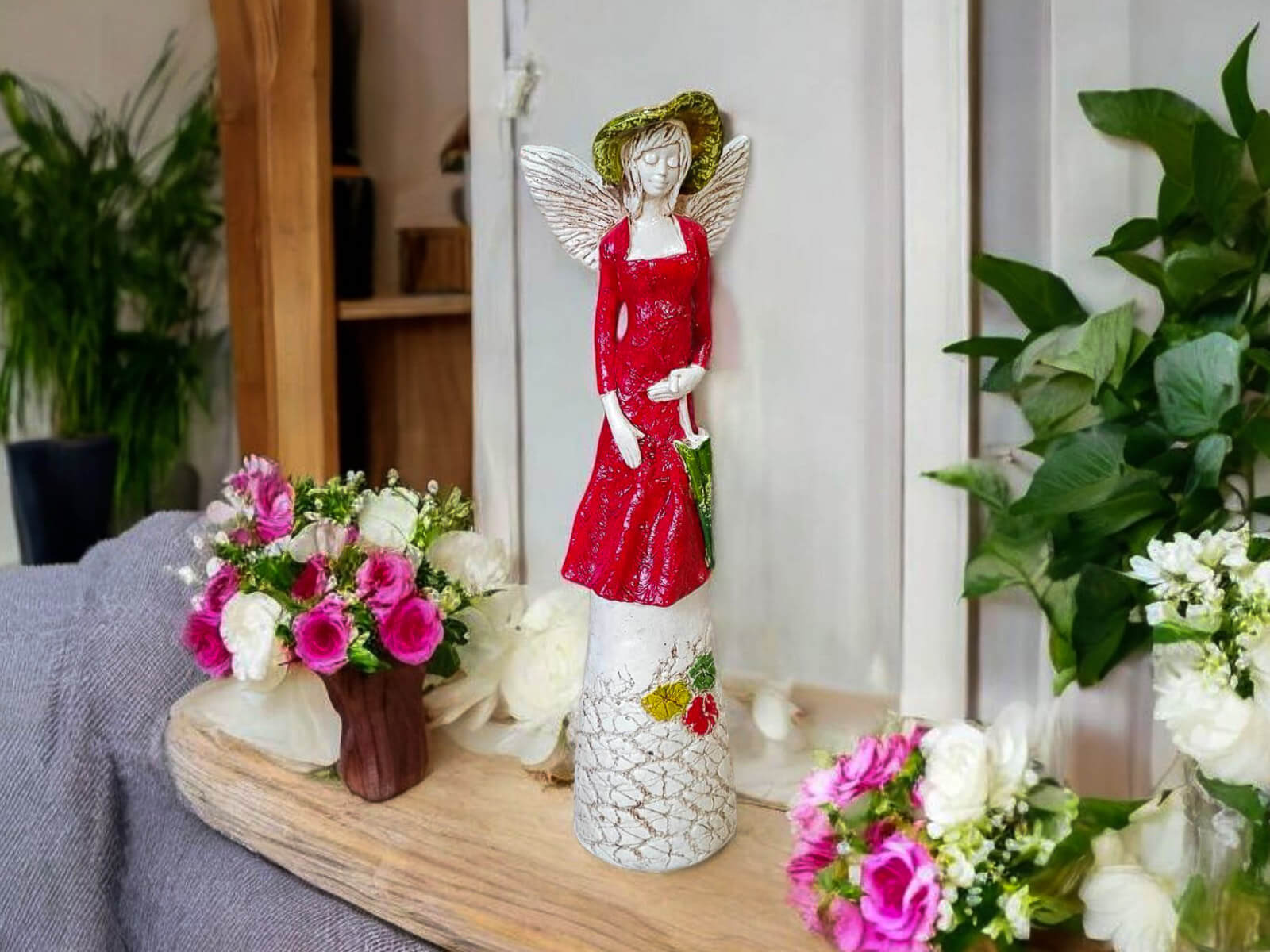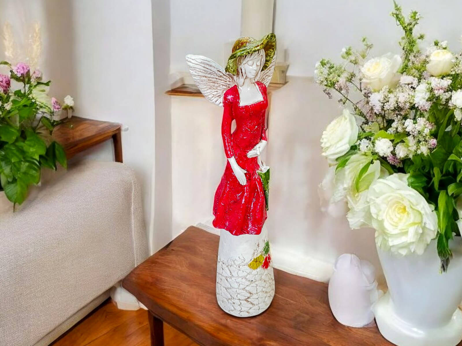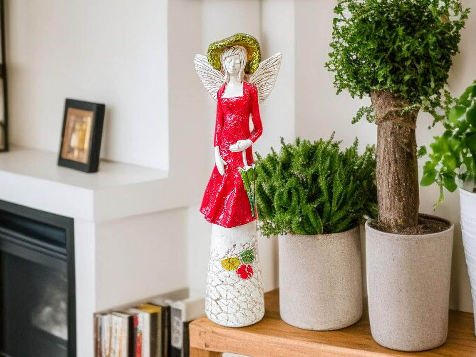 Anioł Olivia w czerwonej sukni to dekoracja stojąca, ręcznie wykonana z gipsu. Anioł ma krótkie, jasne włosy, a w lewej dłoni trzyma parasol. Z tyłu wystają małe skrzydła. Figurka pięknie zaprezentuje się w każdym wnętrzu. Idealnie nadaje się na prezent dla osoby, która lubi unikalne prezenty.