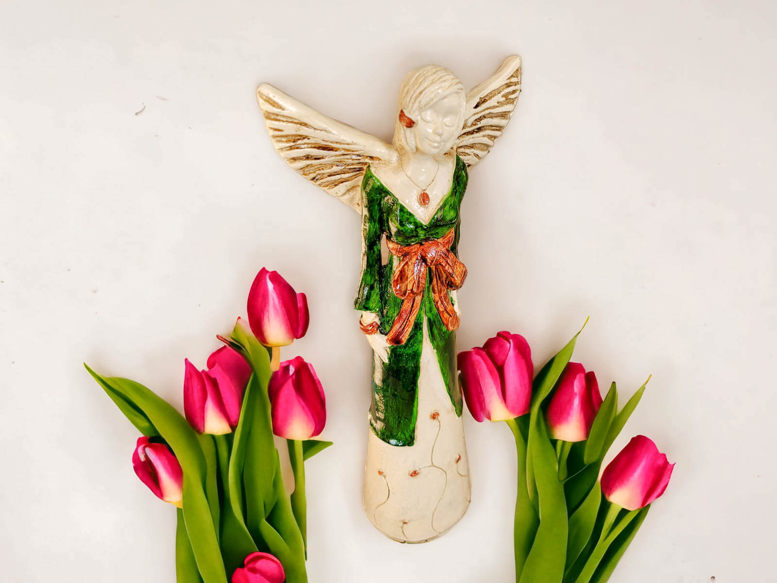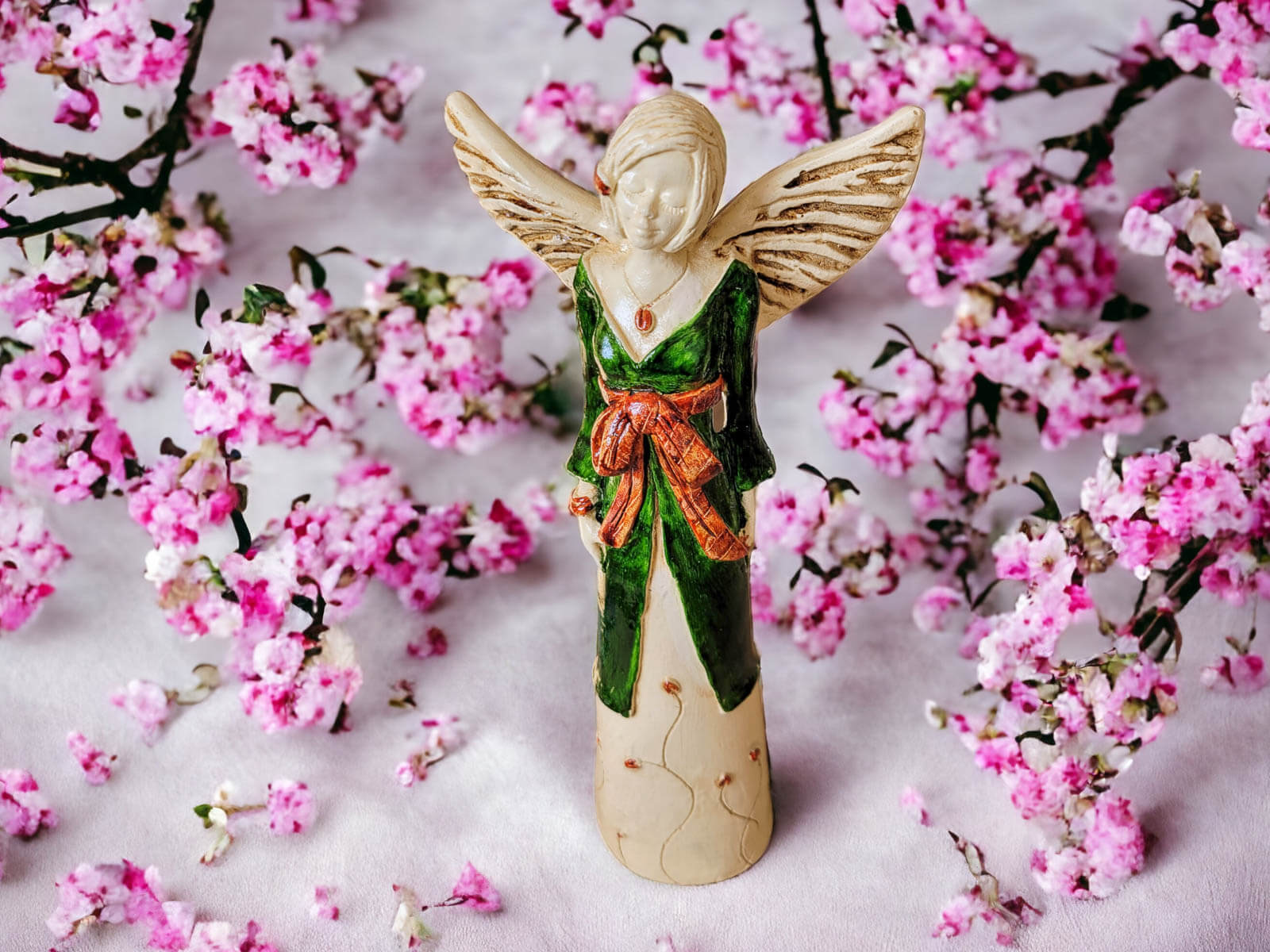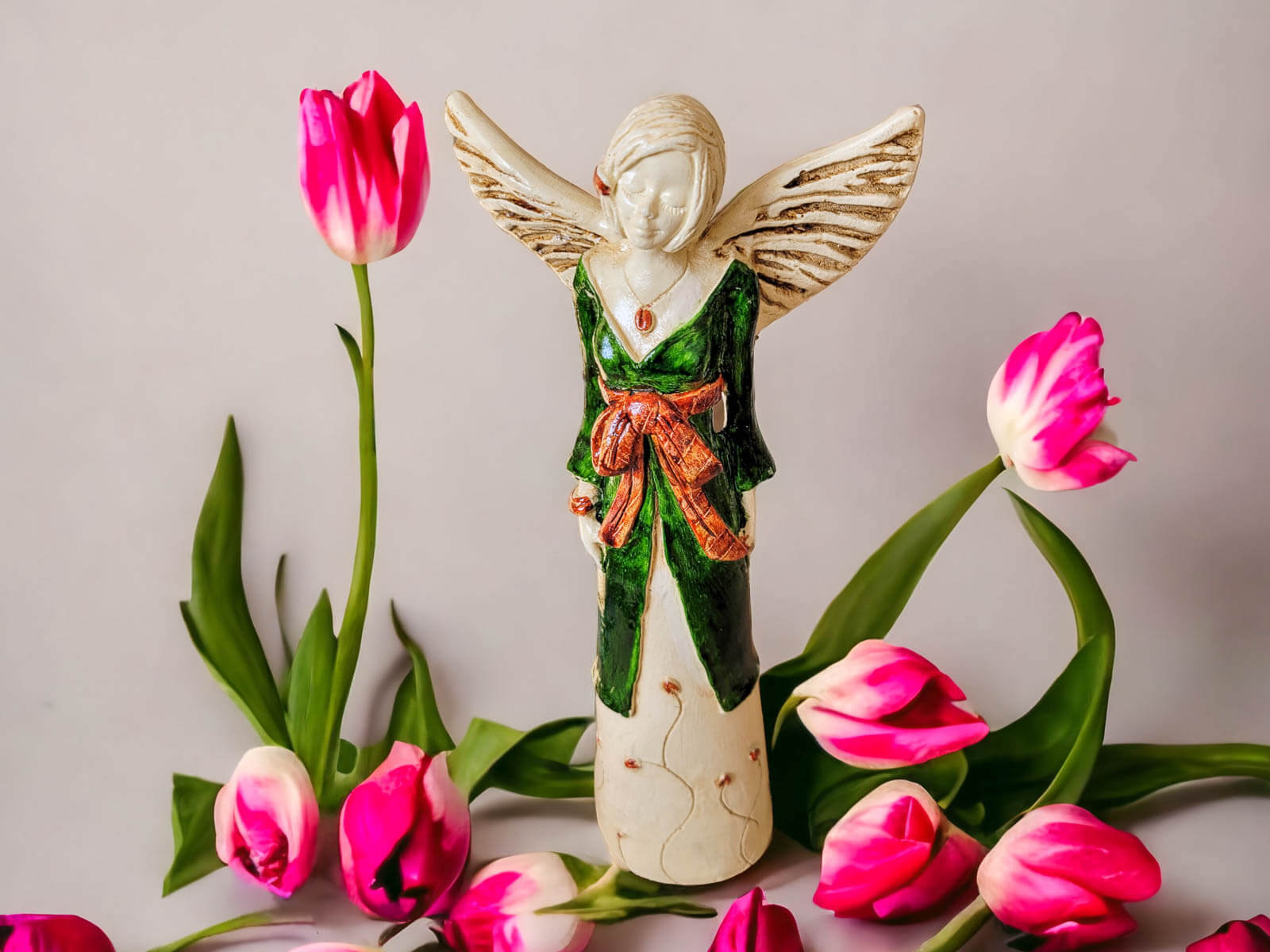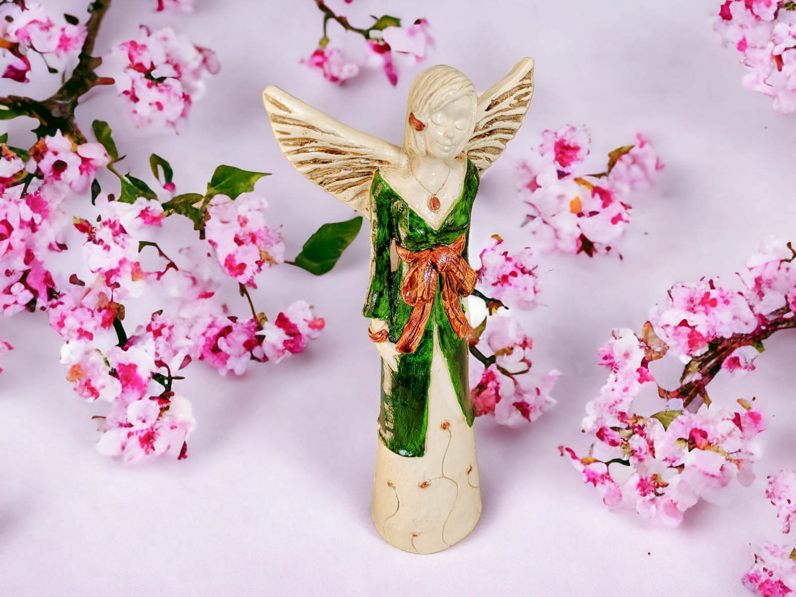 Anioł Lily w zielonej sukni. Lily kocha przyrodę. Uwielbia spędzać czas pośród kwiatów i drzew, ciesząc się nieskazitelnie czystym powietrzem i wsłuchując w śpiew ptaków. Może właśnie dlatego, że utożsamia się z naturą, po jej sukni pną się kwiaty, a pióra jej skrzydeł lekko rozwiewa wiatr. Na szyi ma talizman, więc figurka może stać się Twoim talizmanem - Lily będzie dbała o Twój wewnętrzny spokój i harmonię ducha.