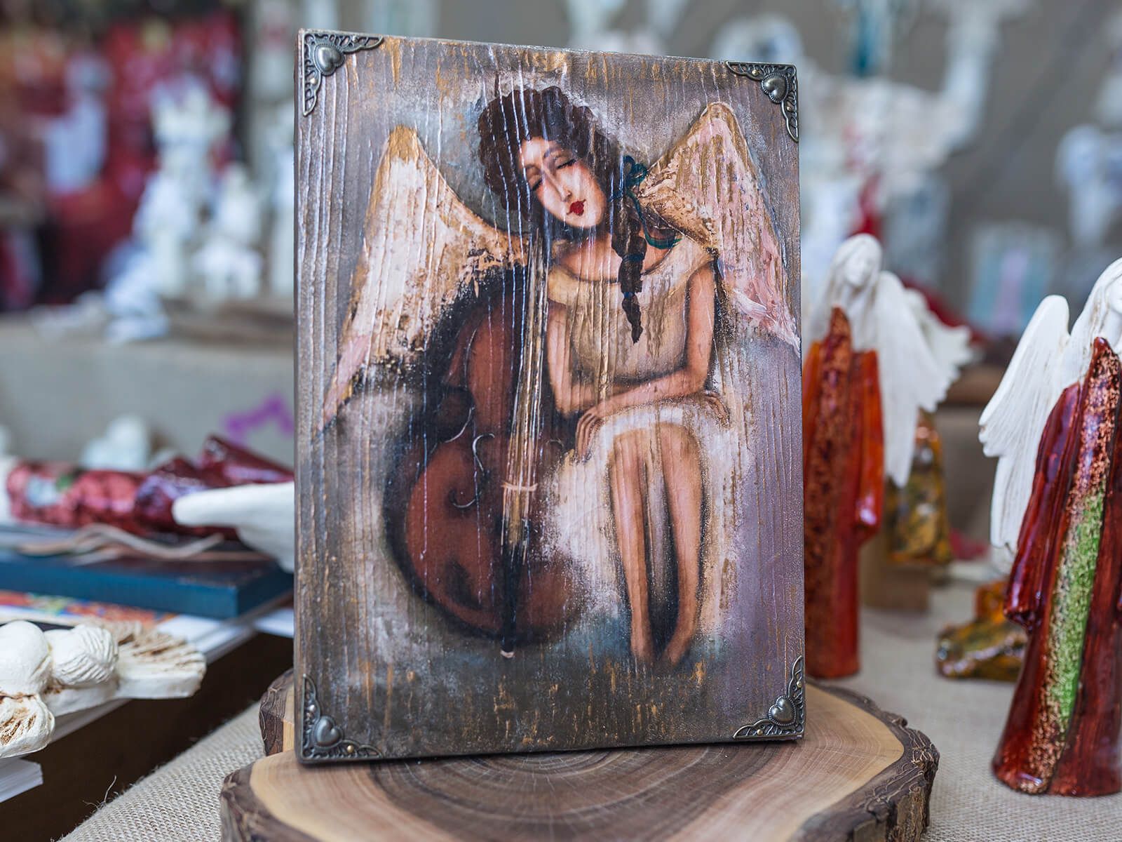 Intrygujący obraz anioła o imieniu Wiolina z wiolonczelą. Obraz wykonany na desce w rozmiarze 22.5 x 29.5 cm z klamrami w rogach. Idealny na prezent.