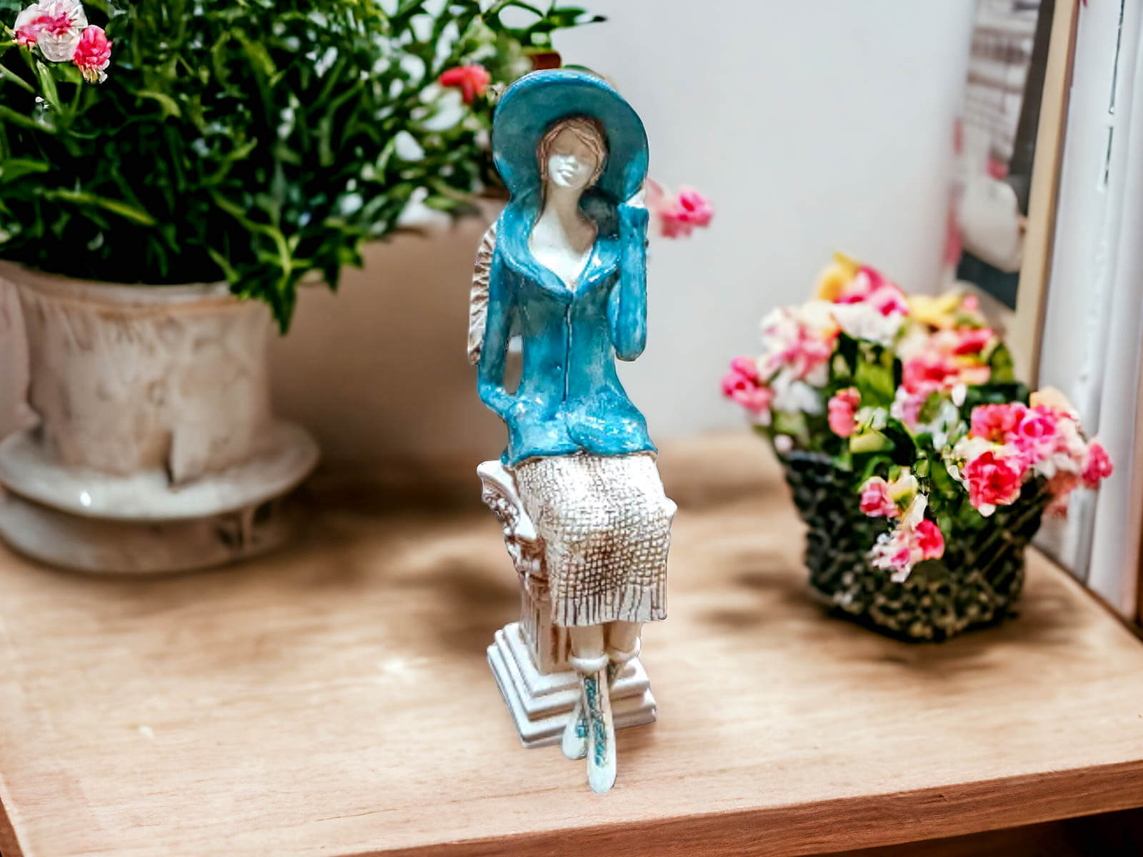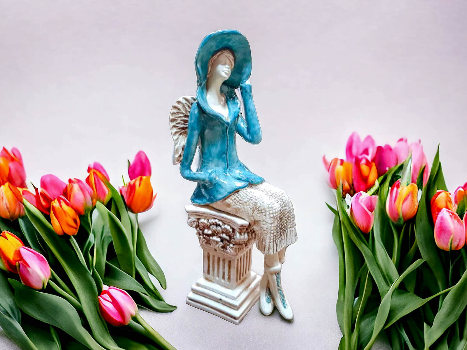 Aniołek Megan to urocza figurka przedstawiająca siedzącą kobietę, której elegancki strój i delikatne detale zachwycają precyzją wykonania. Megan ubrana jest w turkusowy żakiet i pasujący kapelusz, a także beżową spódnicę z motywem sweterkowym. Jej krótkie, jasne włosy oraz małe skrzydła skierowane w dół dodają jej subtelnego uroku. Lewą ręką przytrzymuje kapelusz, a prawą trzyma w pasie, co nadaje figurce naturalności i gracji.