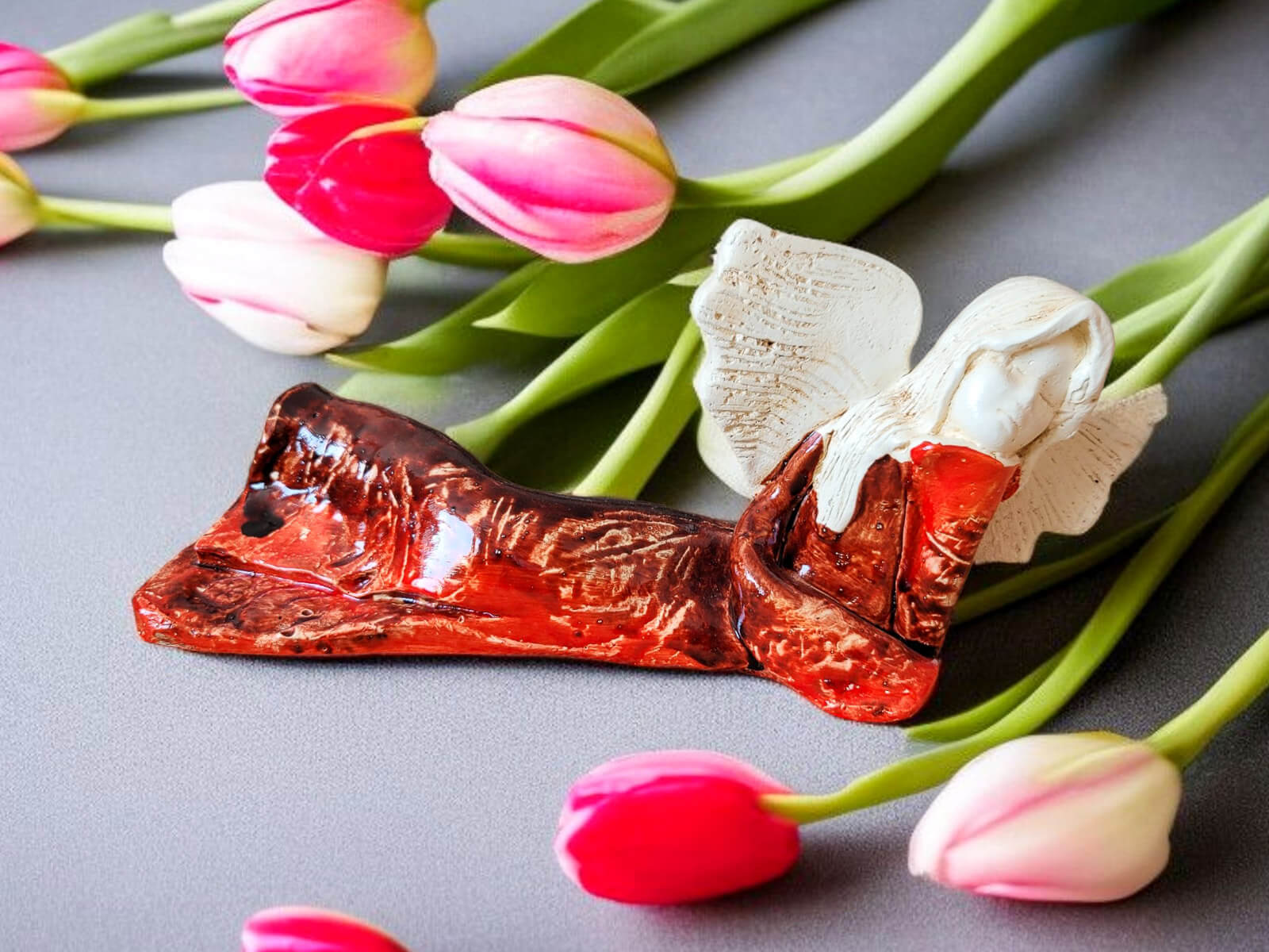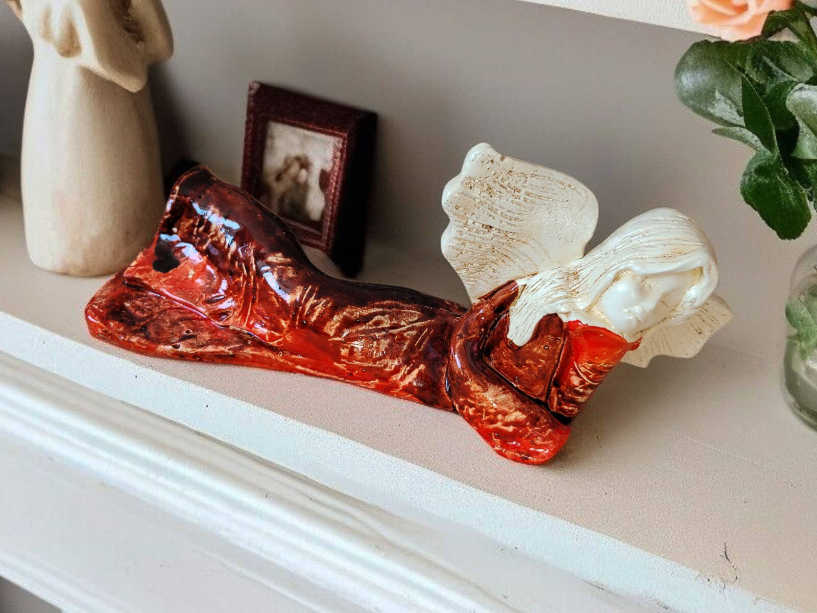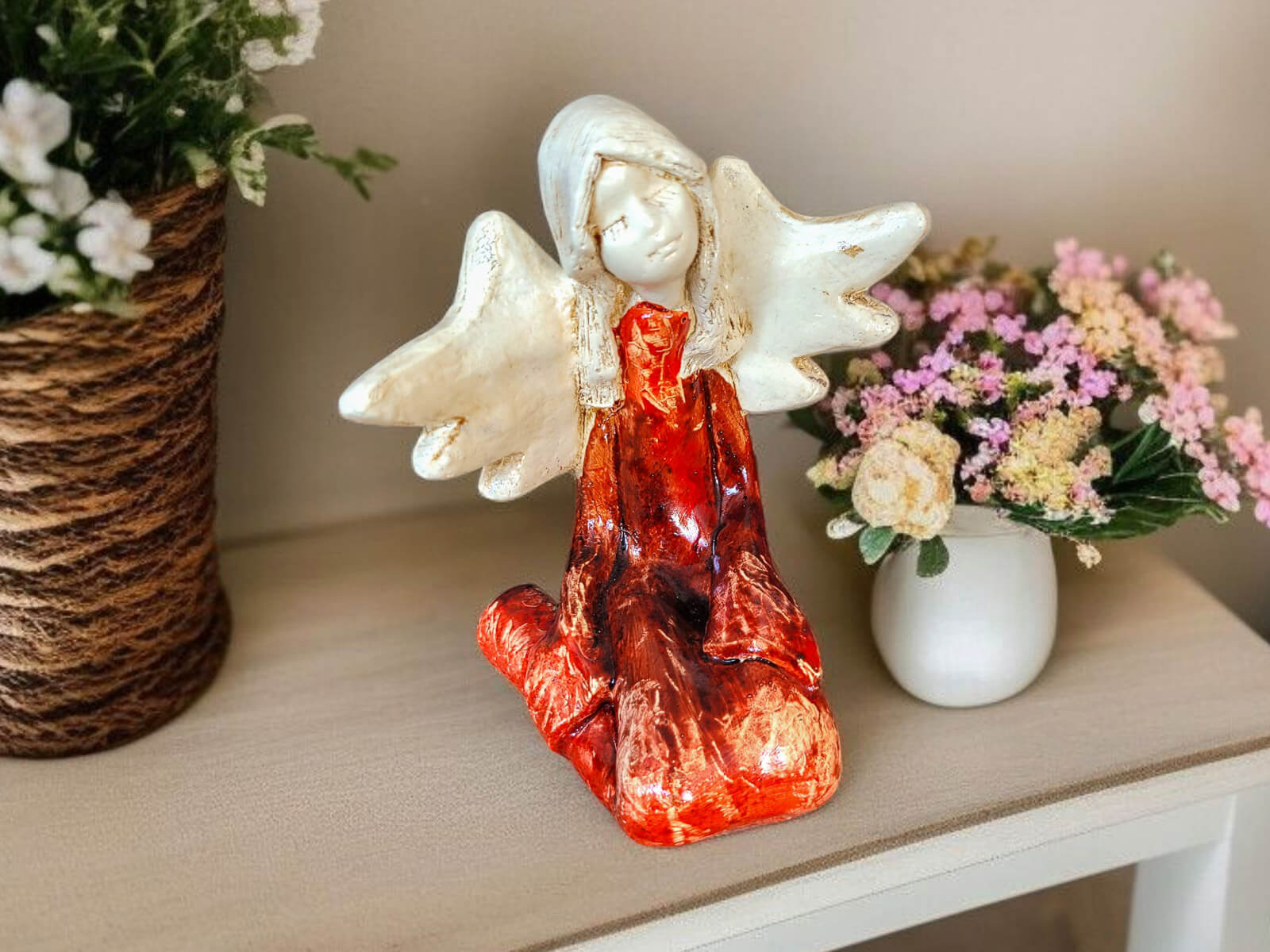 Kontrast jasnych skrzydeł i włosów z głębokim brązem sukni wprowadza do wnętrza harmonię i subtelność. To nie tylko dekoracja – to źródło codziennej radości i wyciszenia.