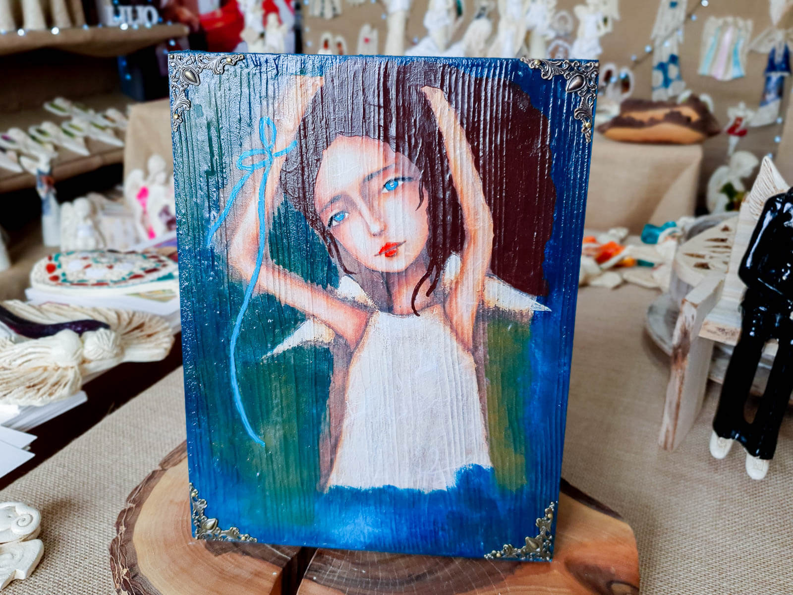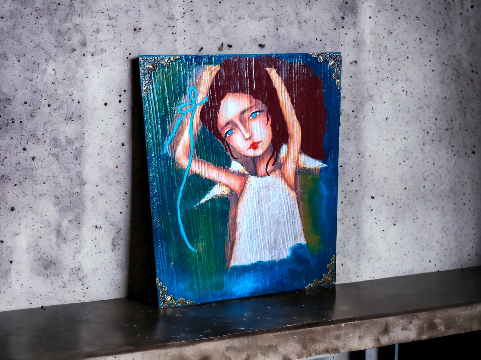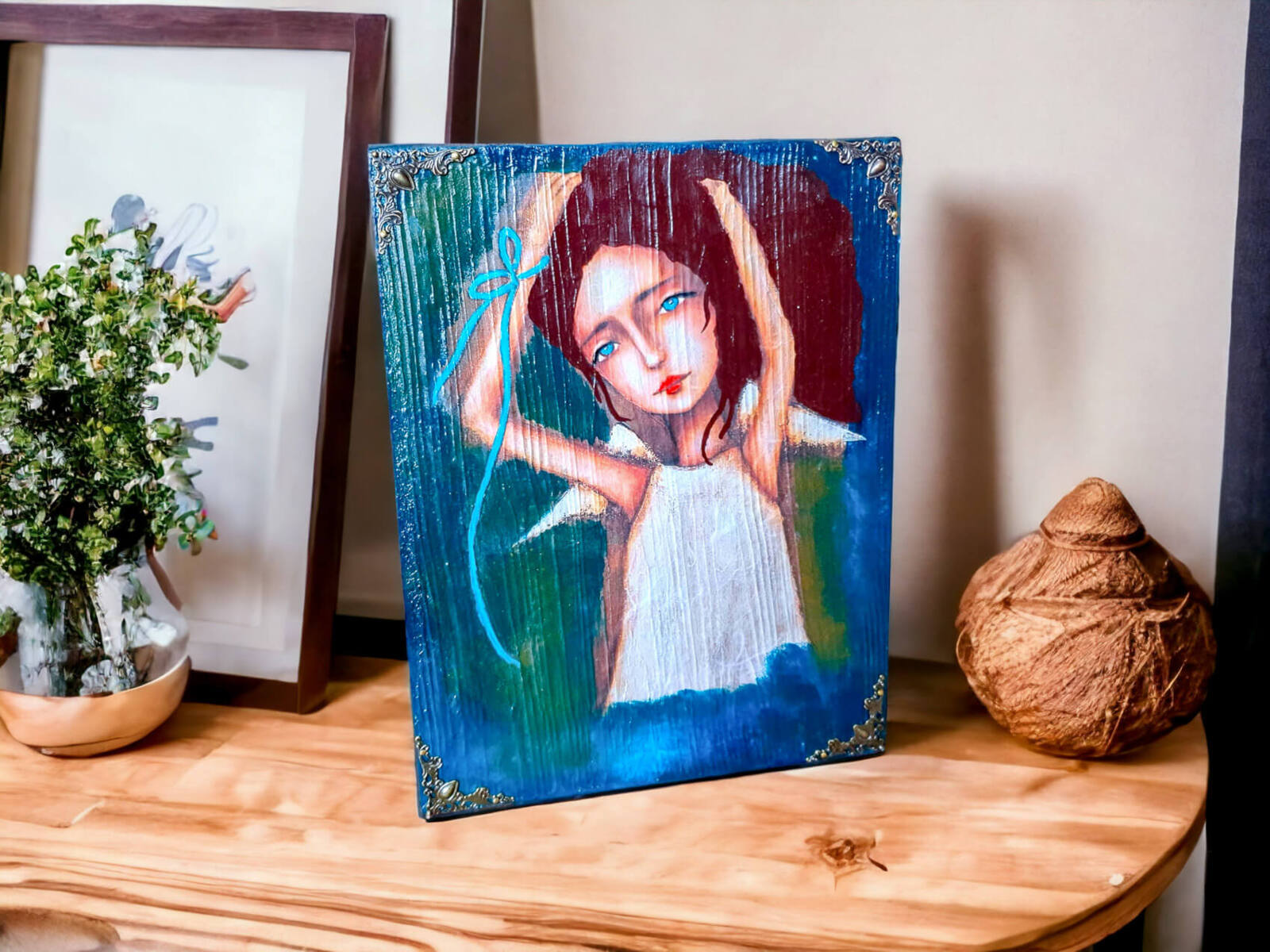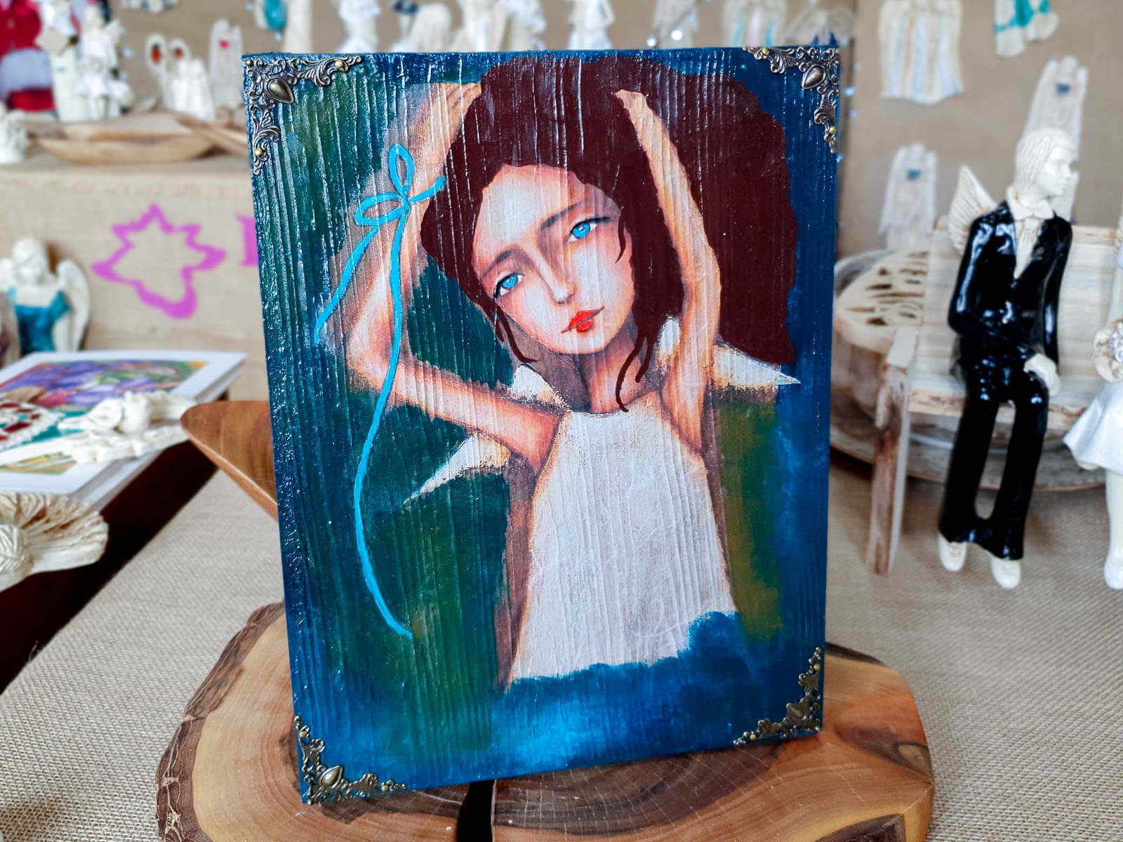 Obraz anioła o imieniu Tulina "Oh My God". Obraz wykonany na desce w rozmiarze 22.5 x 29.5 cm z klamrami w rogach. Idealny na prezent.